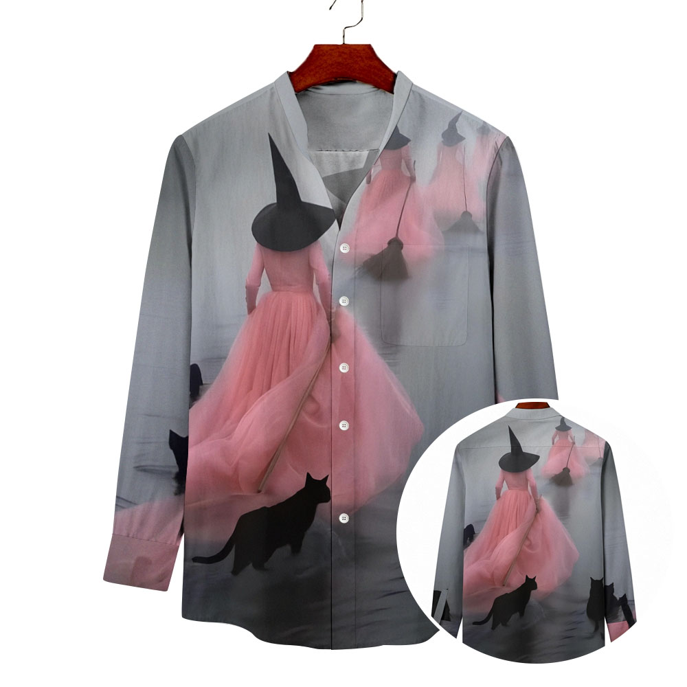 Unisex Fit Vintage Witch Halloween Prints Long Sleeves Stand-Up Collar Shirt (With Pockets)