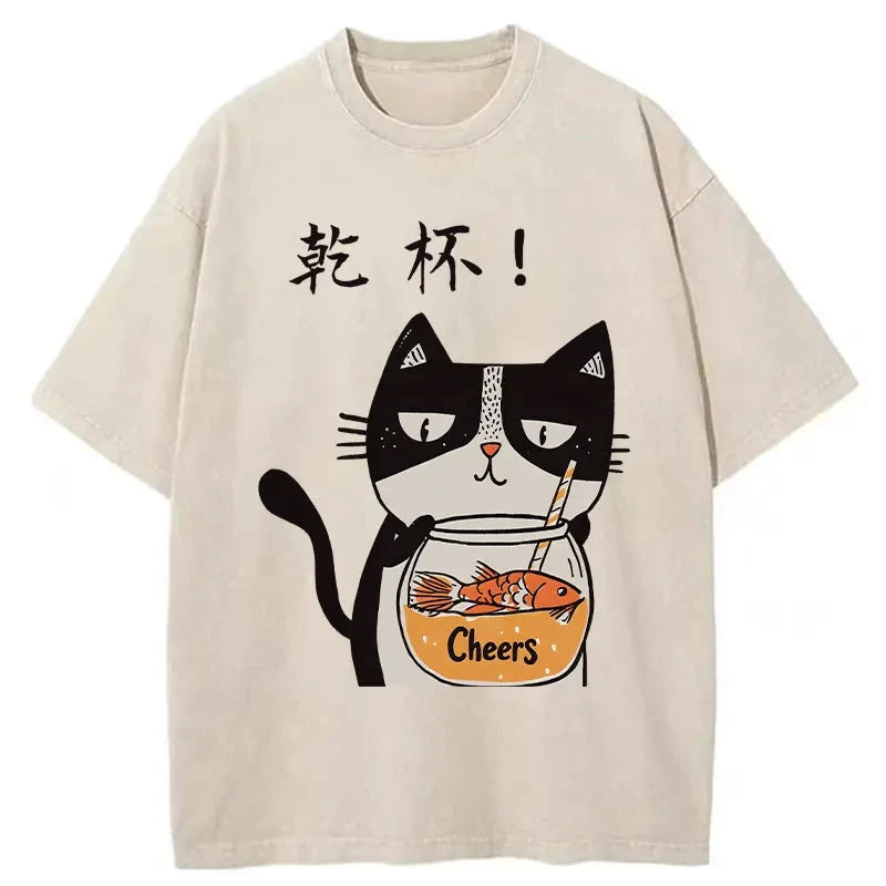 Drinking Tea Cat Washed Vintage Short Sleeves T-Shirt