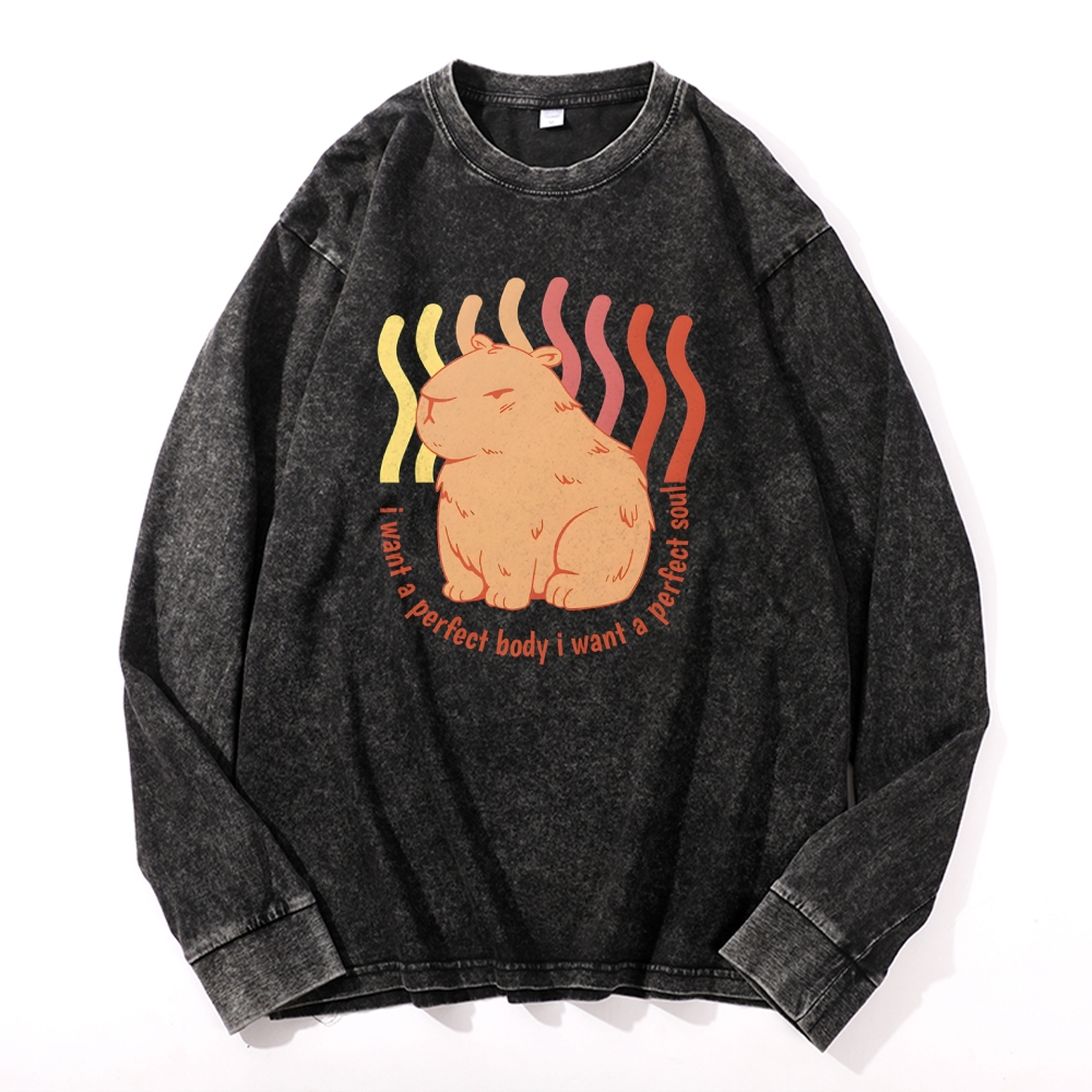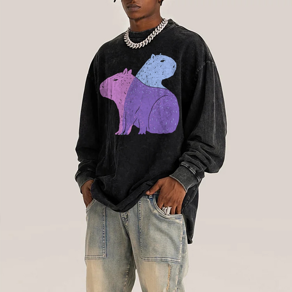 Capybara Casual Deep Washed Vintage Long Sleeves T-Shirt