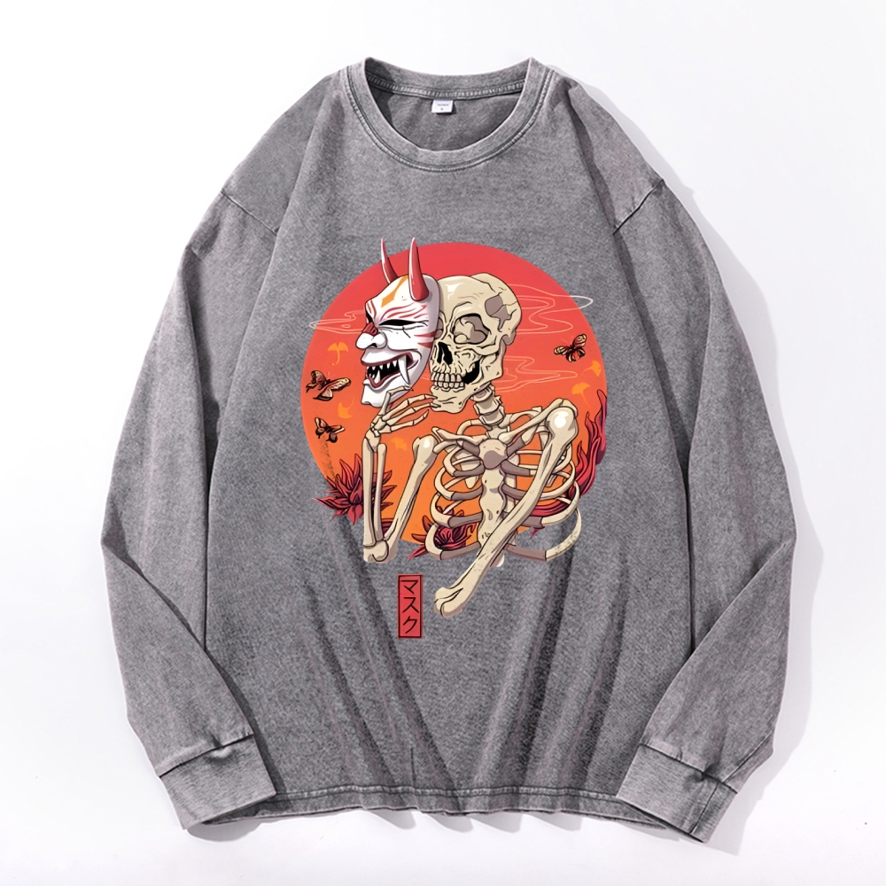 Japanese Skeleton Mask Deep Washed Vintage Long Sleeves T-Shirt