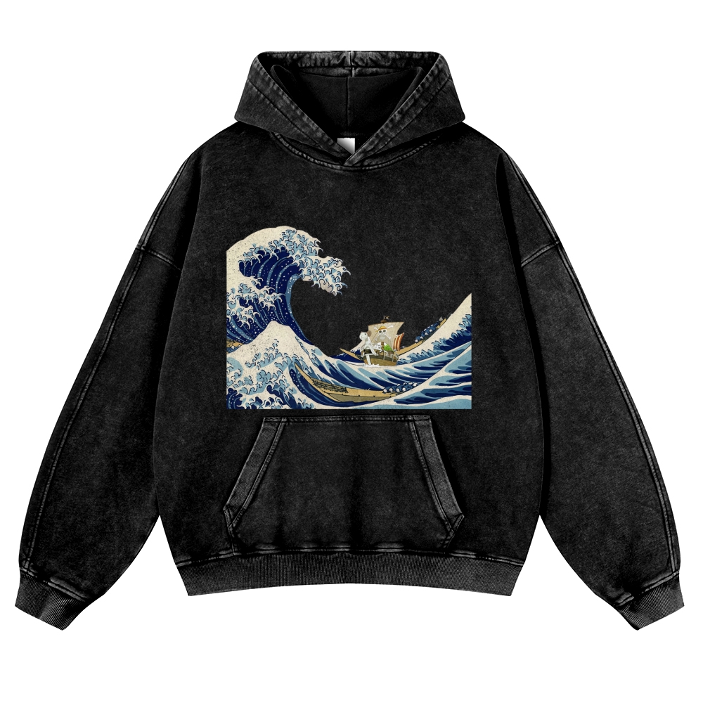 Japanese Godzilla Wave Ukiyoe Vintage Washed Hoodie