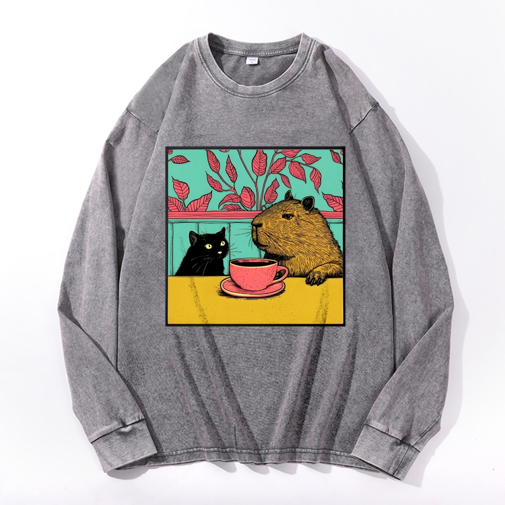 Black Cat And Capybara Pattern Deep Washed Vintage Long Sleeves T-Shirt