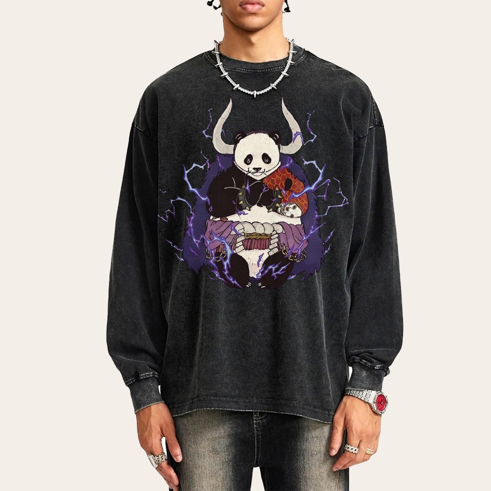 Panda Demon Pattern Deep Washed Vintage Long Sleeves T-Shirt