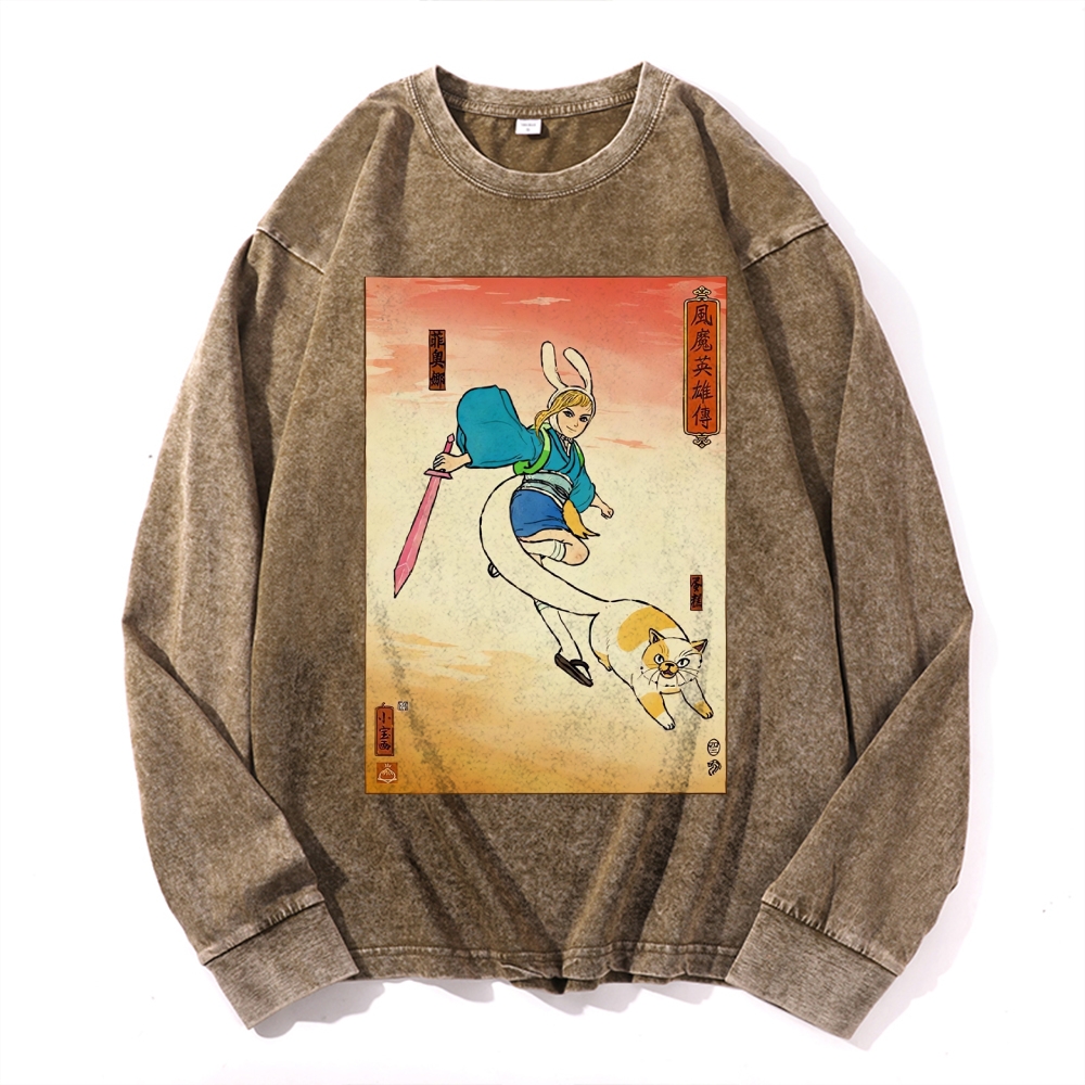 Japan Cat Painting Deep Washed Vintage Long Sleeves T-Shirt