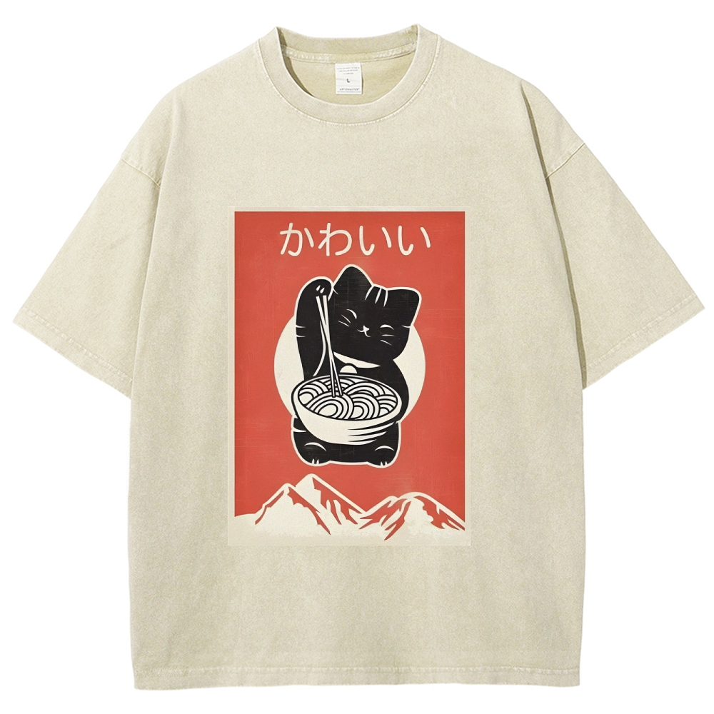 Ramen Cat Washed Vintage Short Sleeves T-Shirt