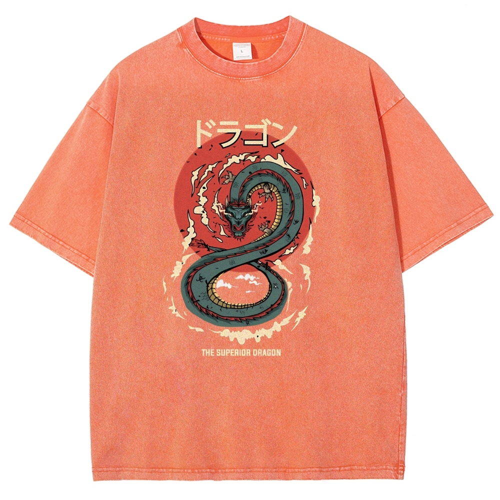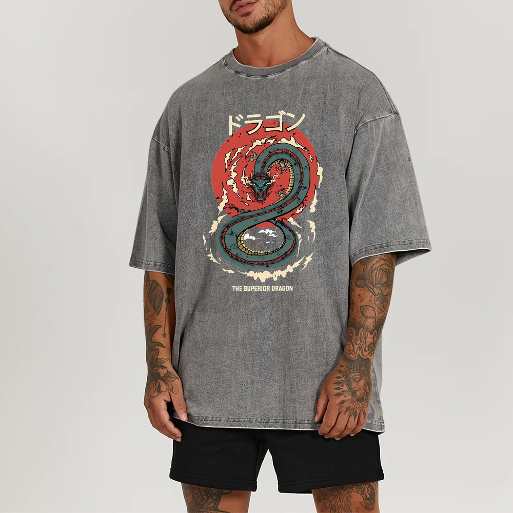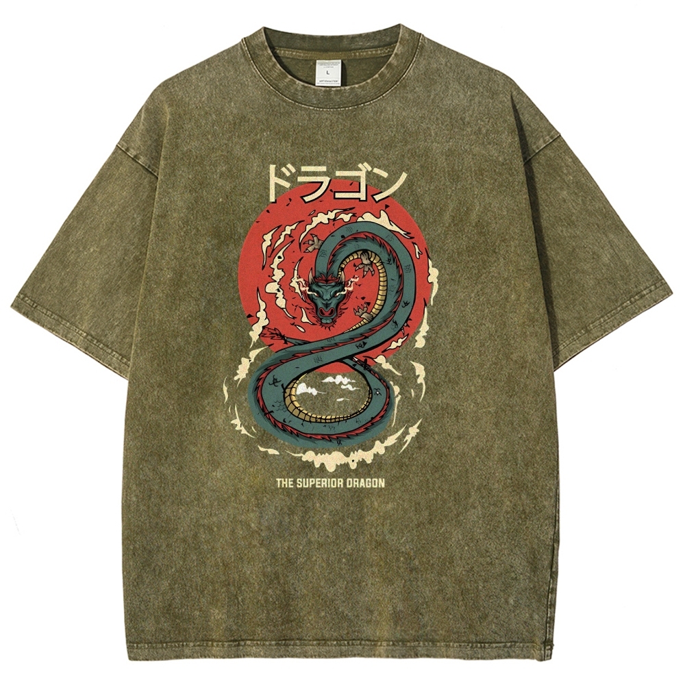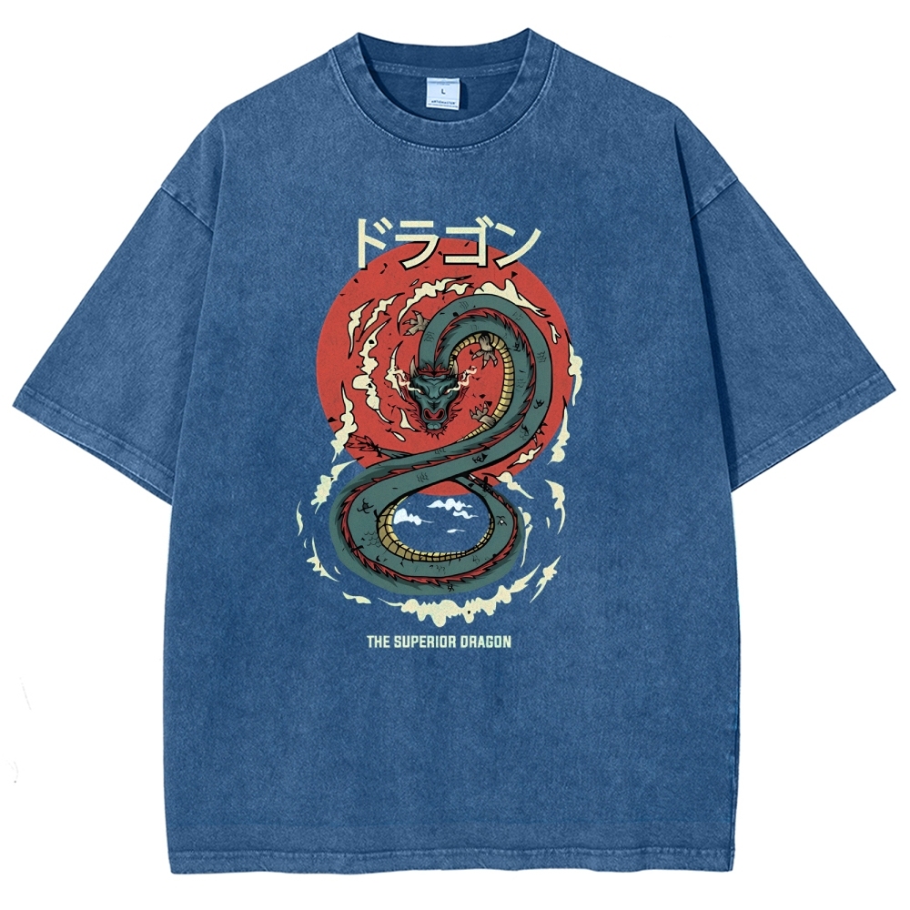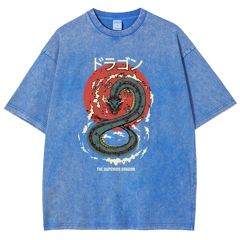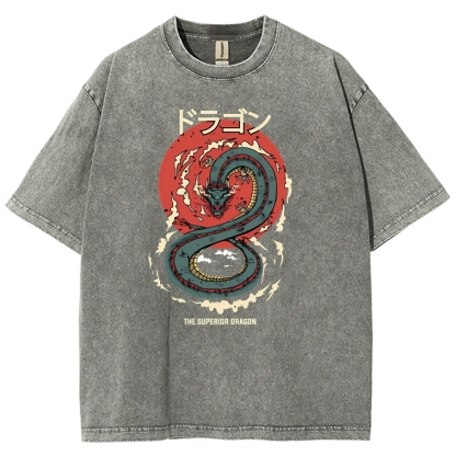 Azure Dragon Washed Vintage Printed Short Sleeves T-Shirt
