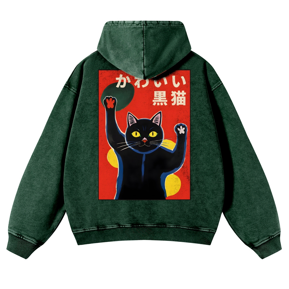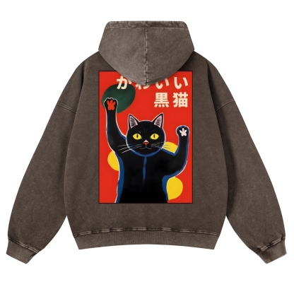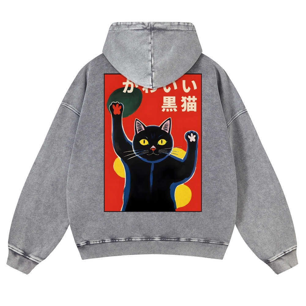 Black Cat Casual Vintage Washed Hoodie