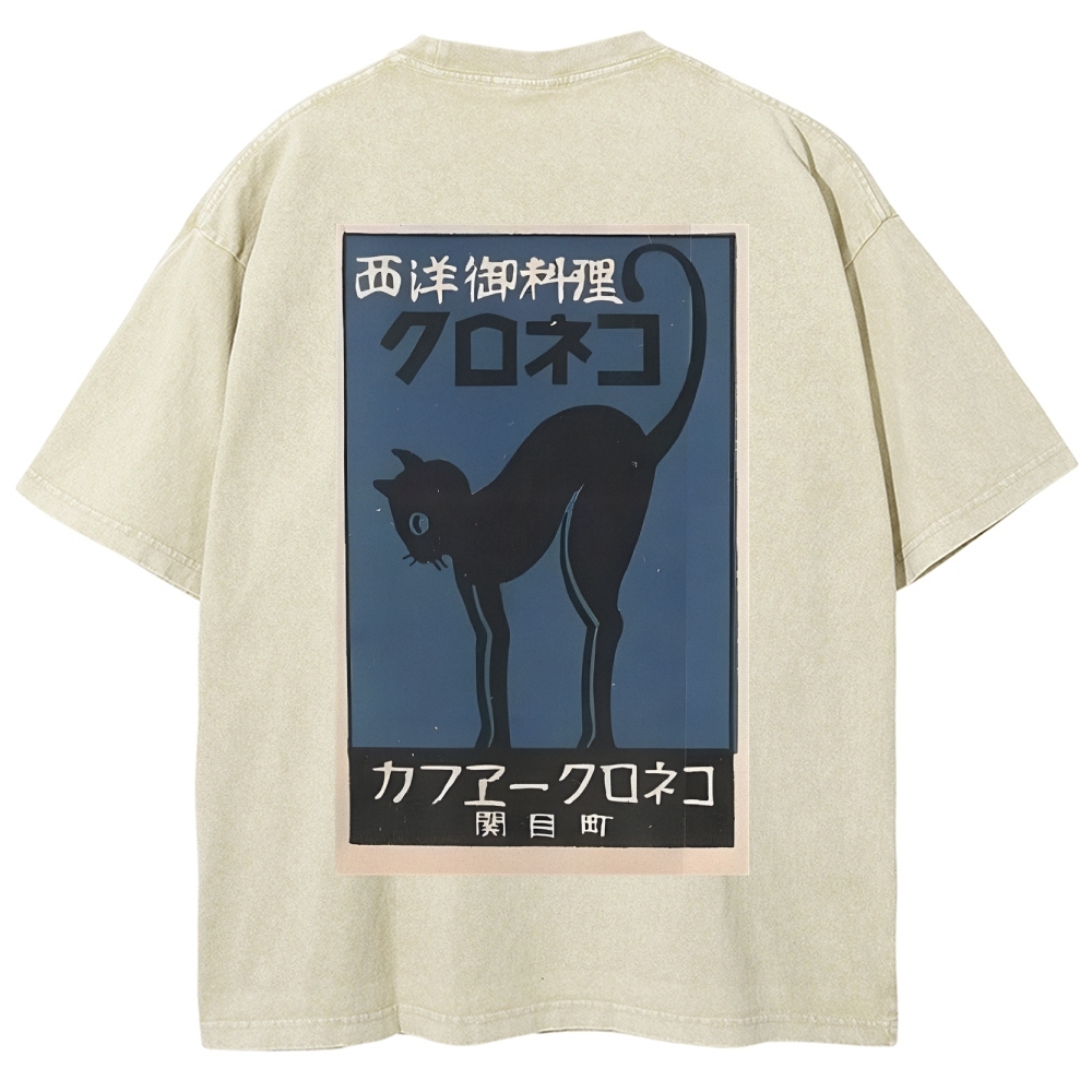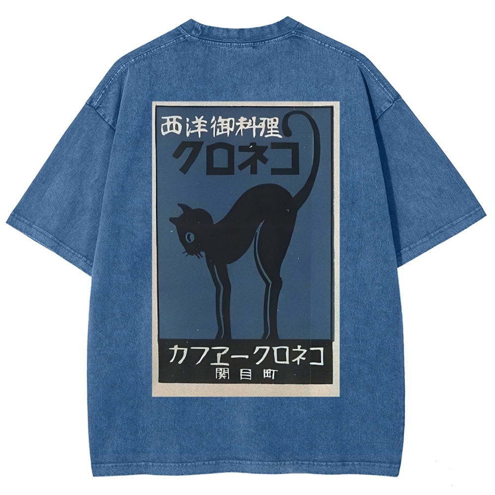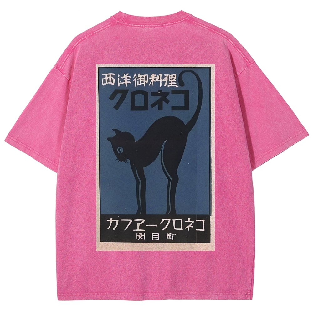 Black Cat Printed Washed Vintage Short Sleeves T-Shirt