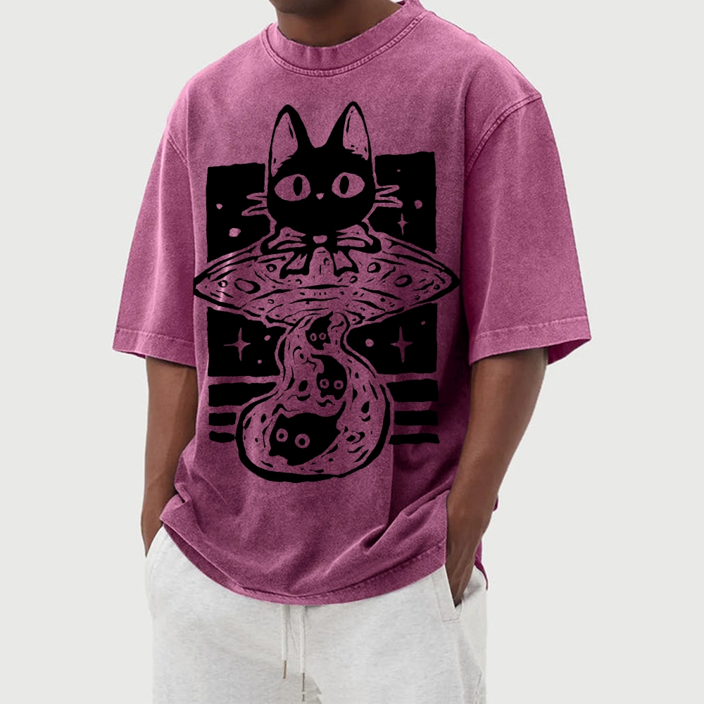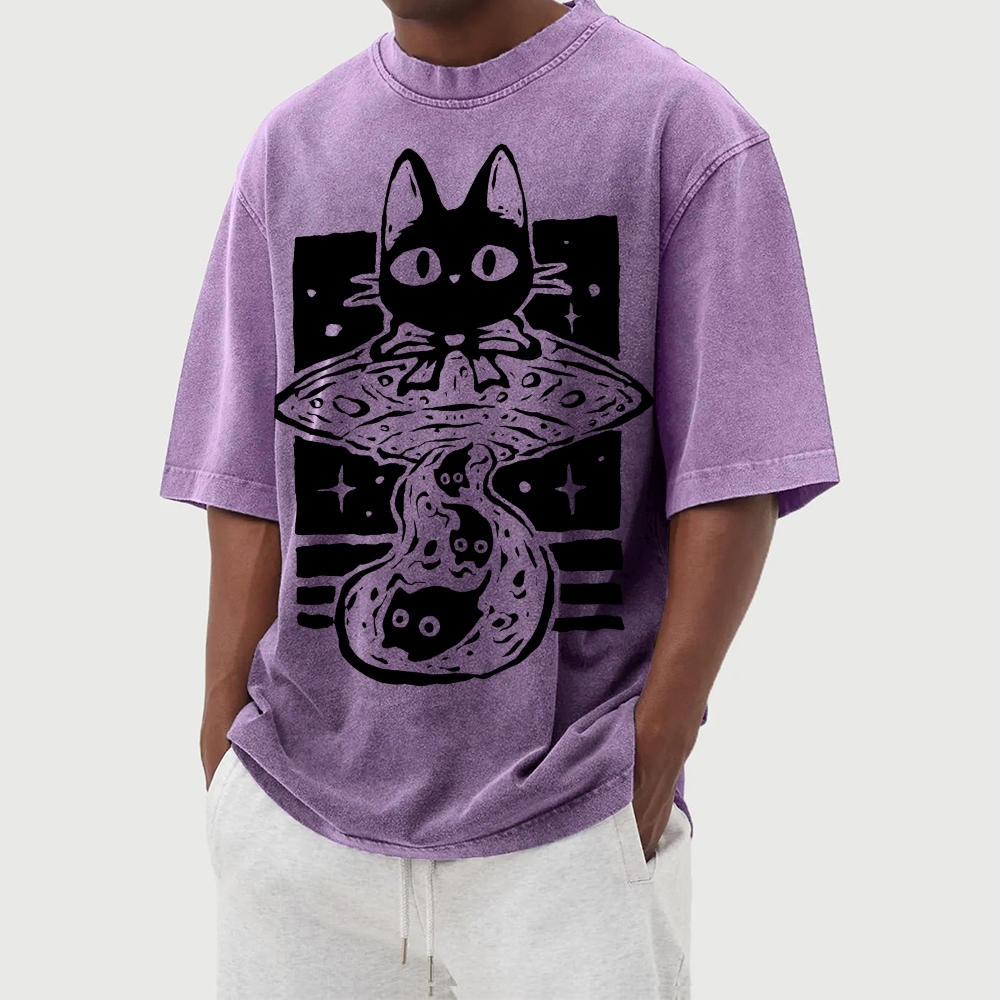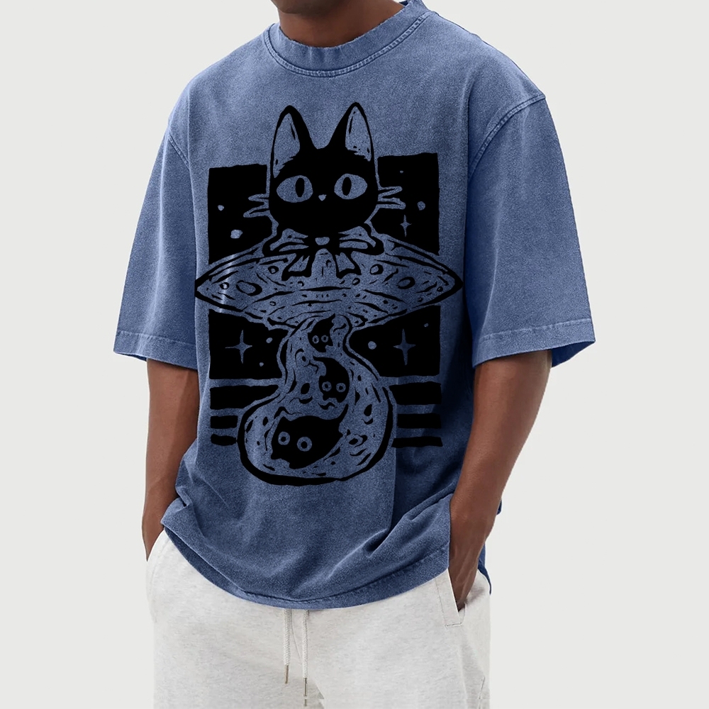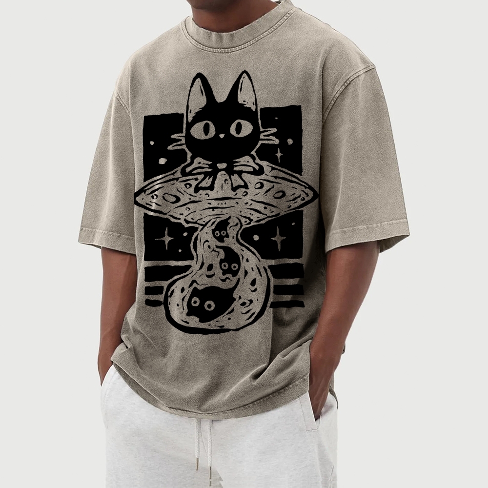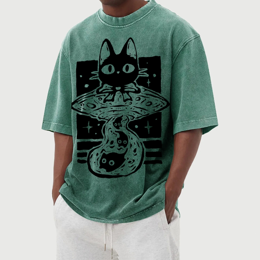 Black Cat UFO Washed Vintage Short Sleeves T-Shirt