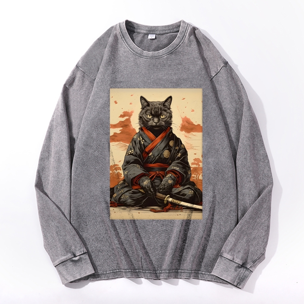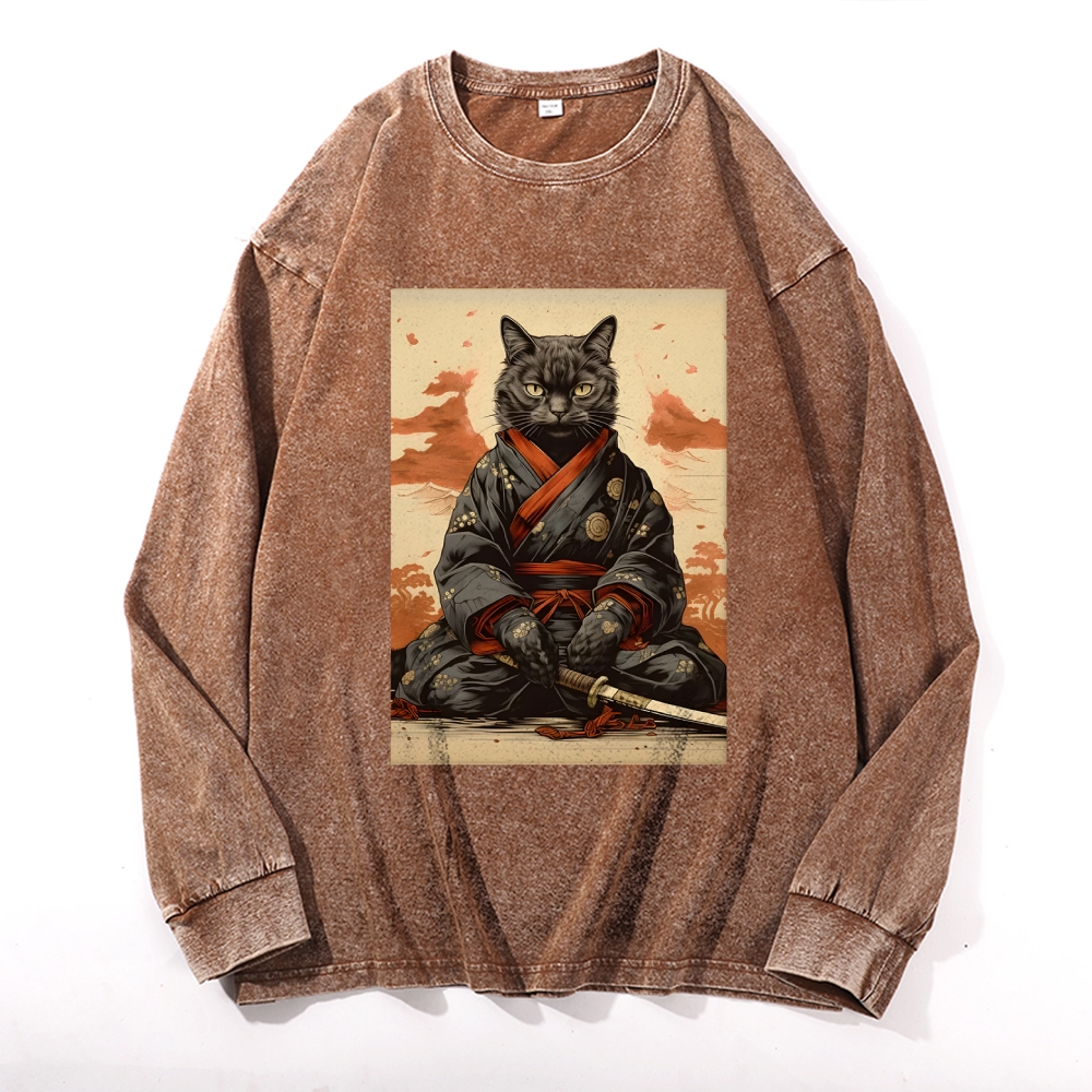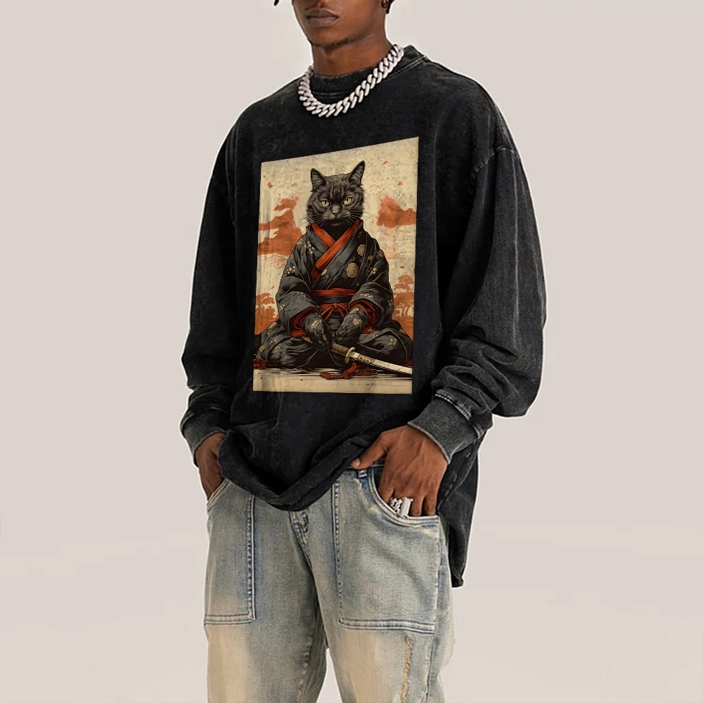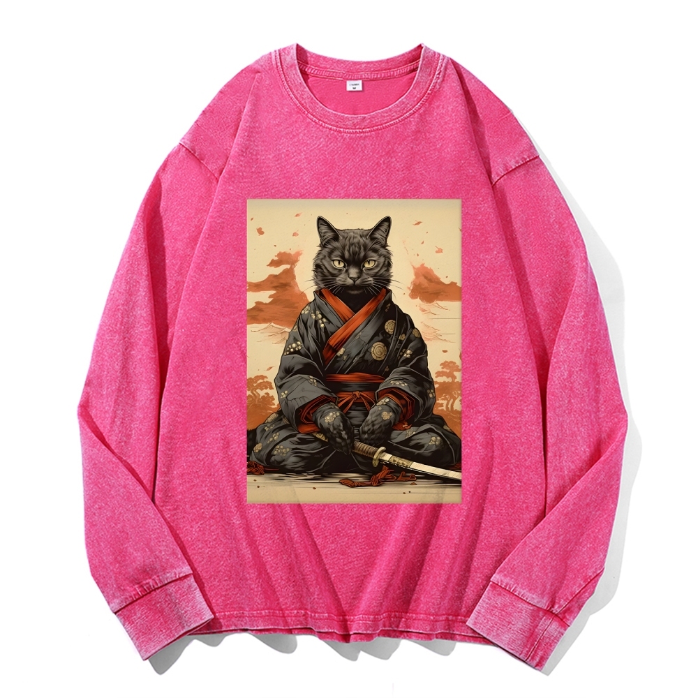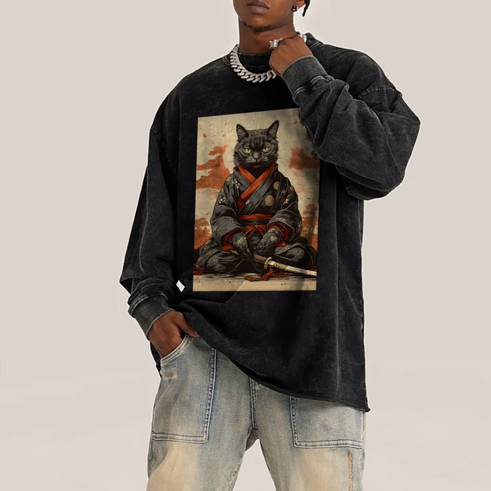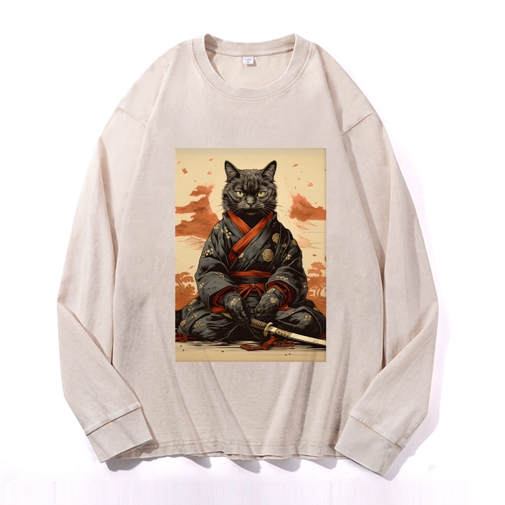 Black Cat Warrior Deep Washed Vintage Long Sleeves T-Shirt