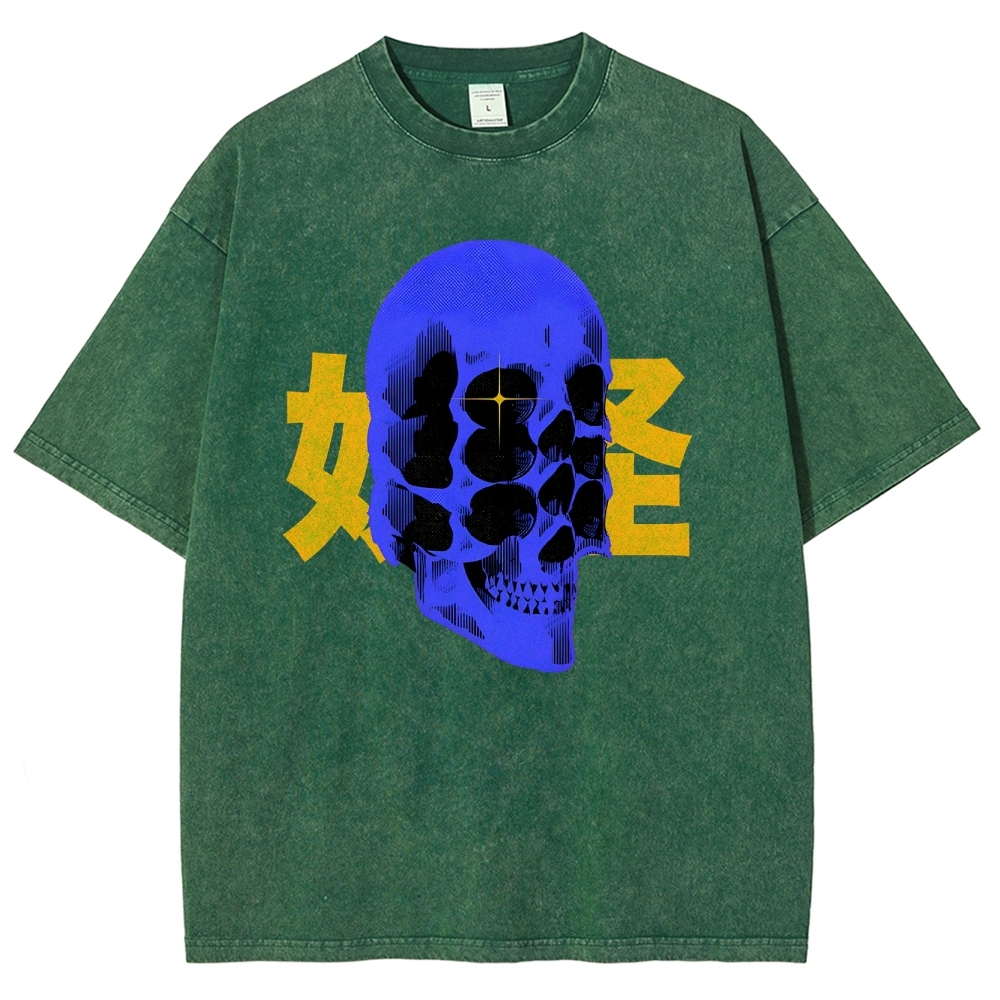 Blue Skull Prints Washed Vintage Short Sleeves T-Shirt