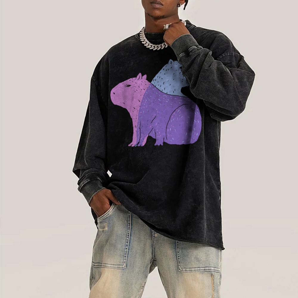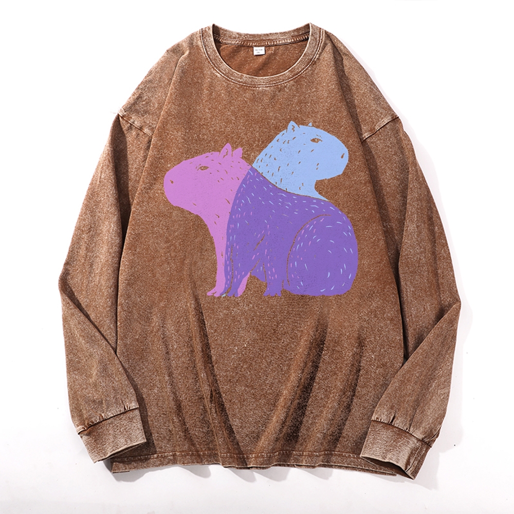 Capybara Pattern Deep Washed Vintage Long Sleeves T-Shirt