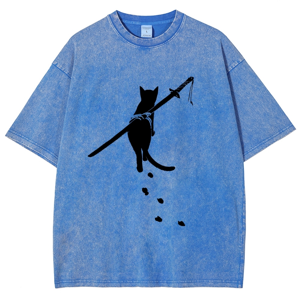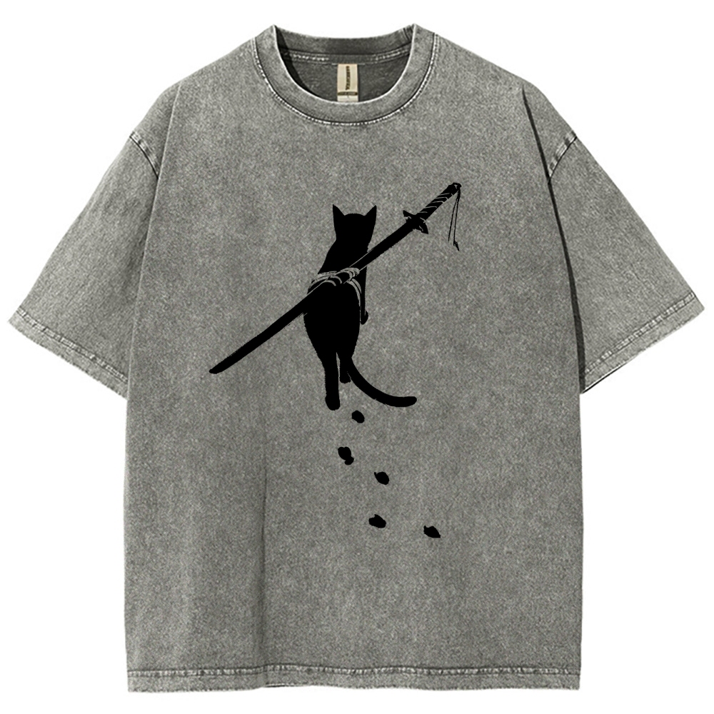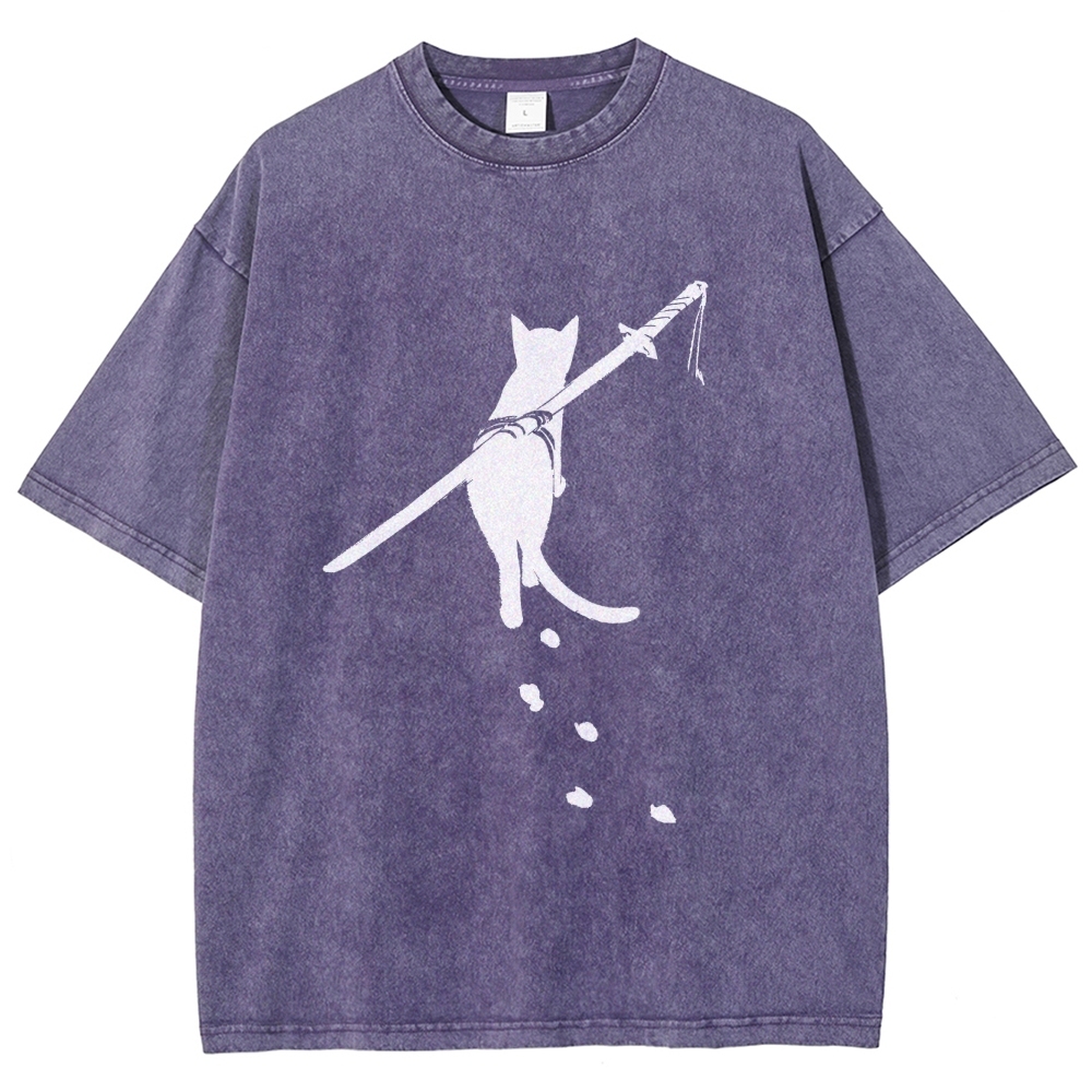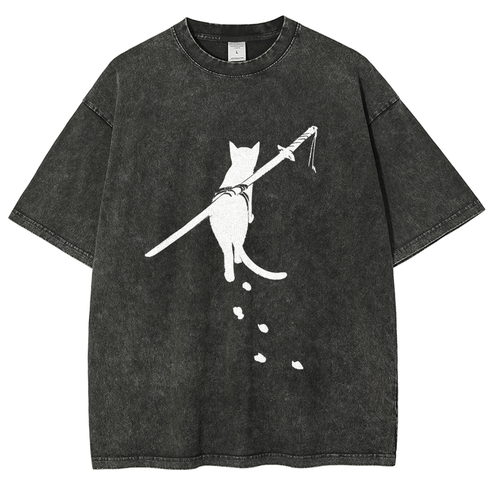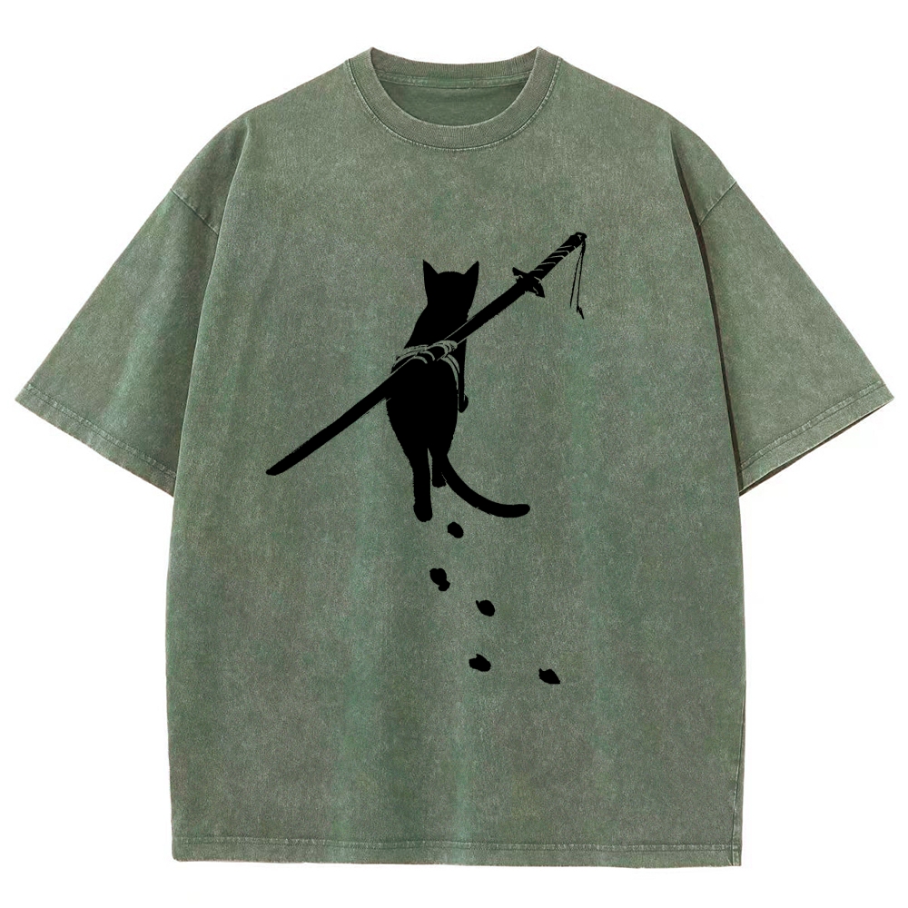 Carrying Knife Cat Washed Vintage Short Sleeves T-Shirt