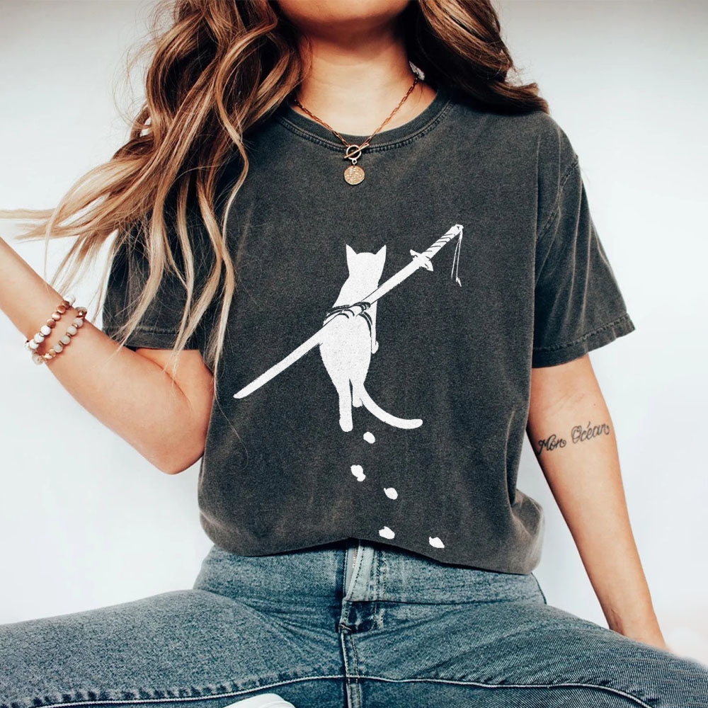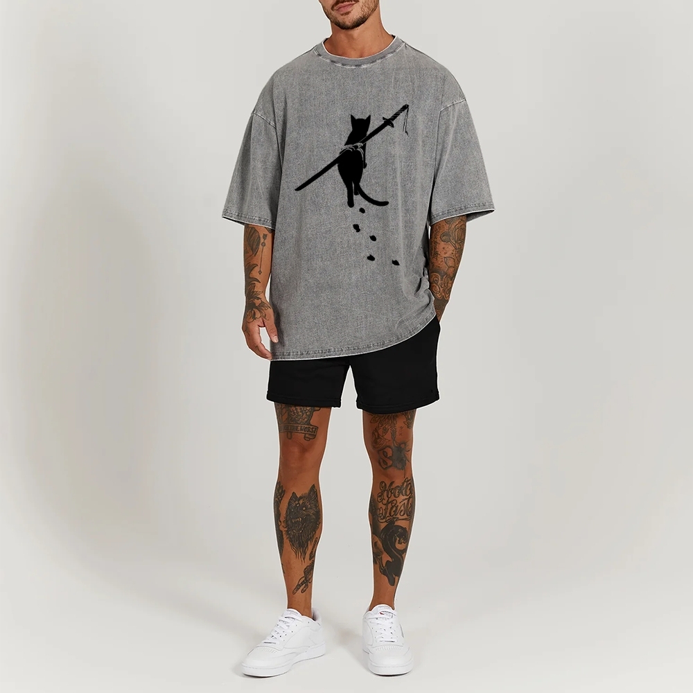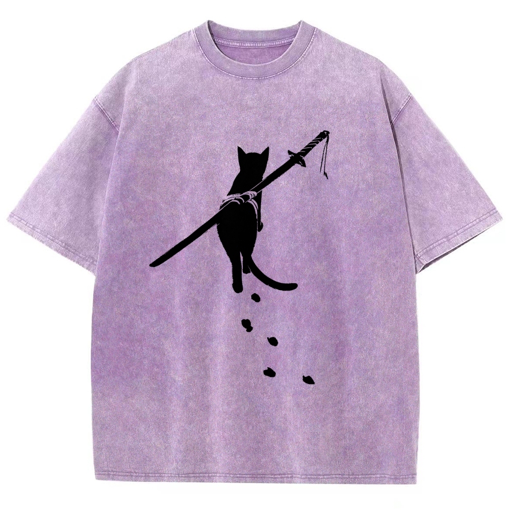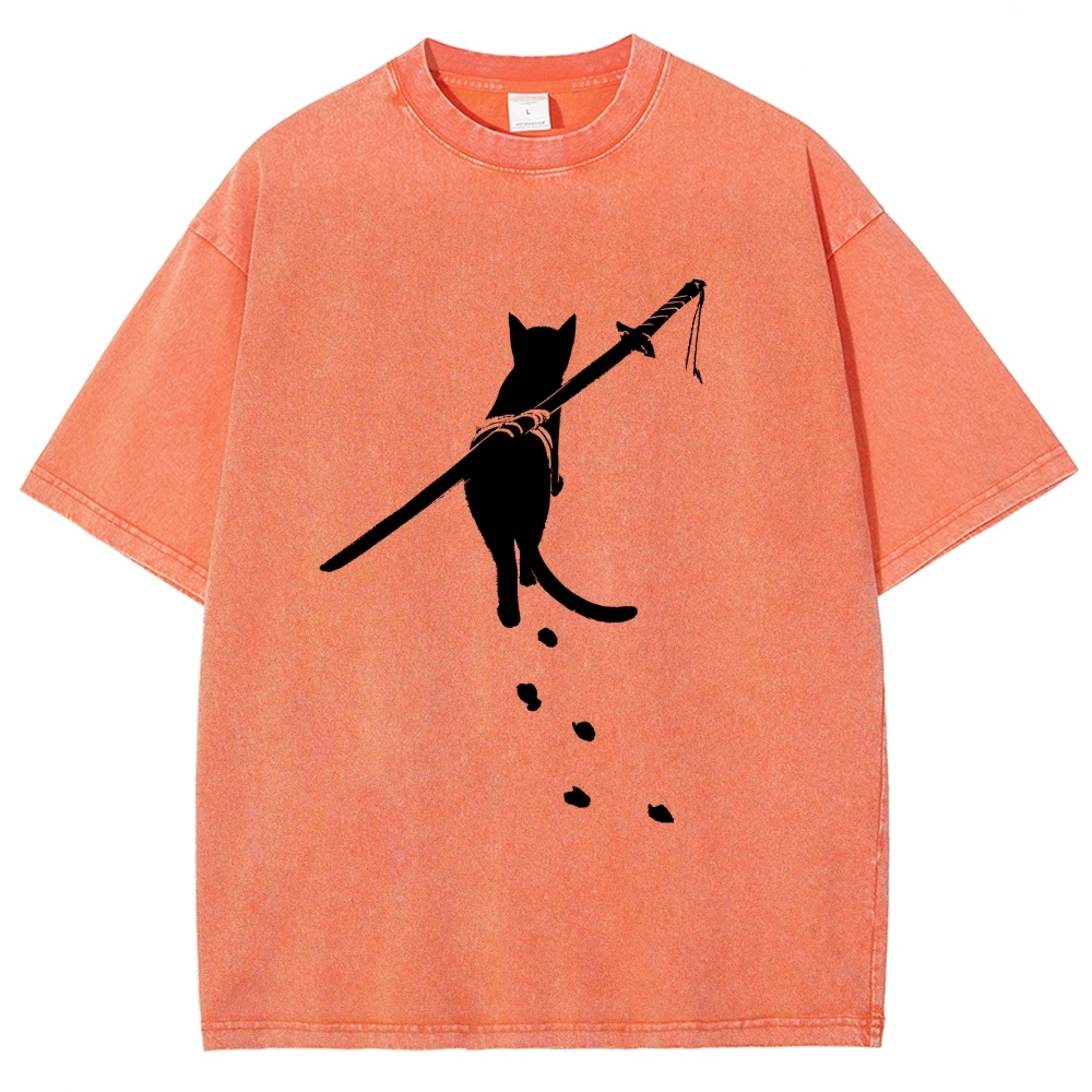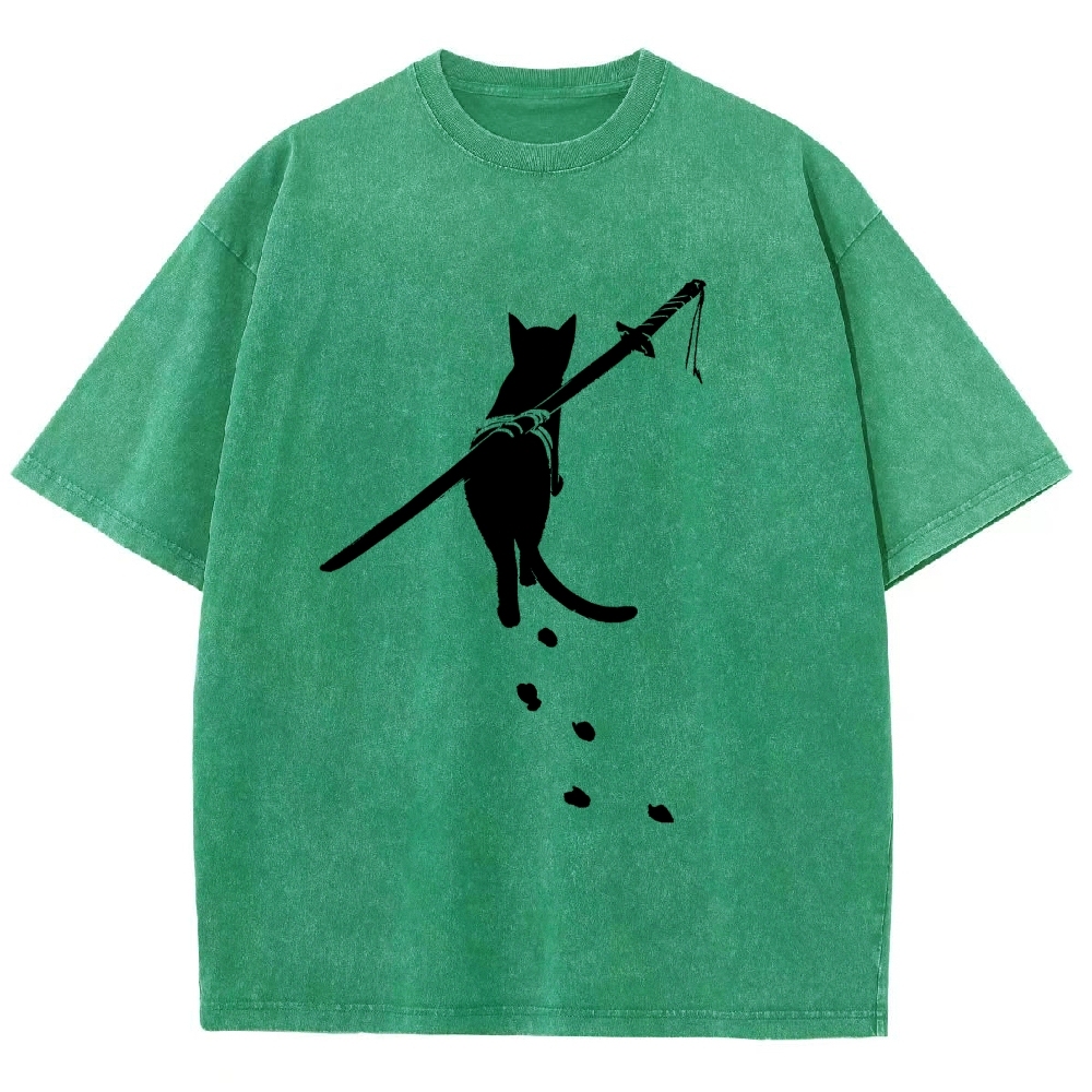 Carrying Knife Cat Washed Vintage Short Sleeves T-Shirt