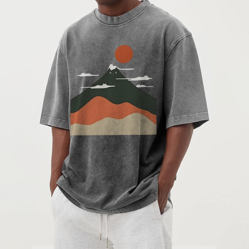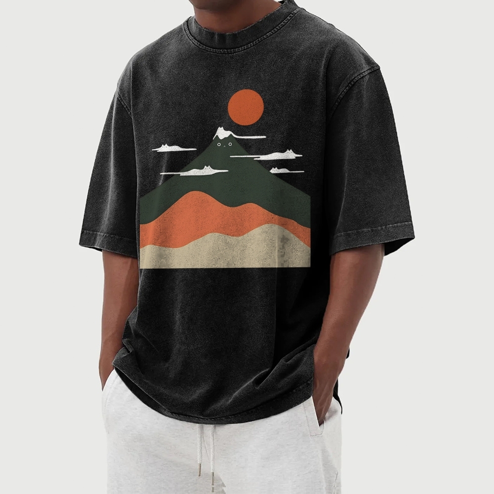 Cat Cloud Mount Fuji Washed Vintage Short Sleeves T-Shirt