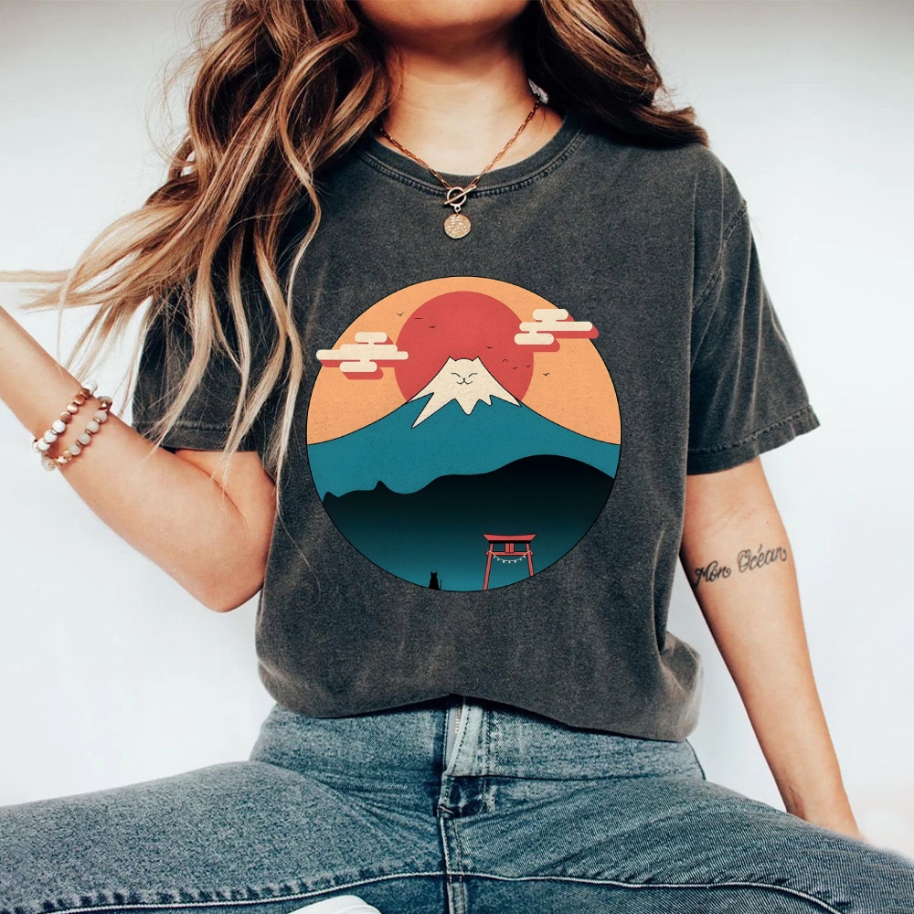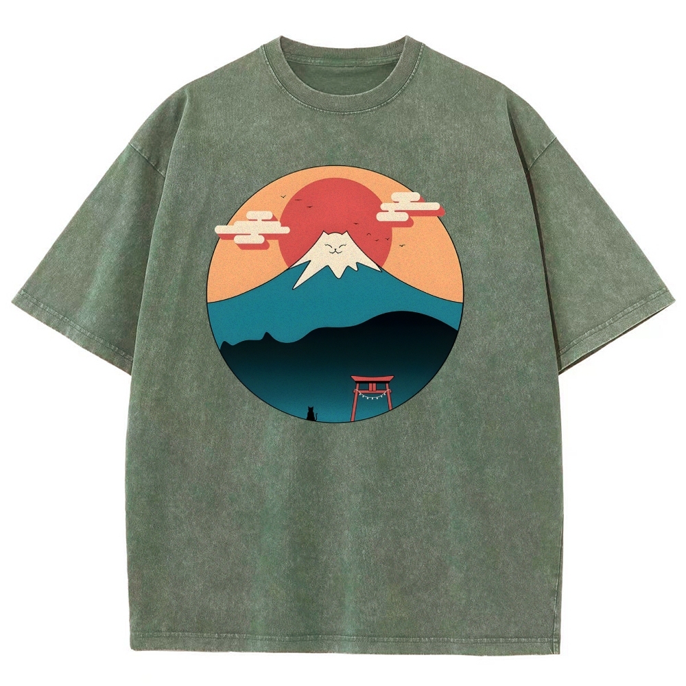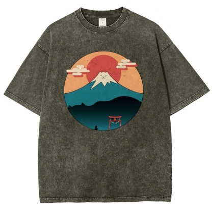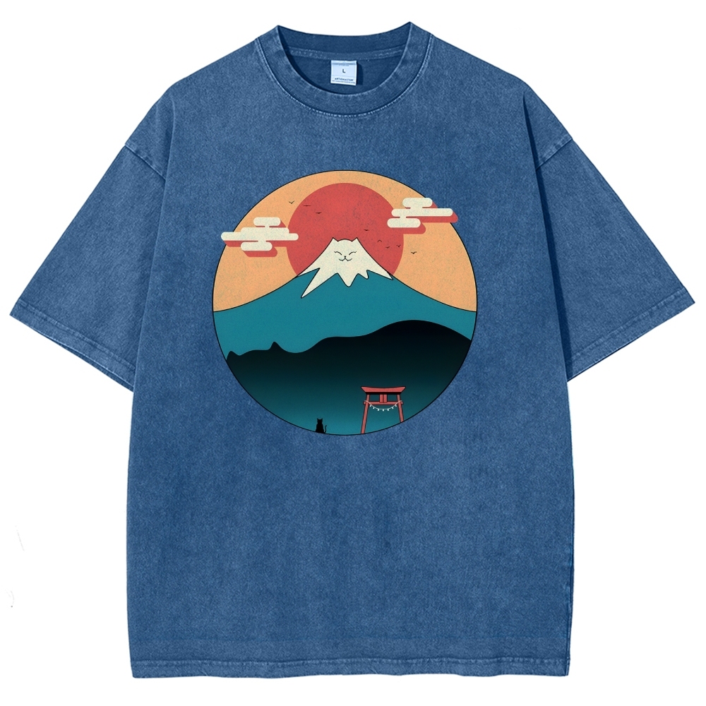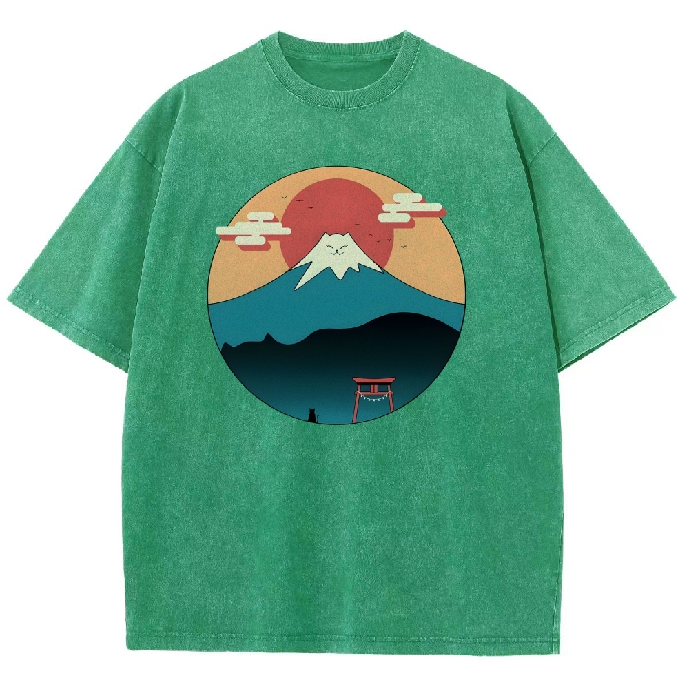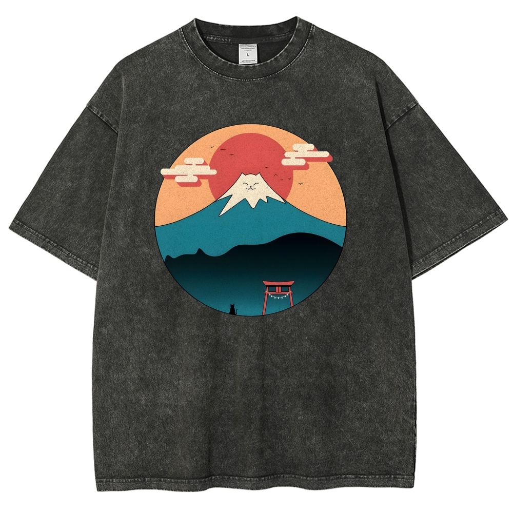 Cat Mount Fuji Washed Vintage Short Sleeves T-Shirt