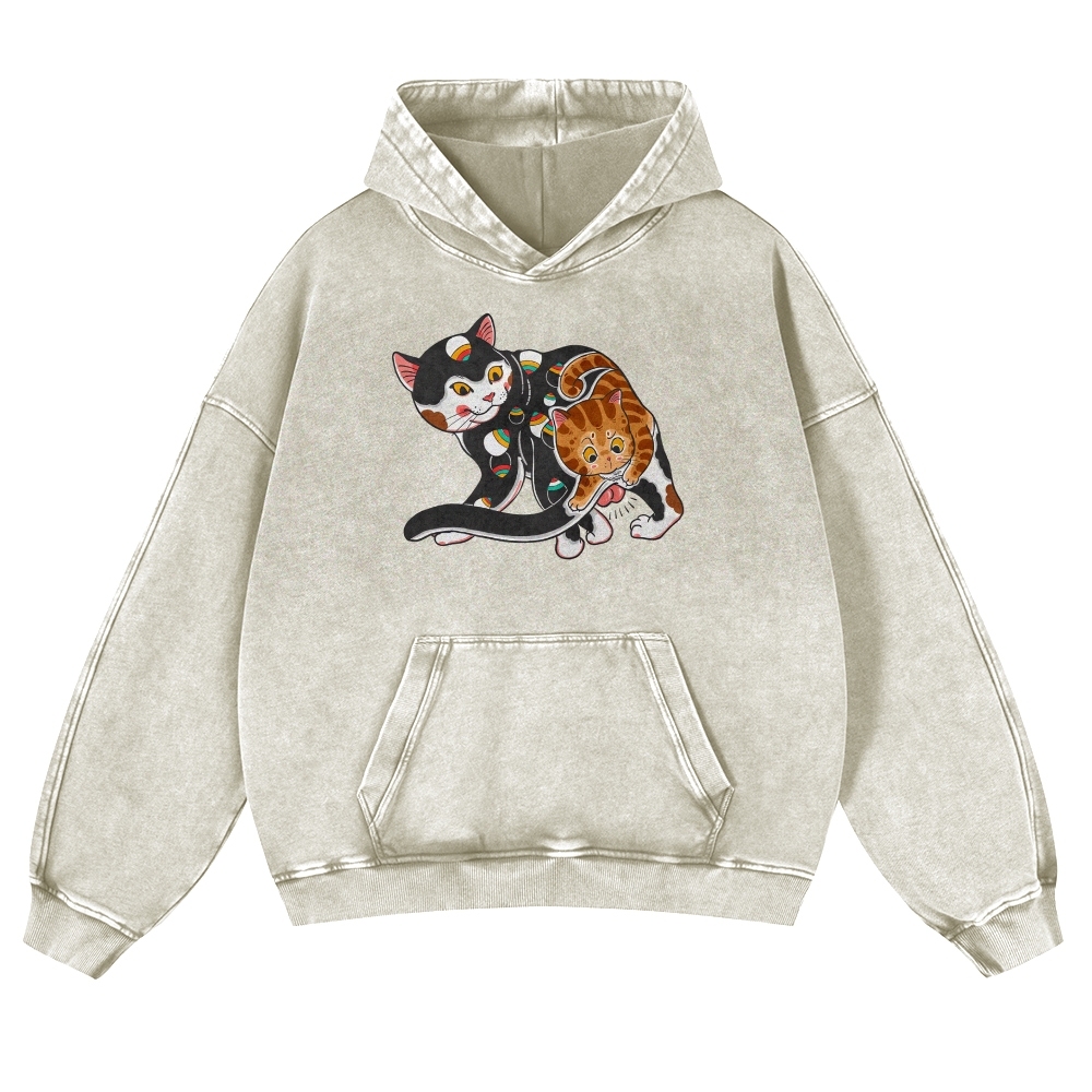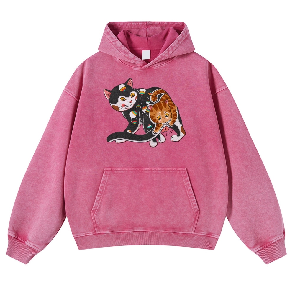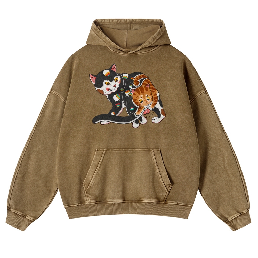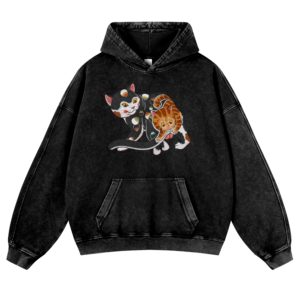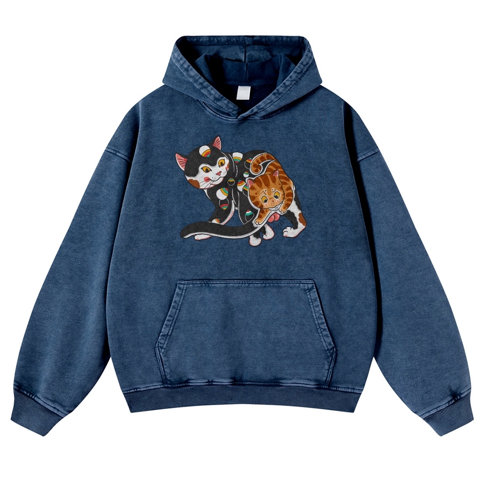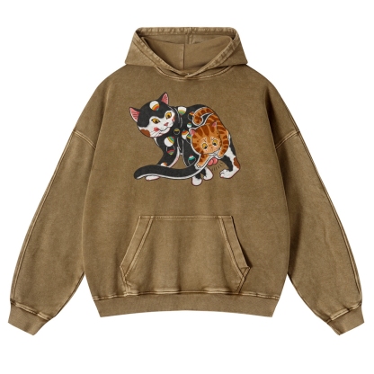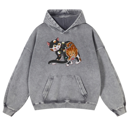 Curious Cat Pattern Printed Vintage Washed Hoodie