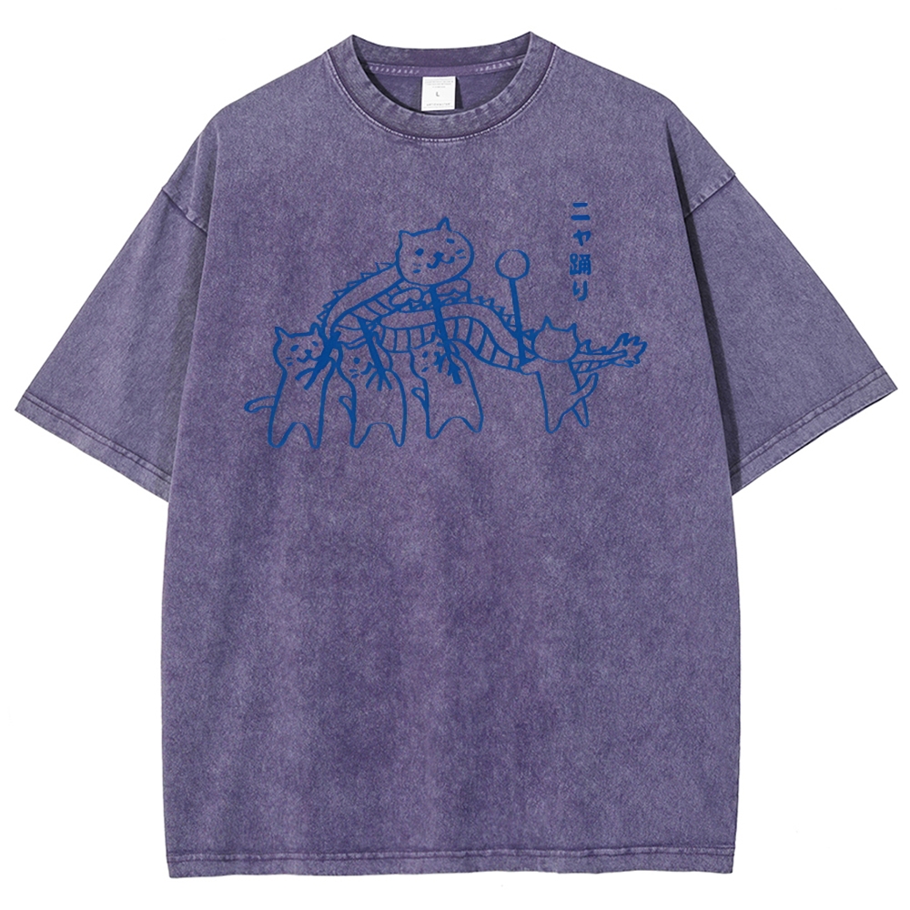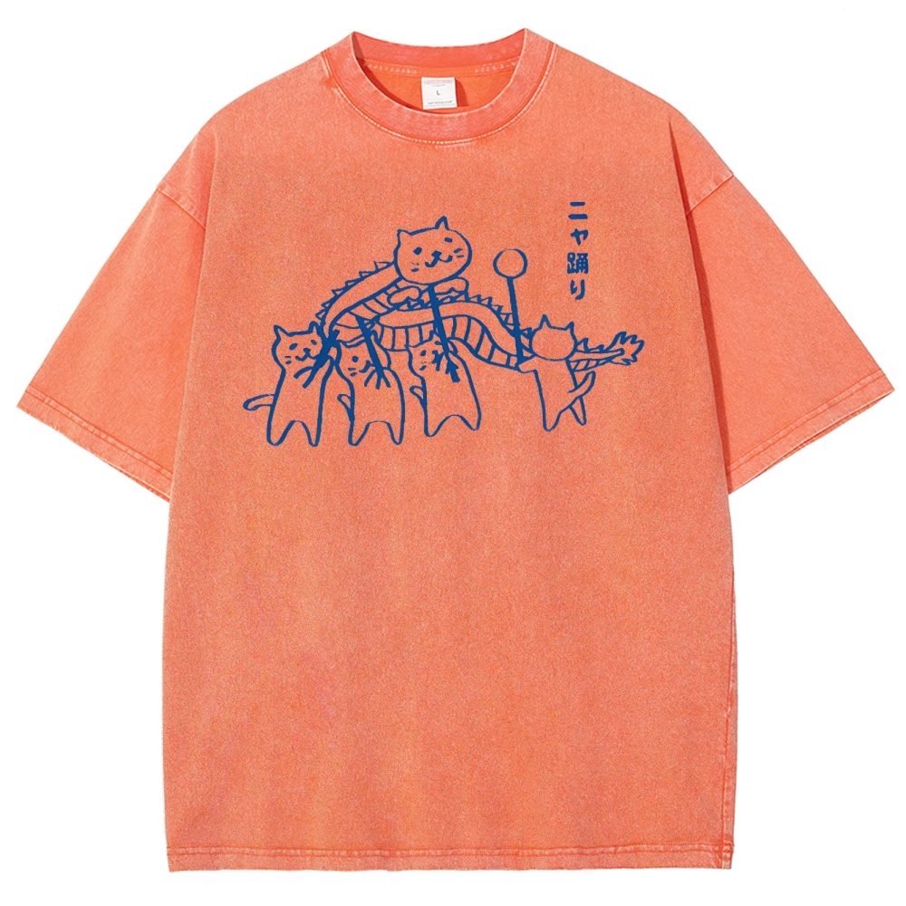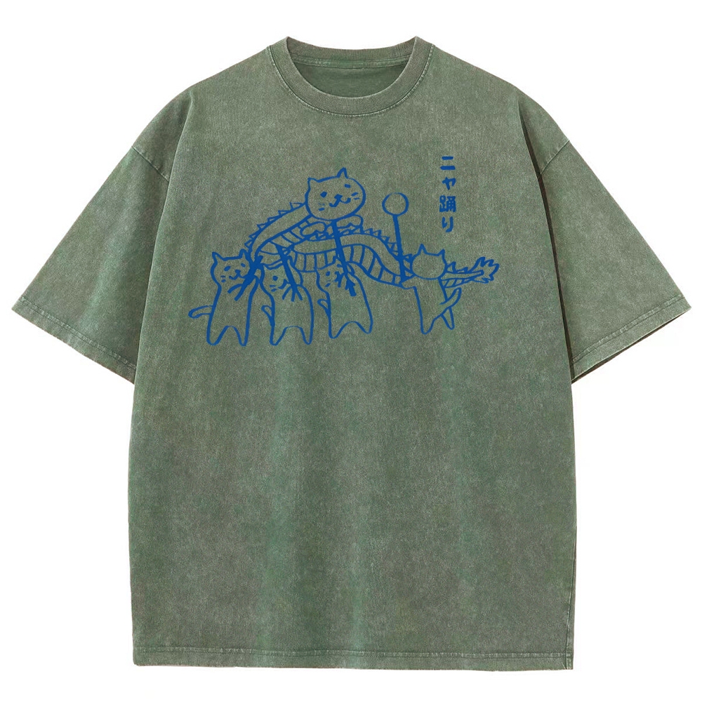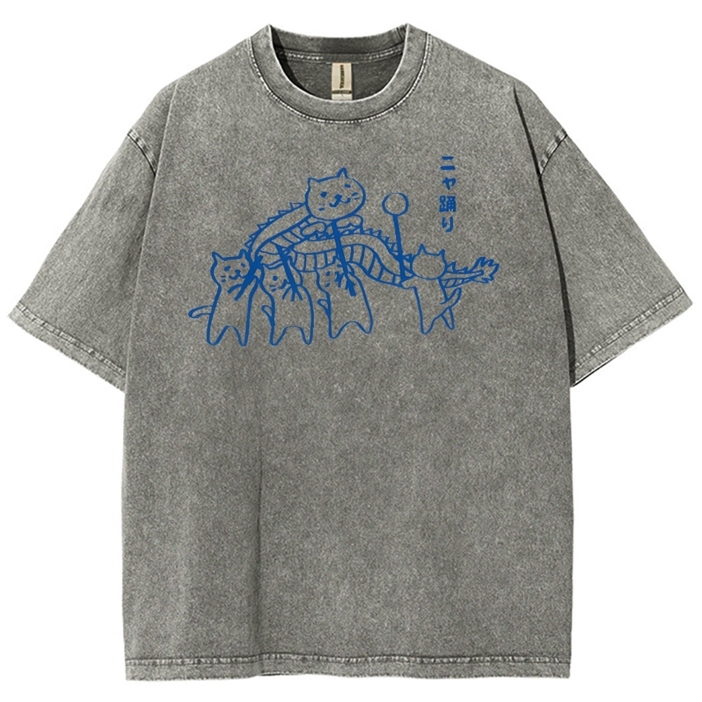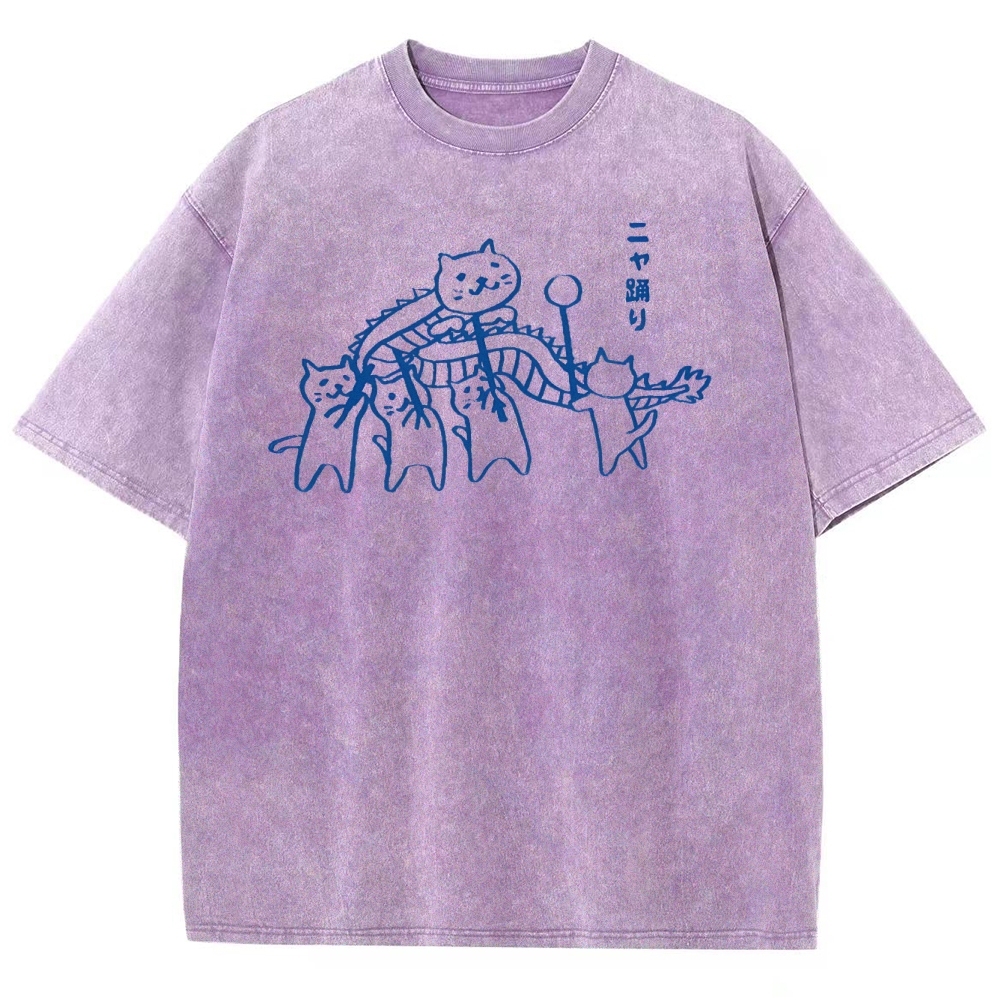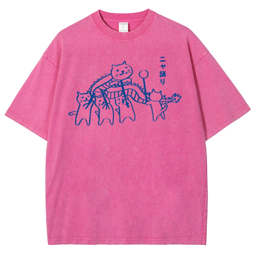 Dancing Cat Washed Vintage Short Sleeves T-Shirt