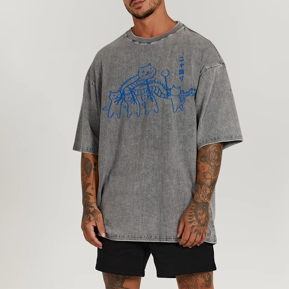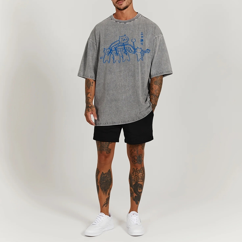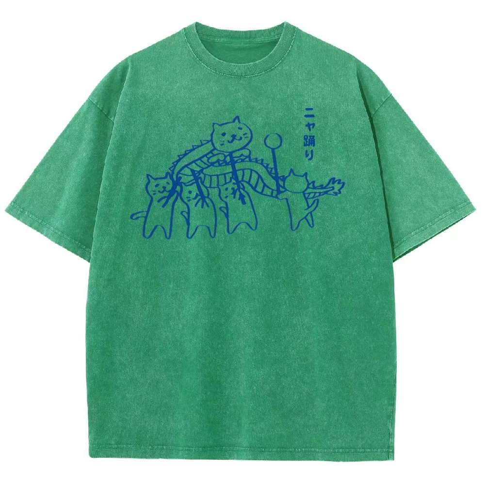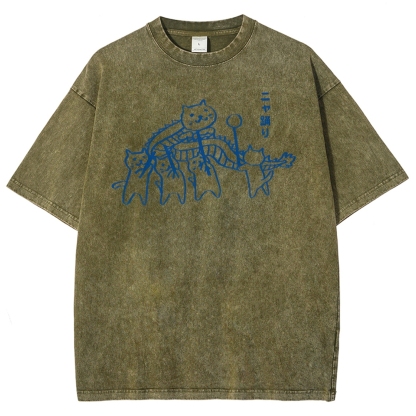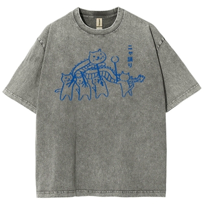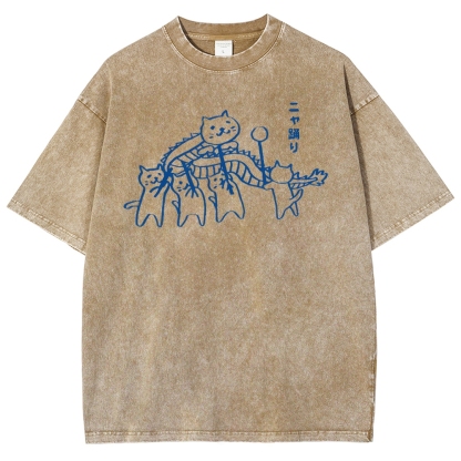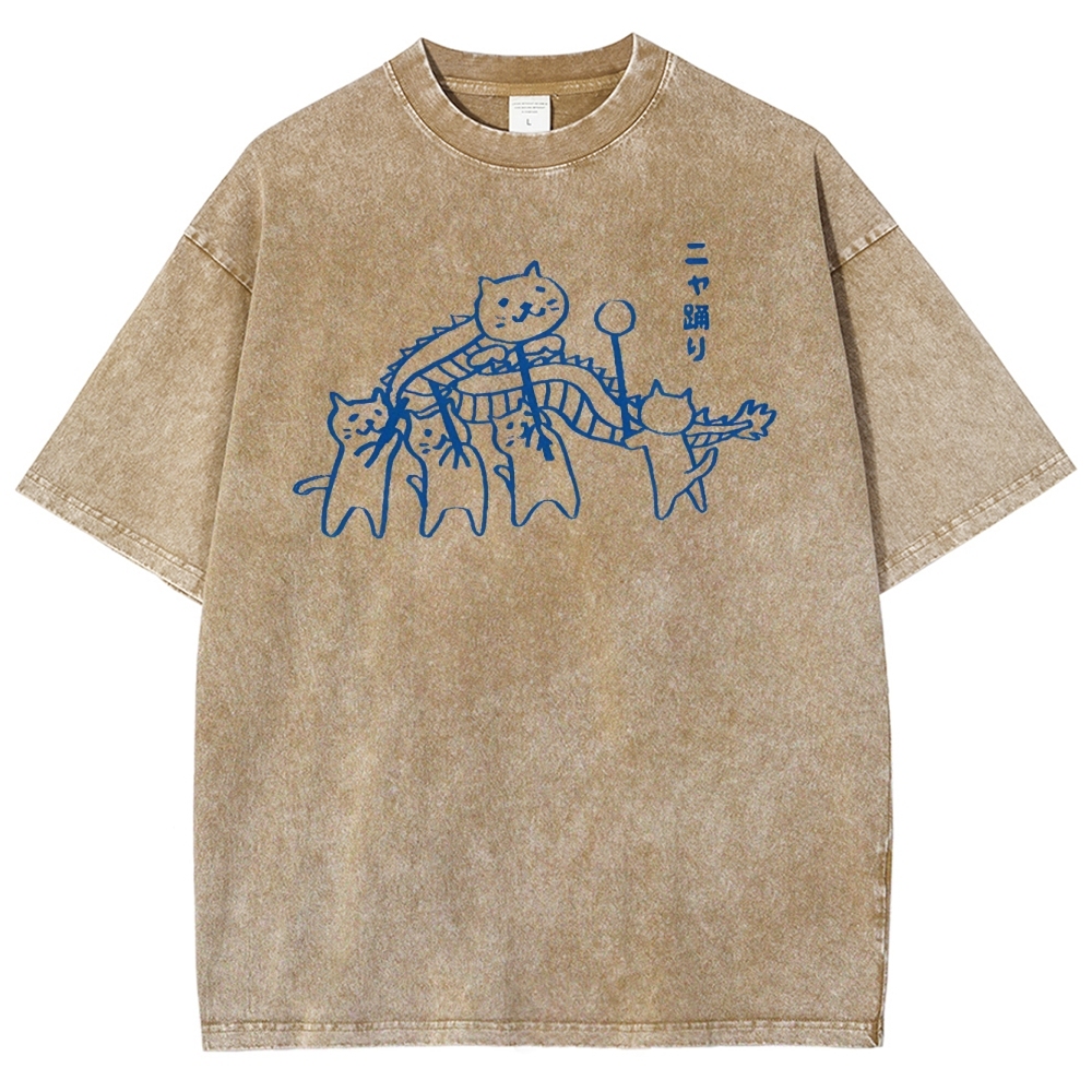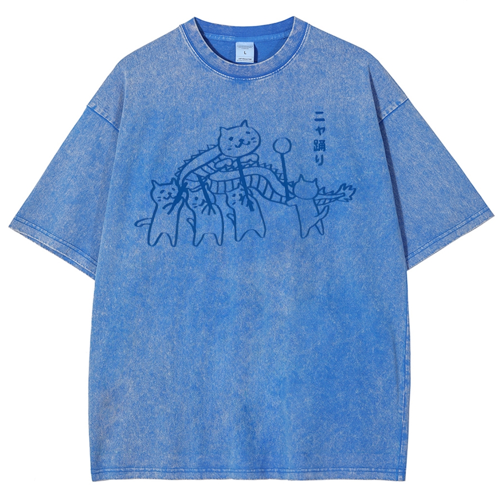 Dancing Cat Washed Vintage Short Sleeves T-Shirt