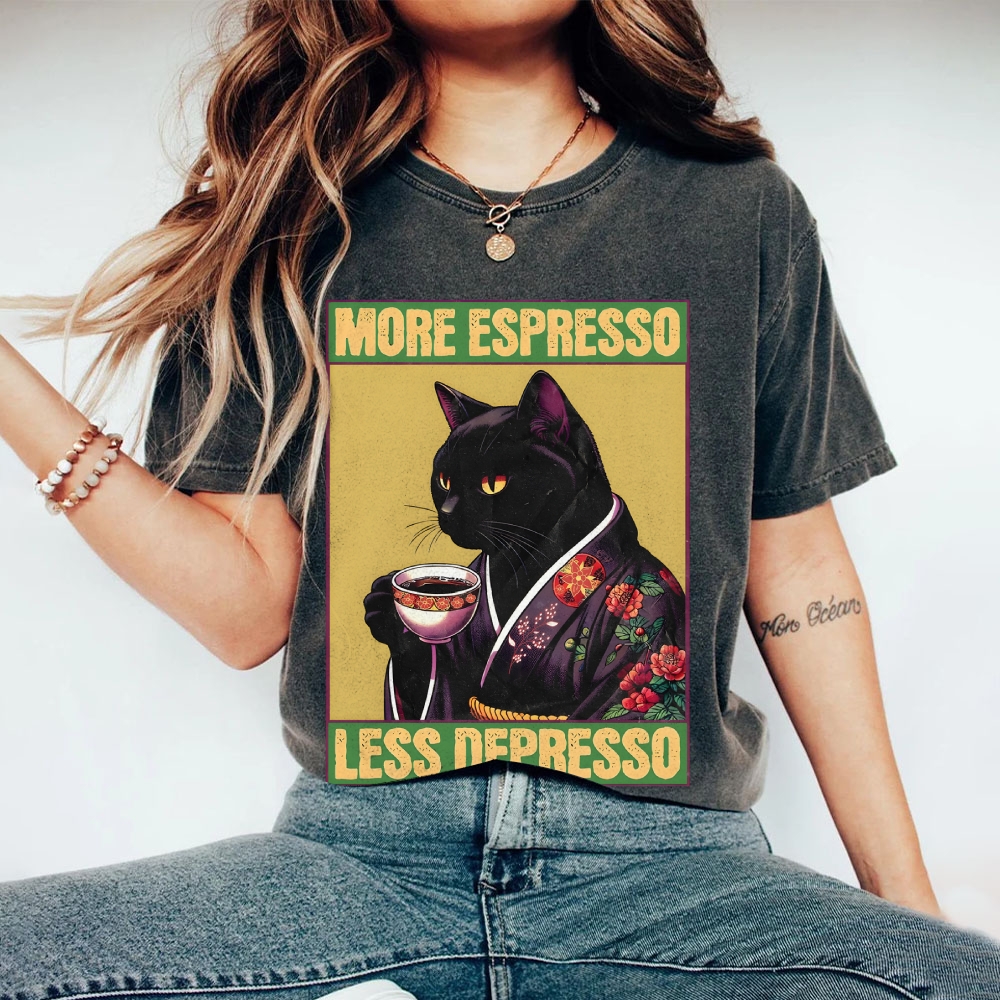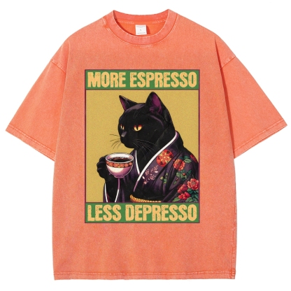 Drinking Tea Cat Washed Vintage Short Sleeves T-Shirt