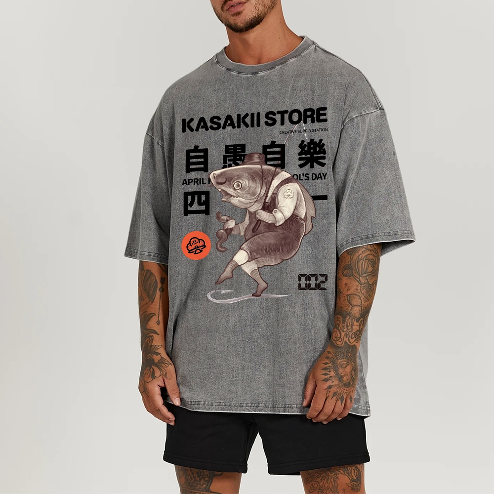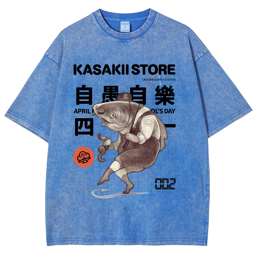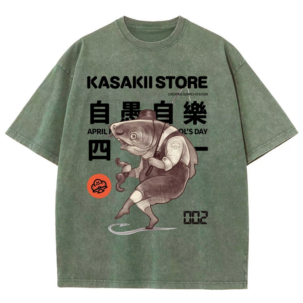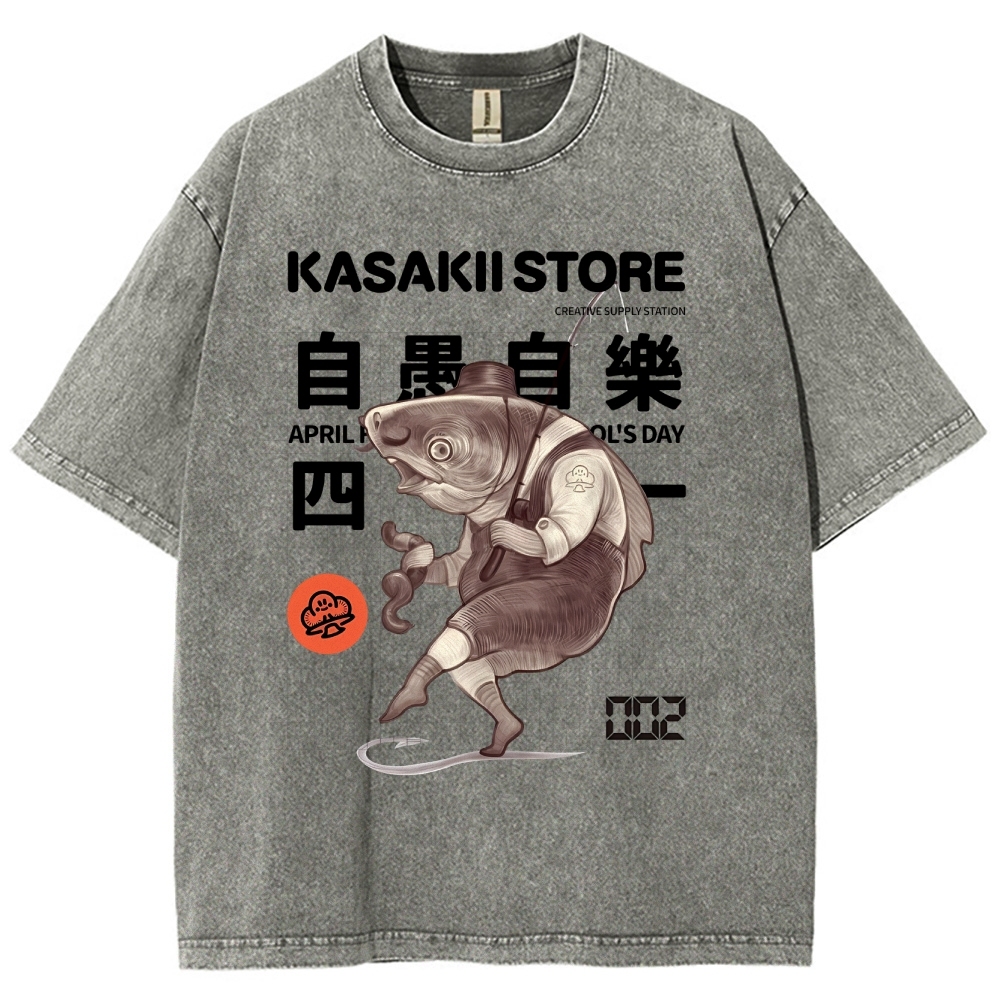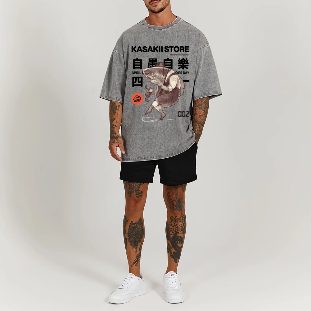 Fishing Shark Man Washed Vintage Short Sleeves T-Shirt