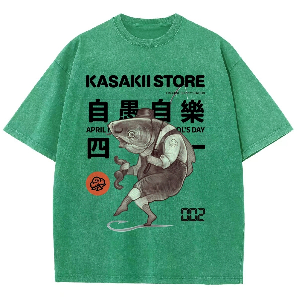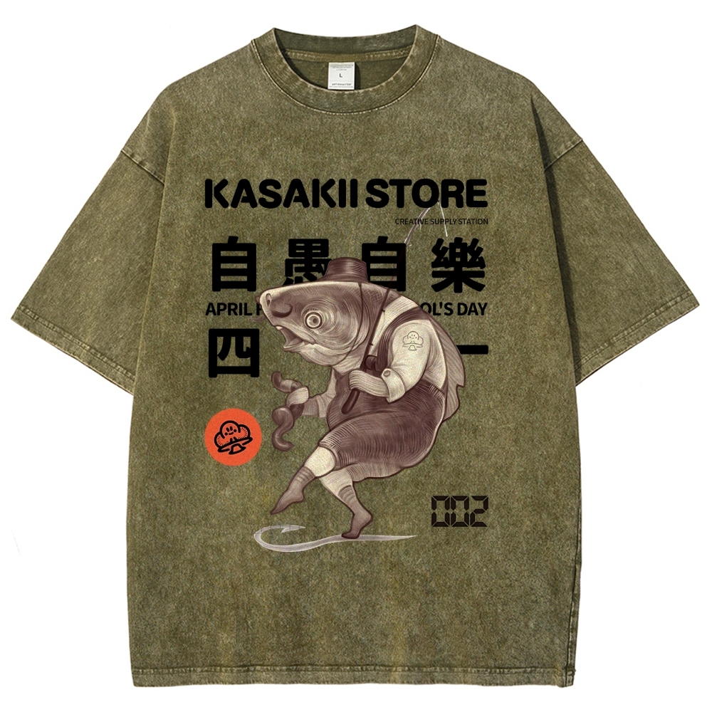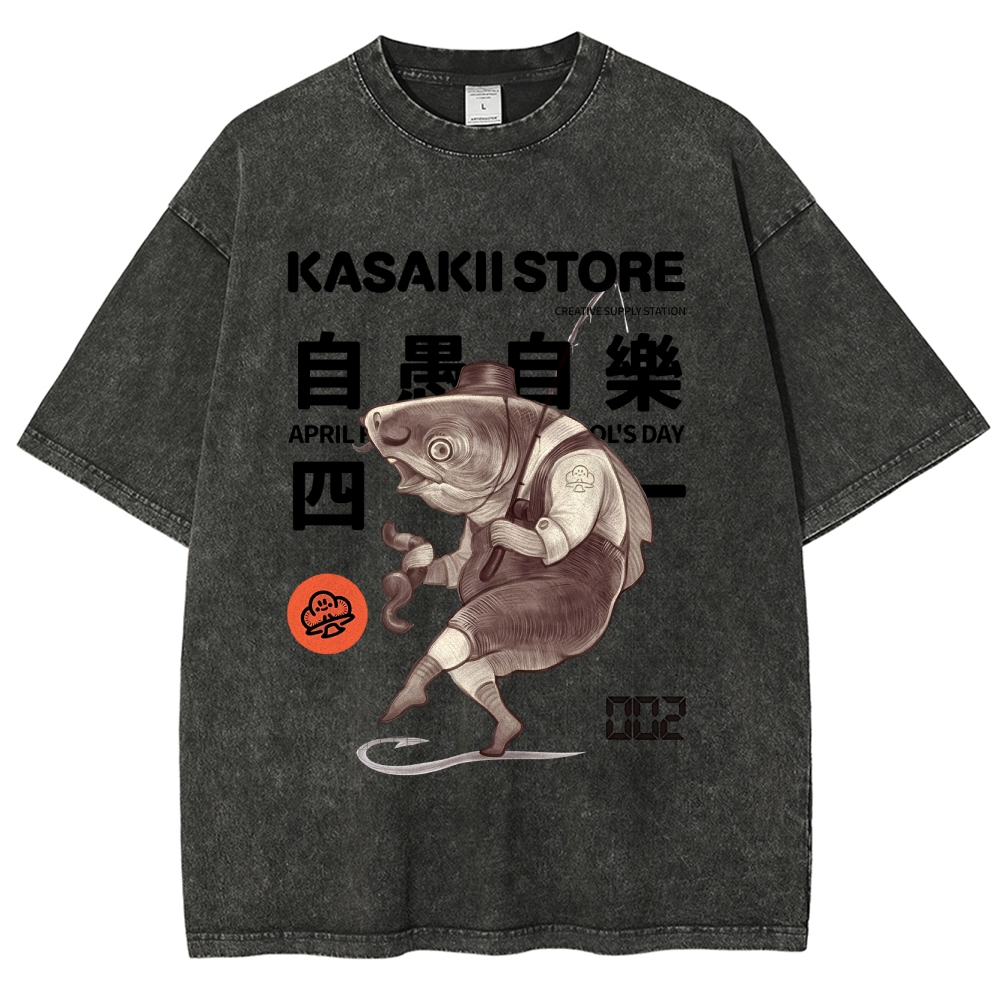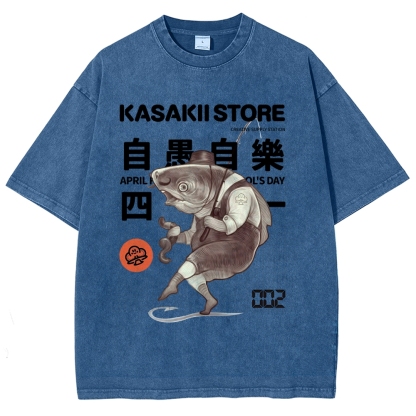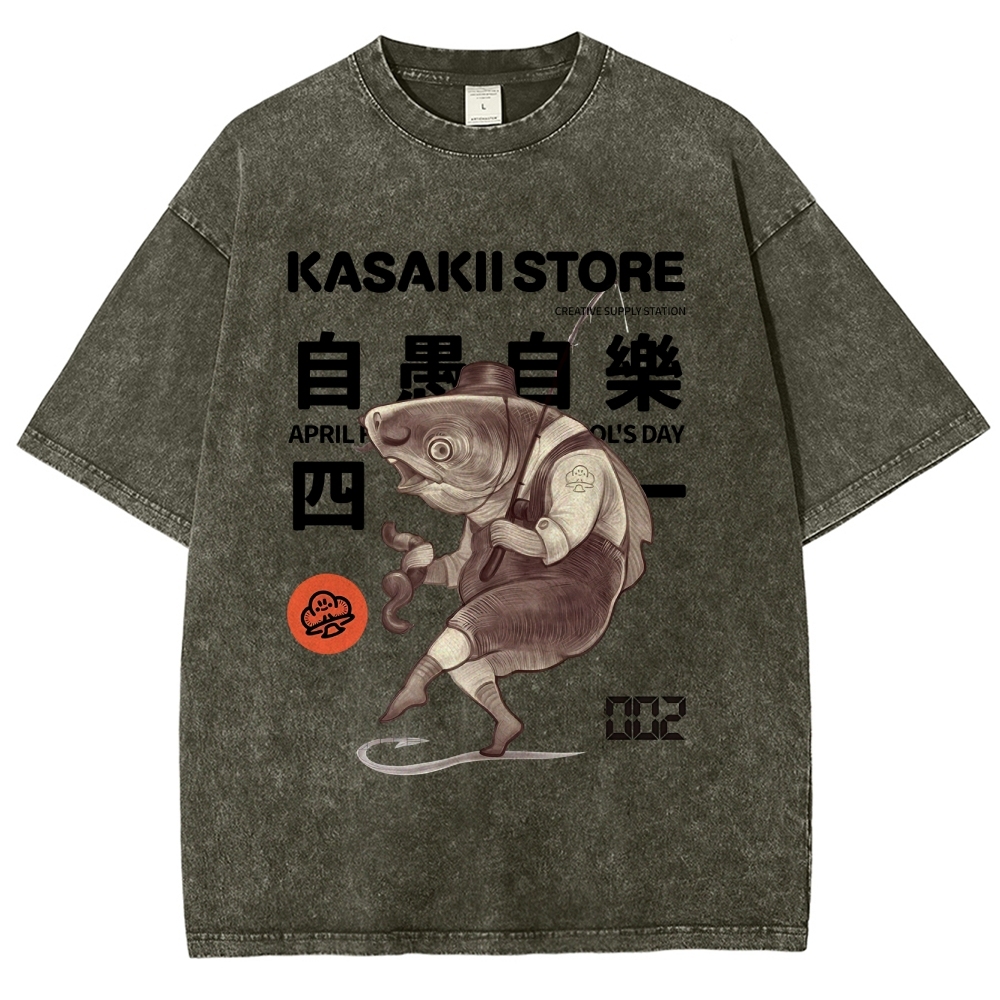 Fishing Shark Man Washed Vintage Short Sleeves T-Shirt