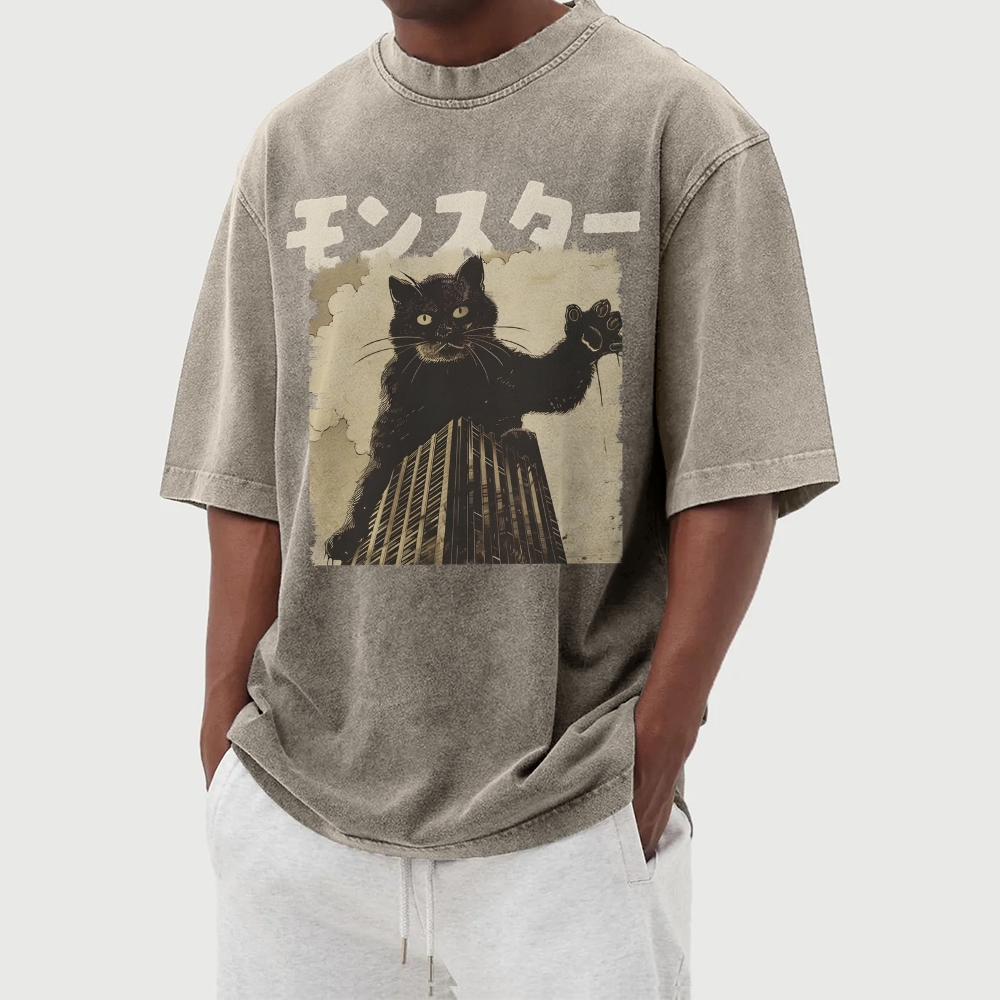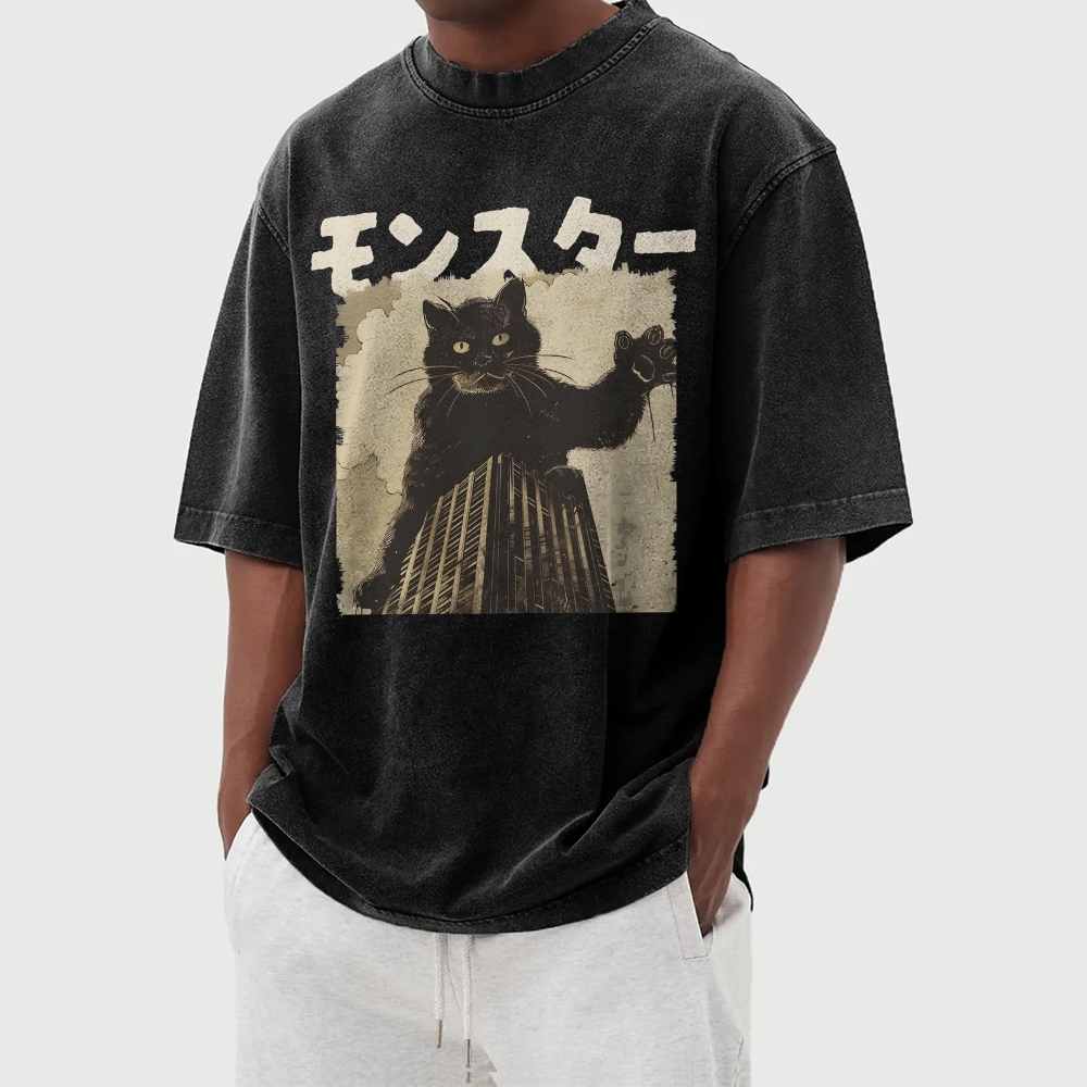 Giant Black Cat Pattern Washed Vintage Short Sleeves T-Shirt