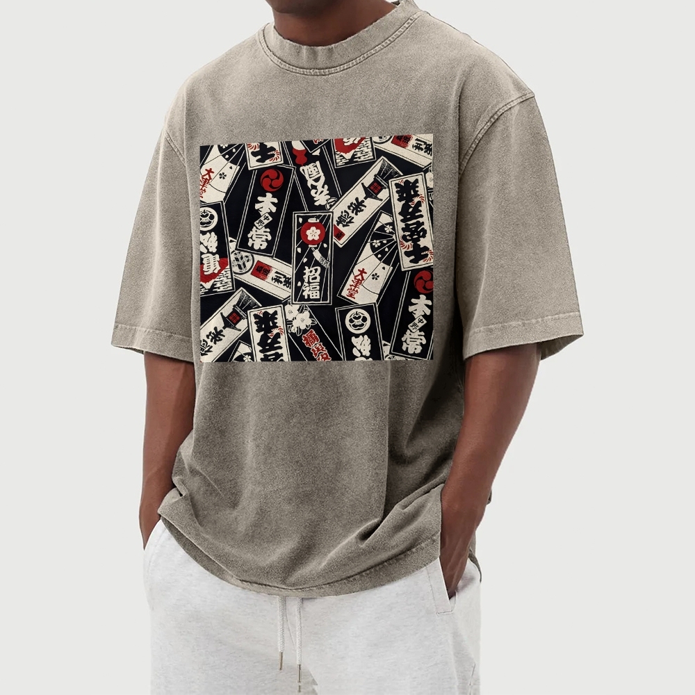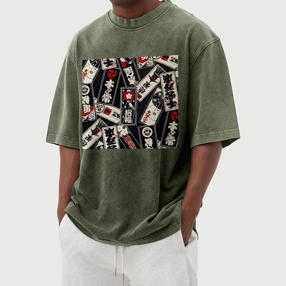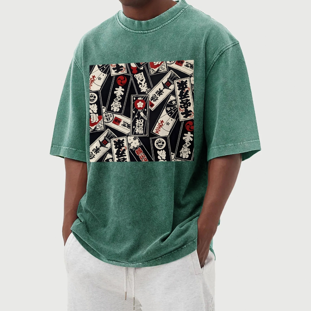 Japan Card Pattern Washed Vintage Short Sleeves T-Shirt