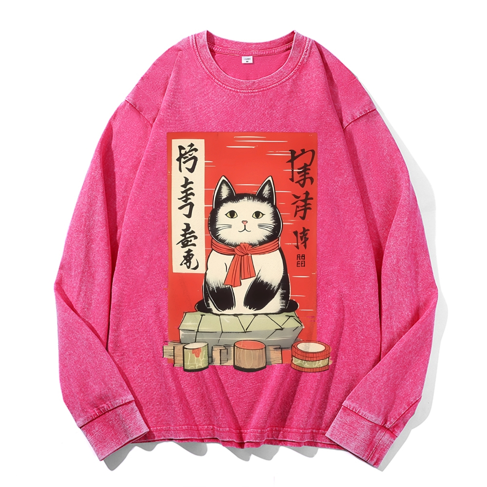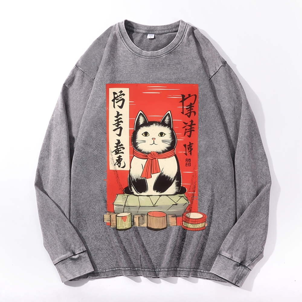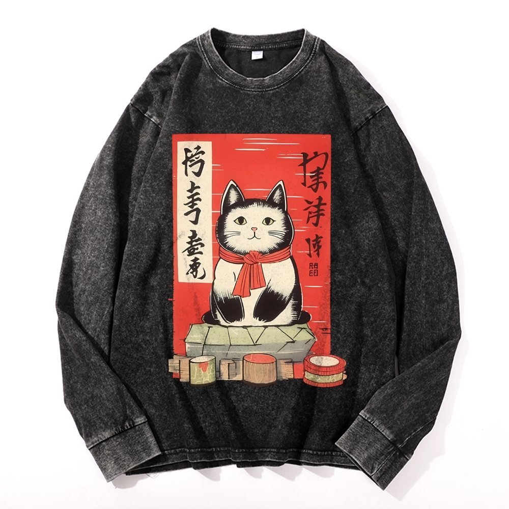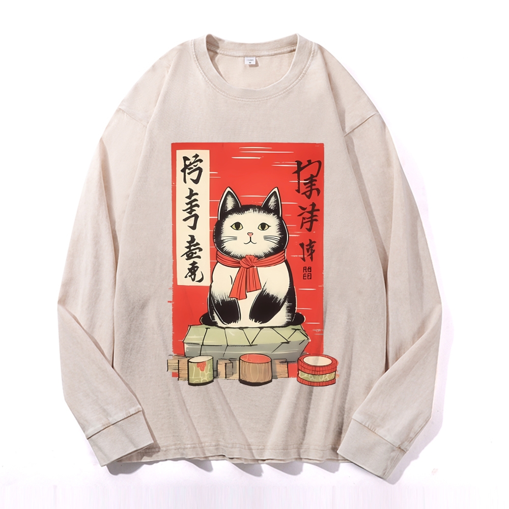 Japan Cat Painting Deep Washed Vintage Long Sleeves T-Shirt