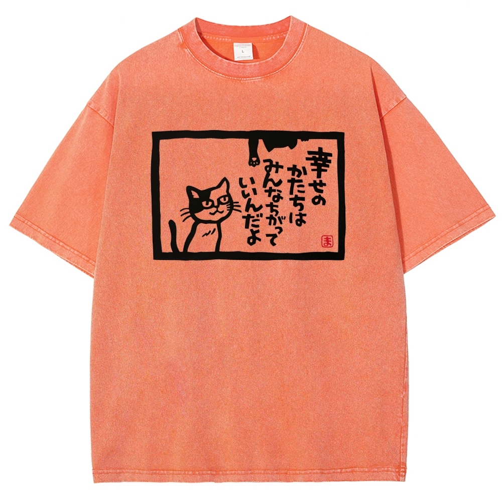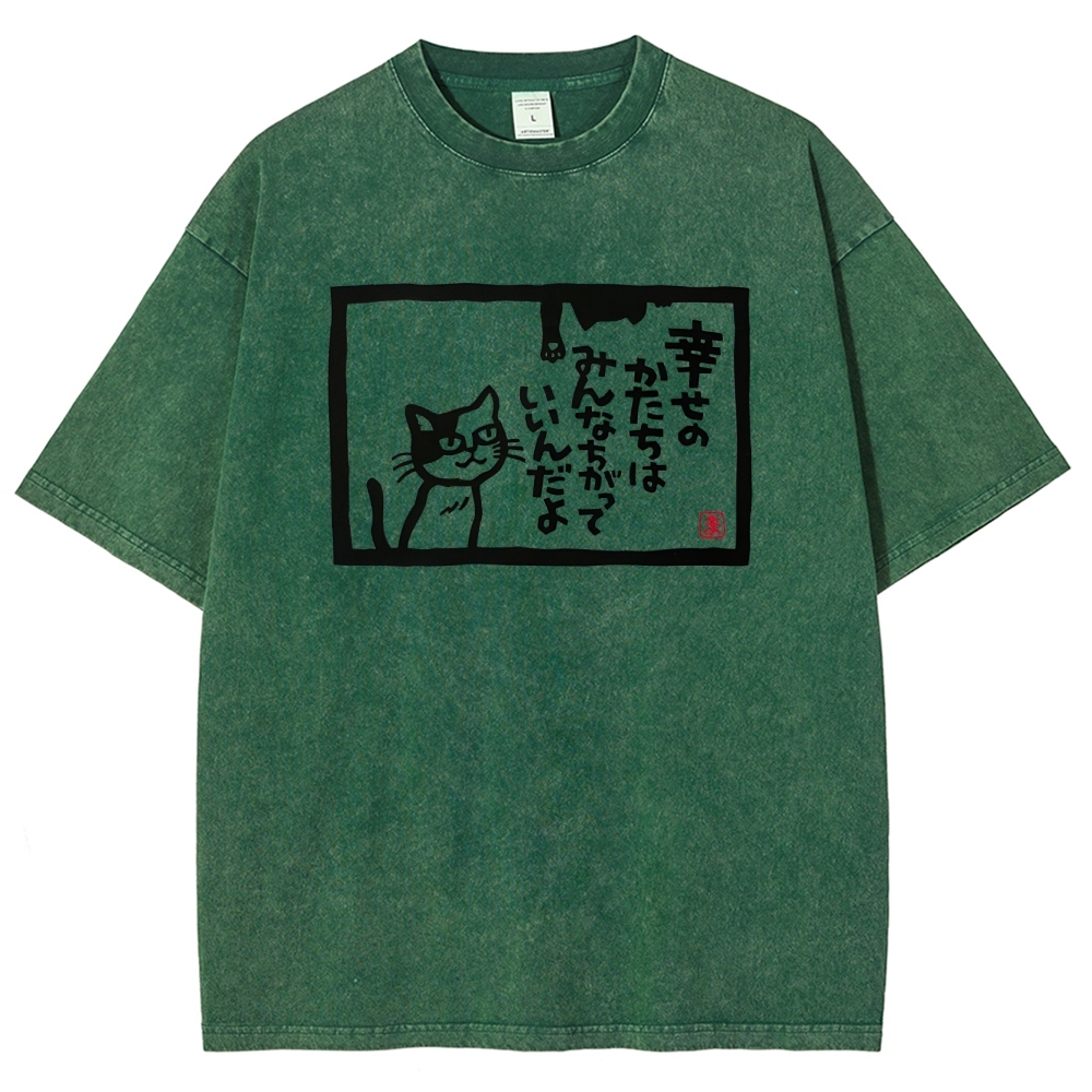 Japanese Cat Pattern Washed Vintage Short Sleeves T-Shirt