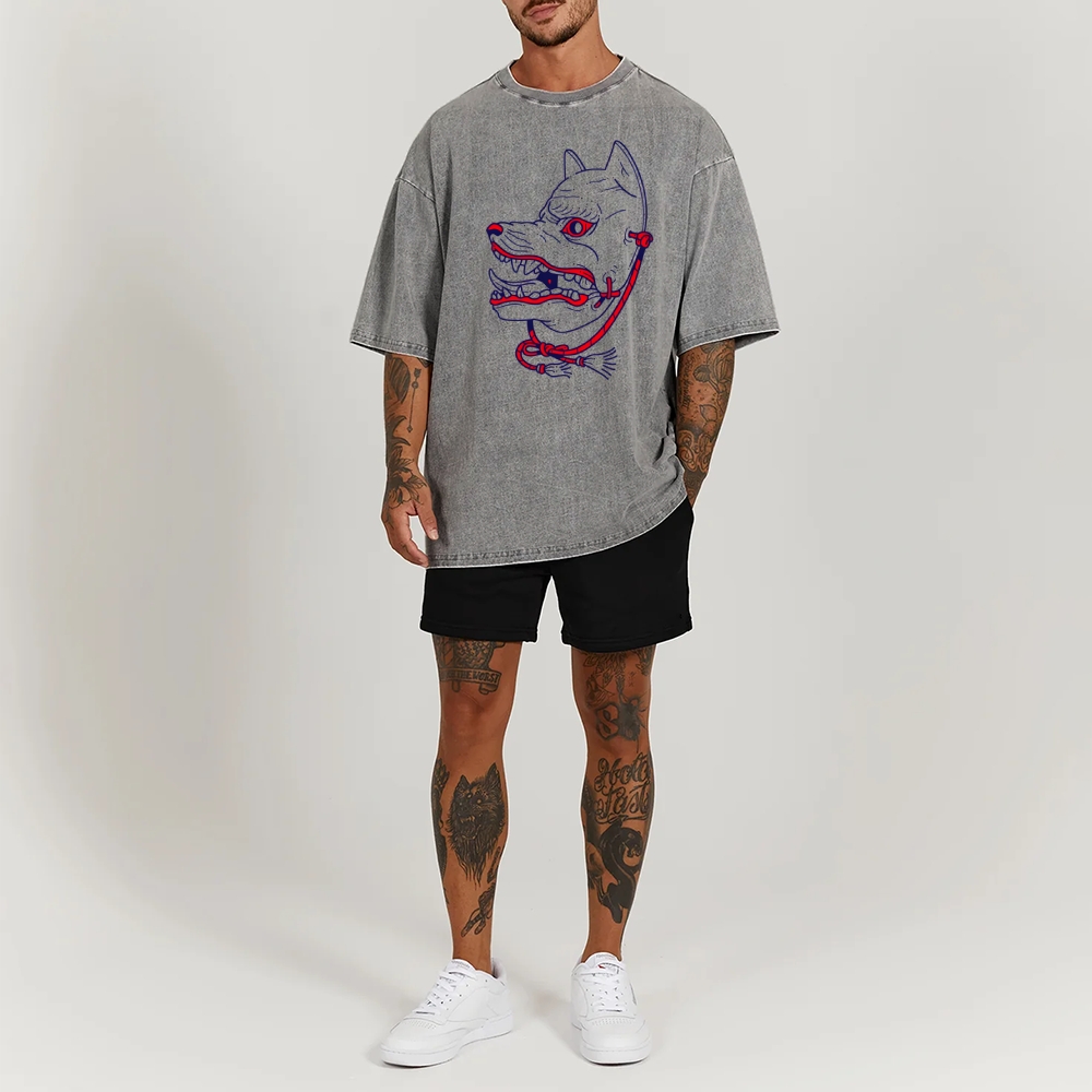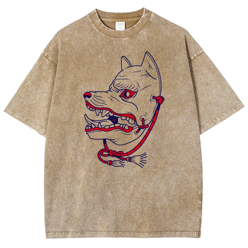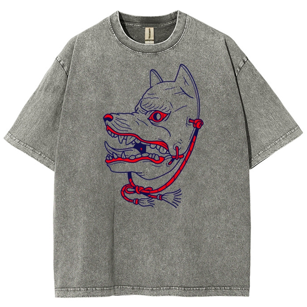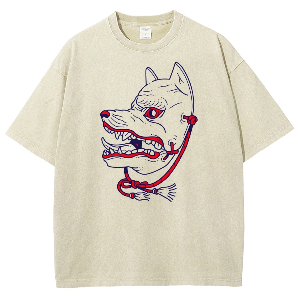 Japanese Fox Mask Printed Washed Vintage Short Sleeves T-Shirt