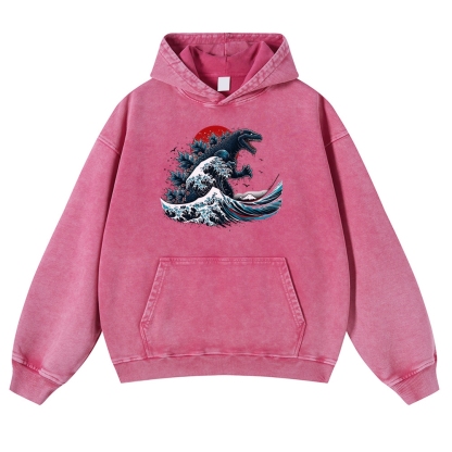 Japanese Godzilla Wave Ukiyoe Vintage Washed Hoodie