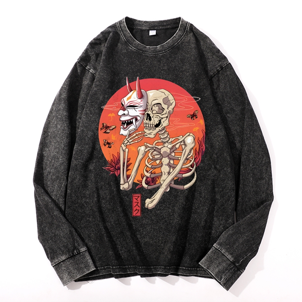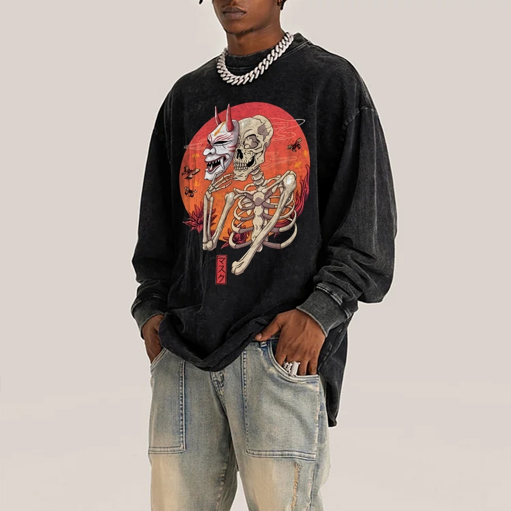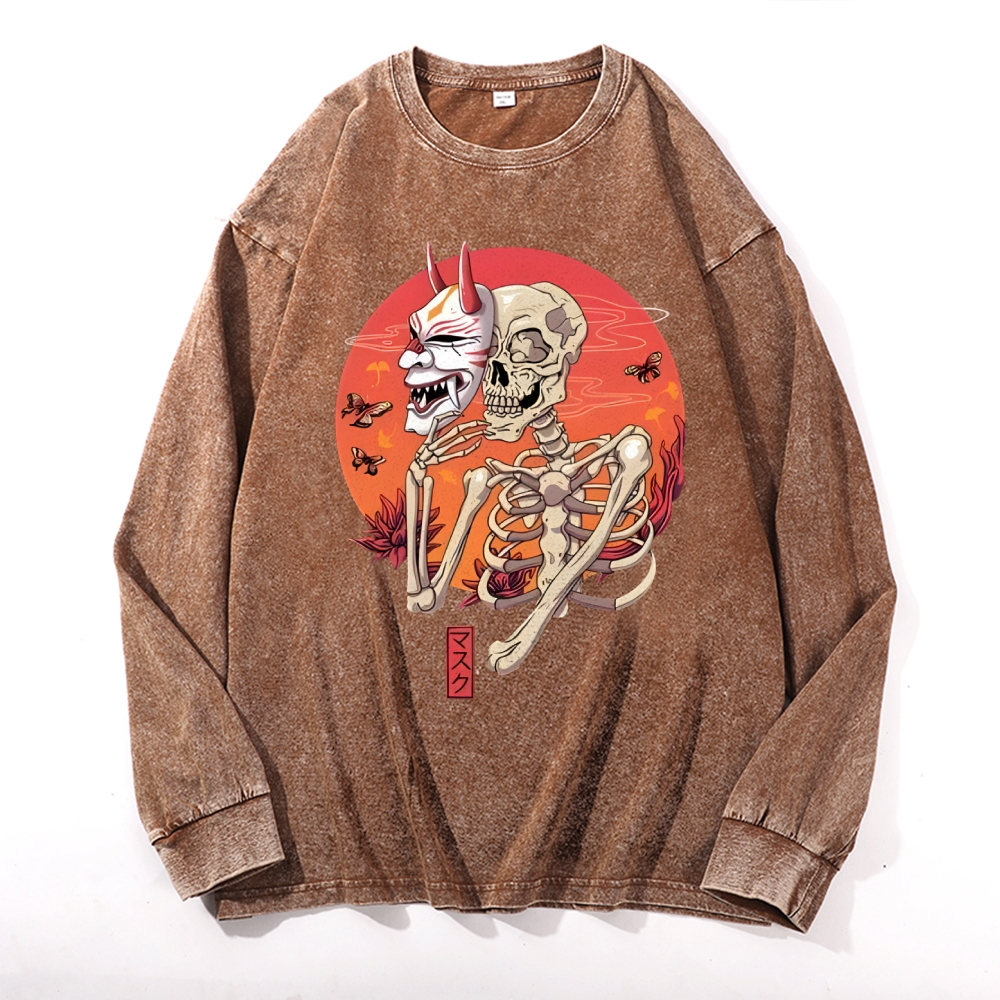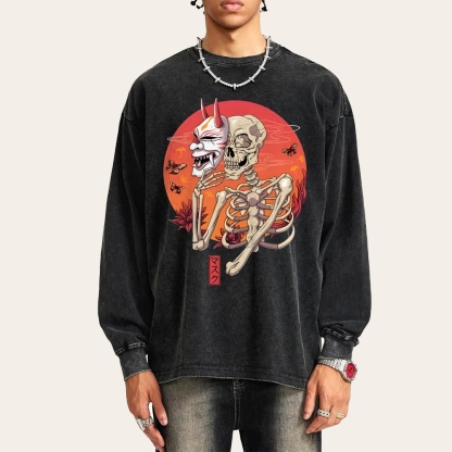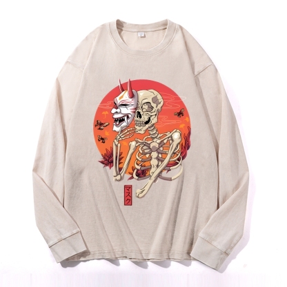 Japanese Skeleton Mask Deep Washed Vintage Long Sleeves T-Shirt