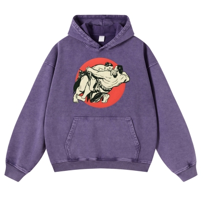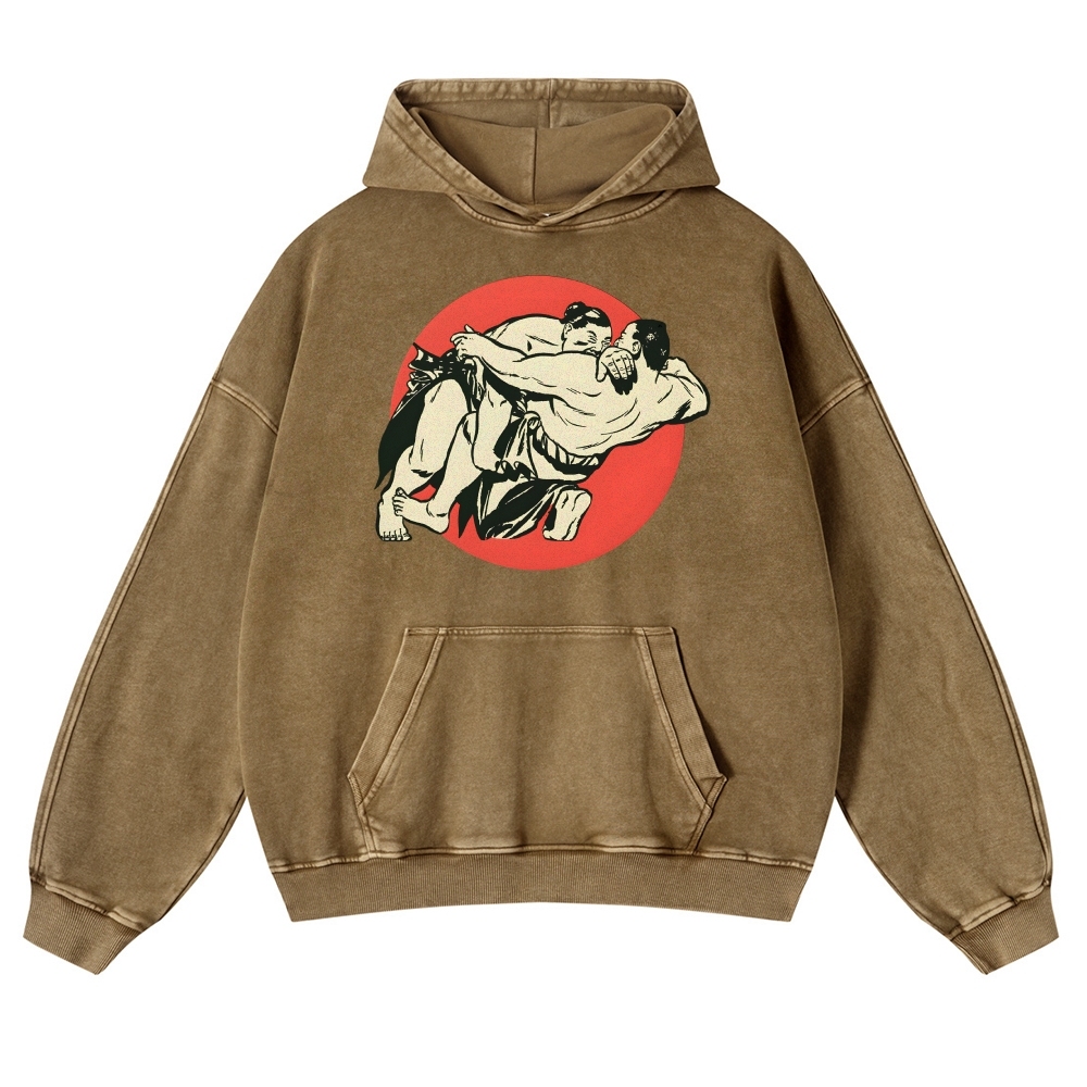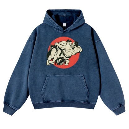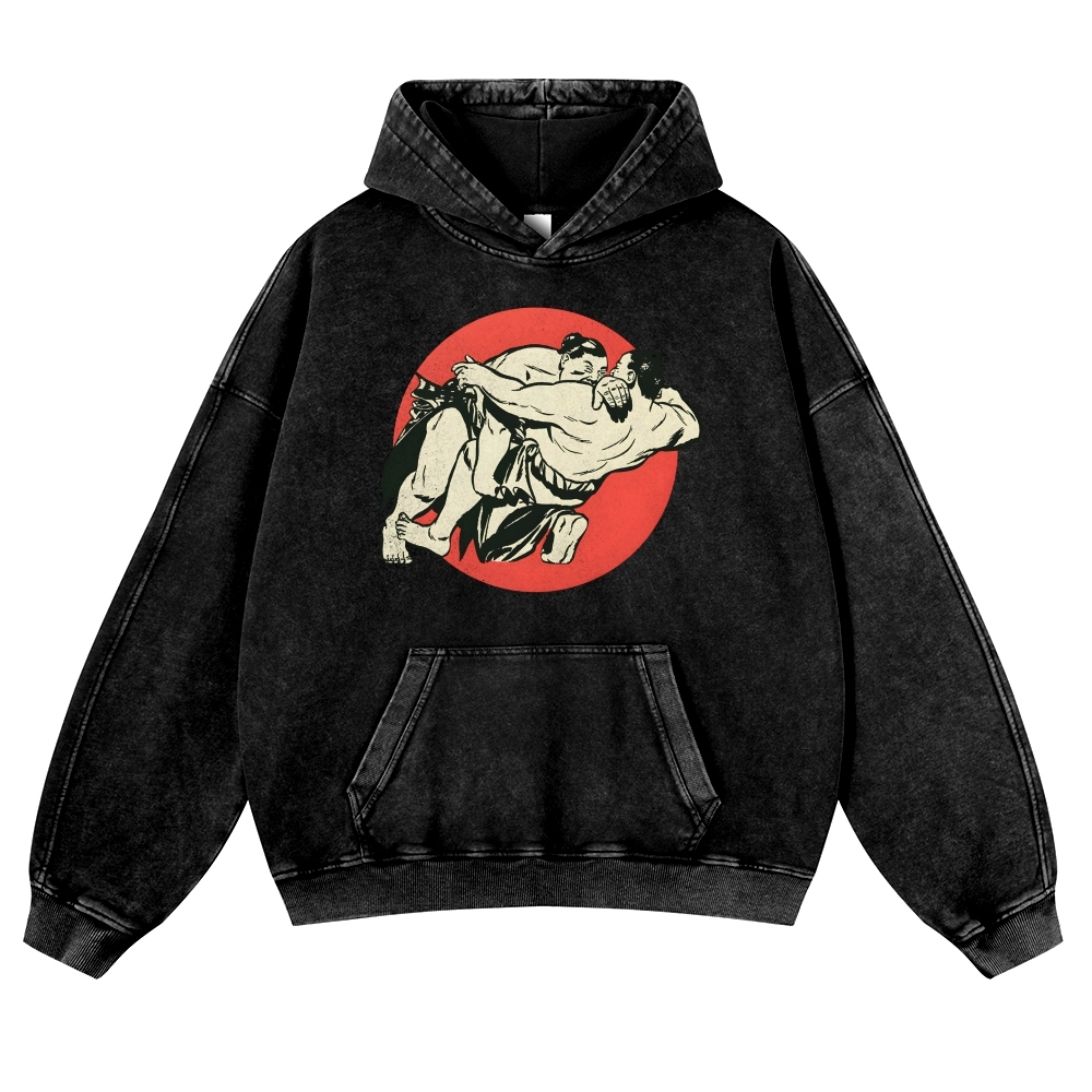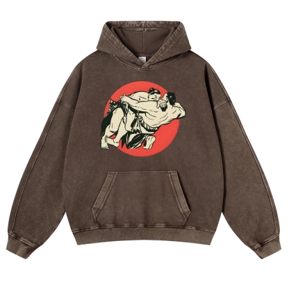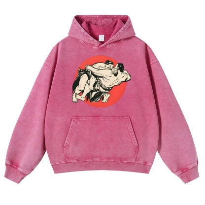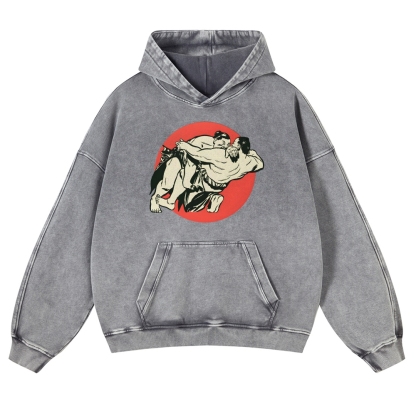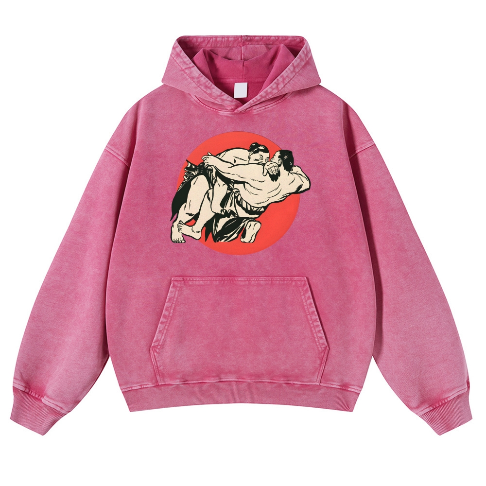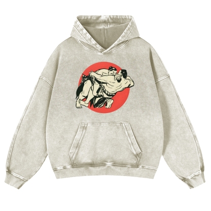 Japanese Sumo Wrestlers Pattern Vintage Washed Hoodie