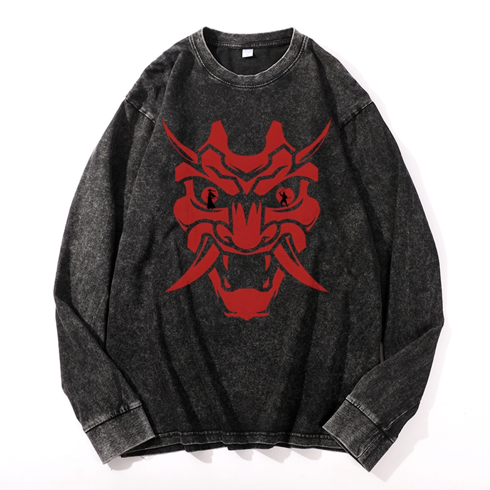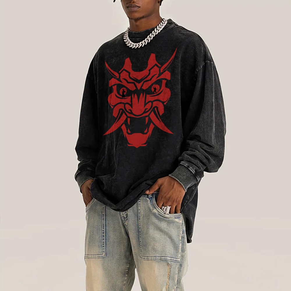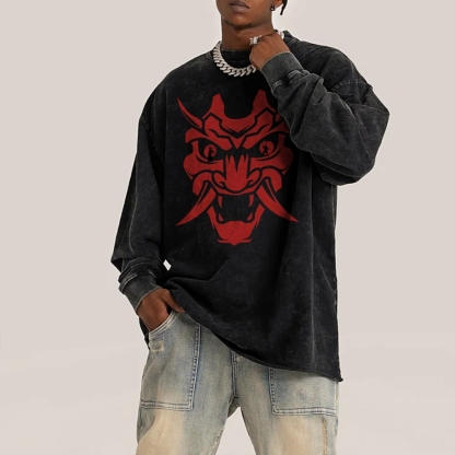 Japanese Traditional Mask Pattern Deep Washed Vintage Long Sleeves T-Shirt