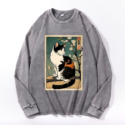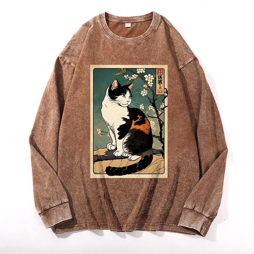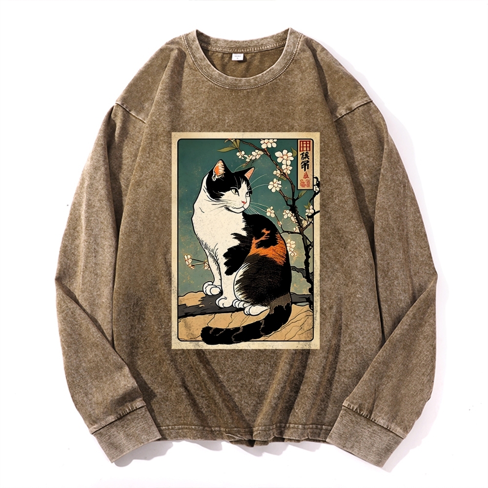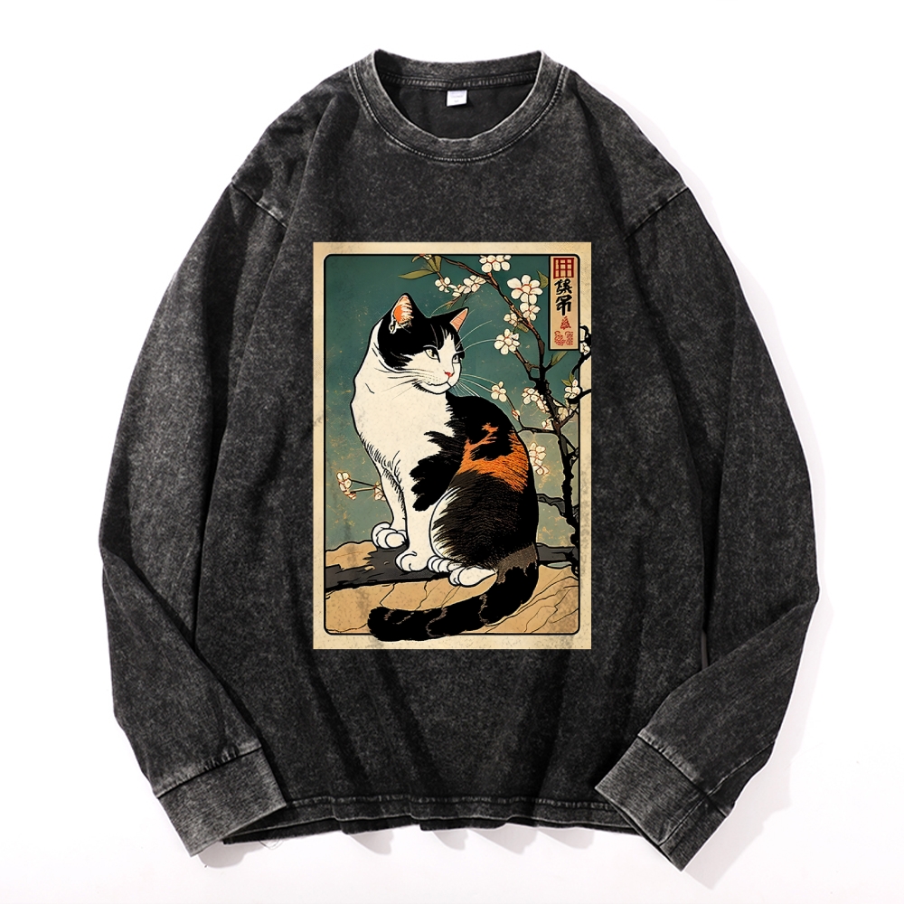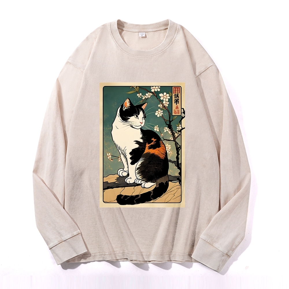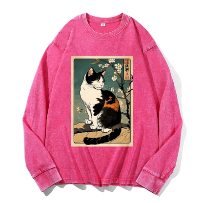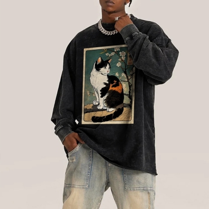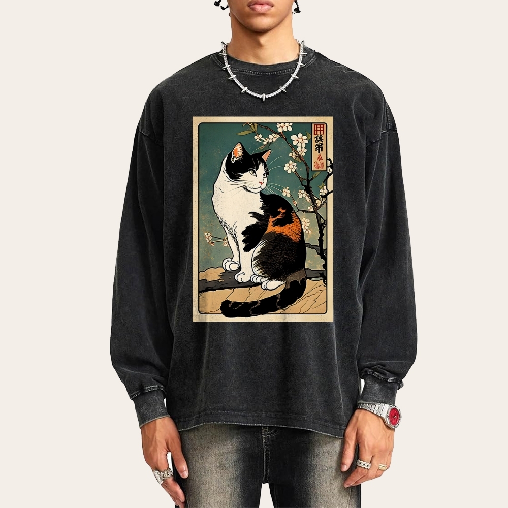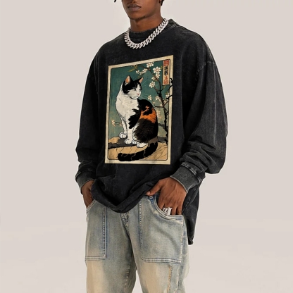 Japanese Ukiyoe Cat Pattern Deep Washed Vintage Long Sleeves T-Shirt