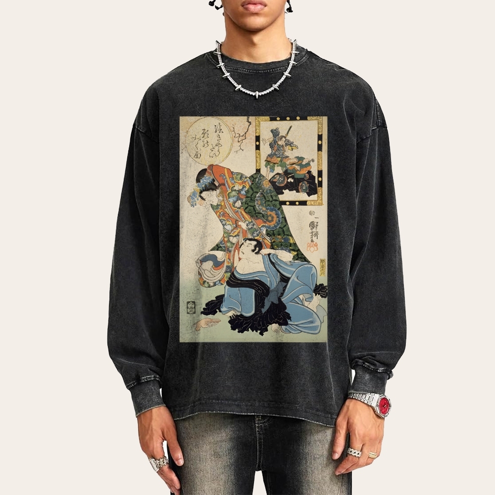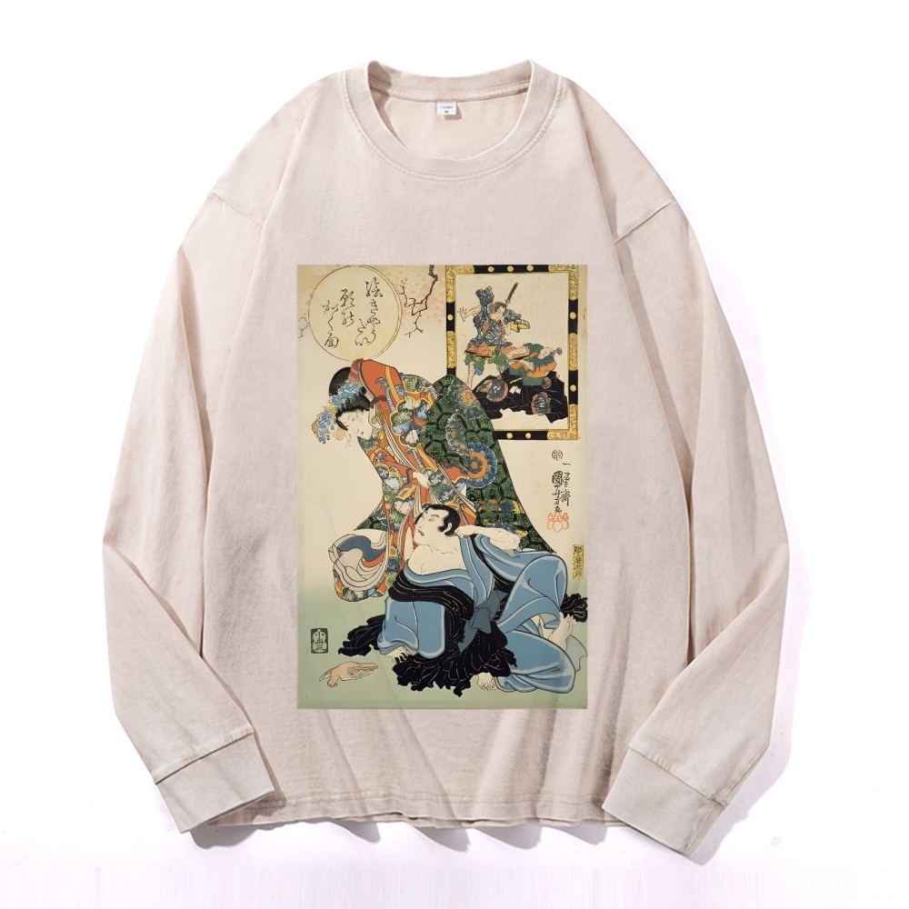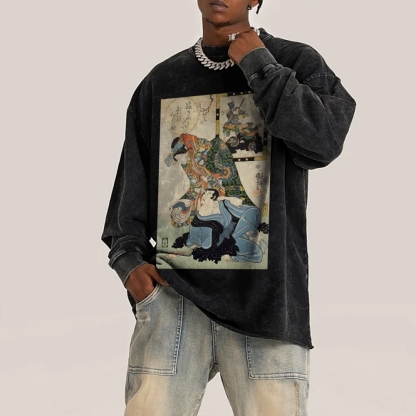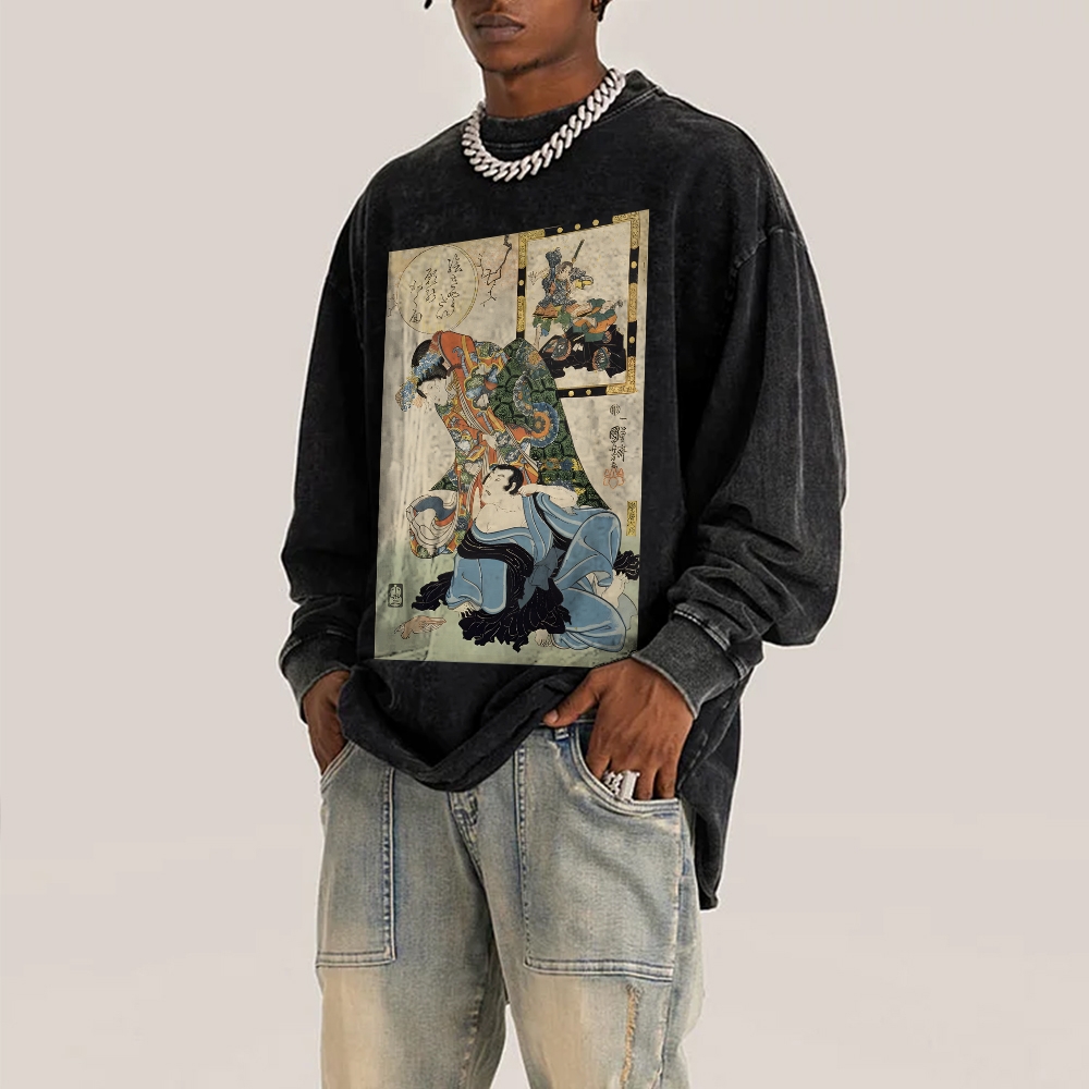 Japanese Ukiyoe Printed Casual Deep Washed Vintage Long Sleeves T-Shirt