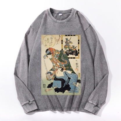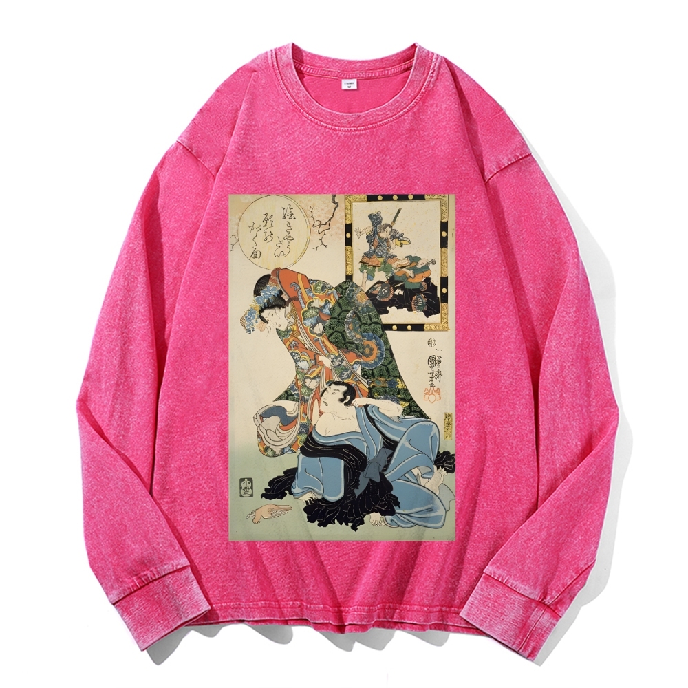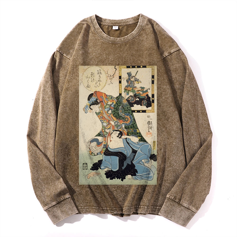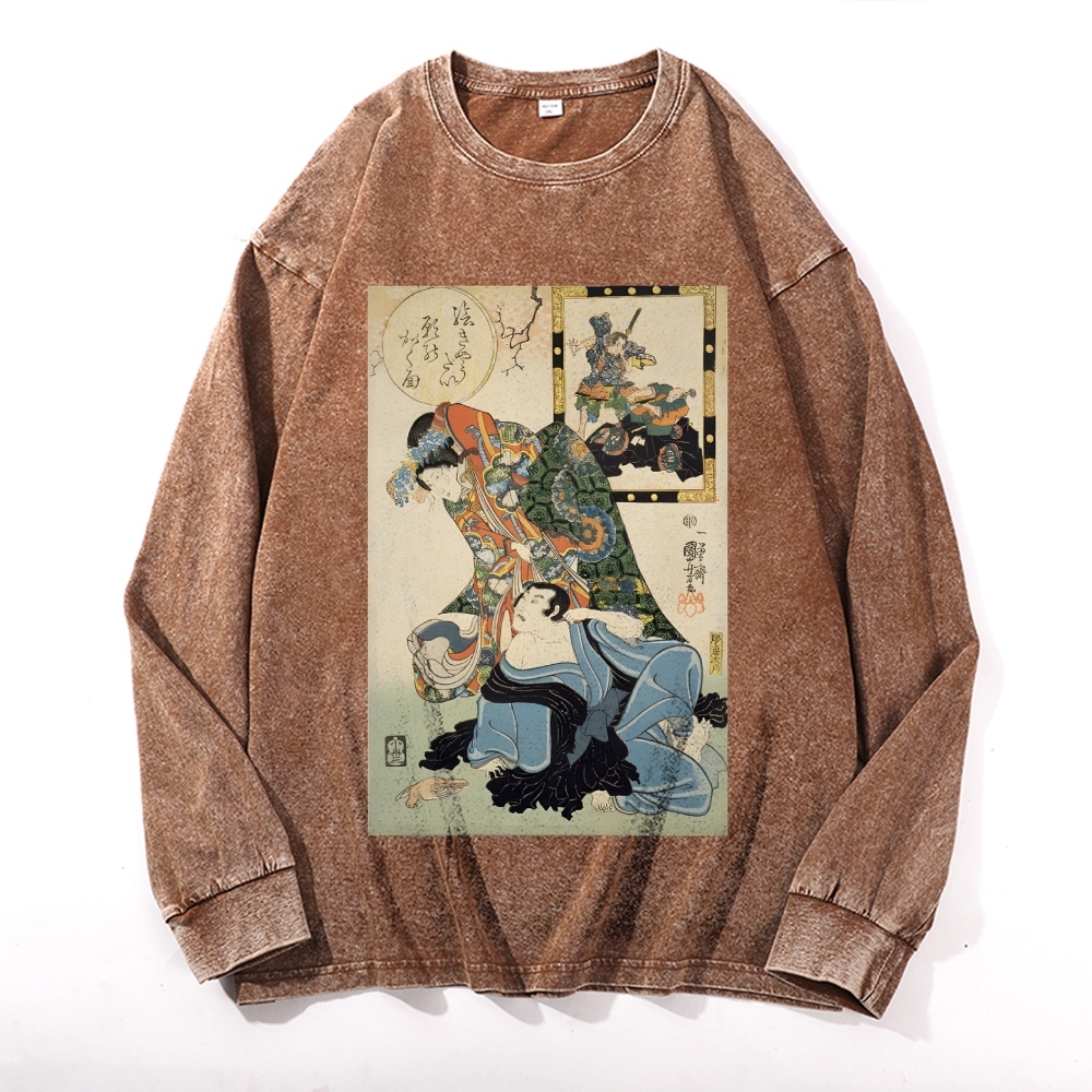 Japanese Ukiyoe Printed Casual Deep Washed Vintage Long Sleeves T-Shirt