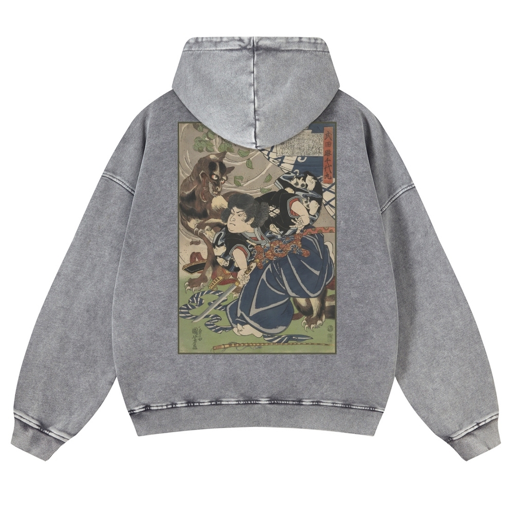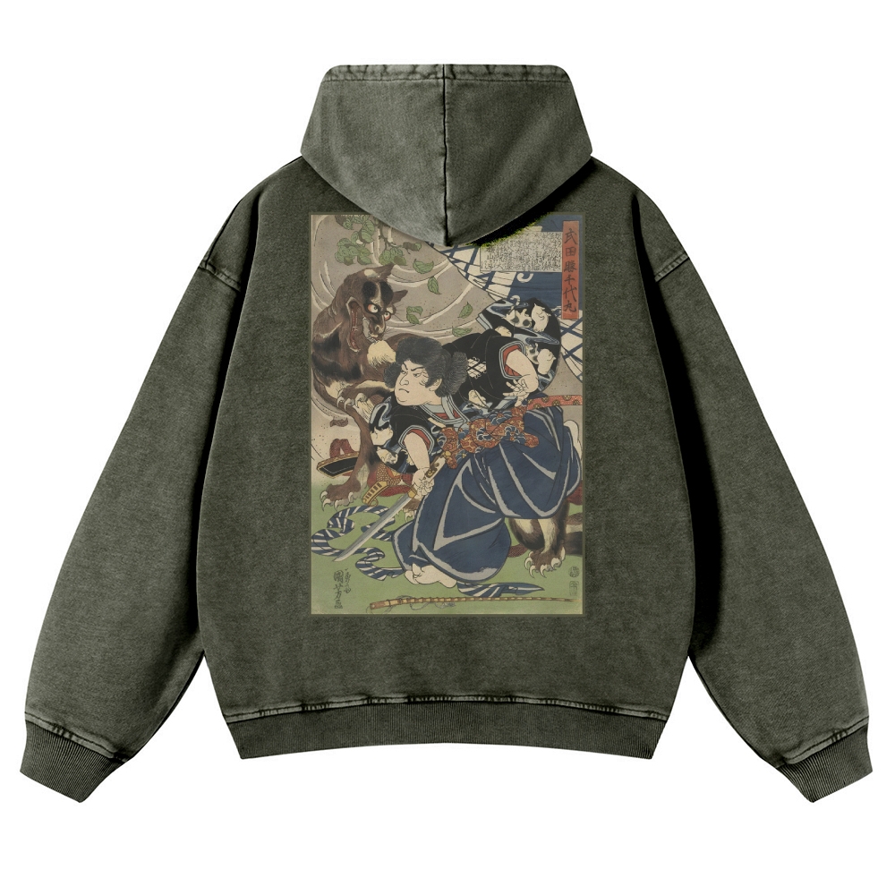 Japanese Warrior Pattern Ukiyoe Vintage Washed Hoodie