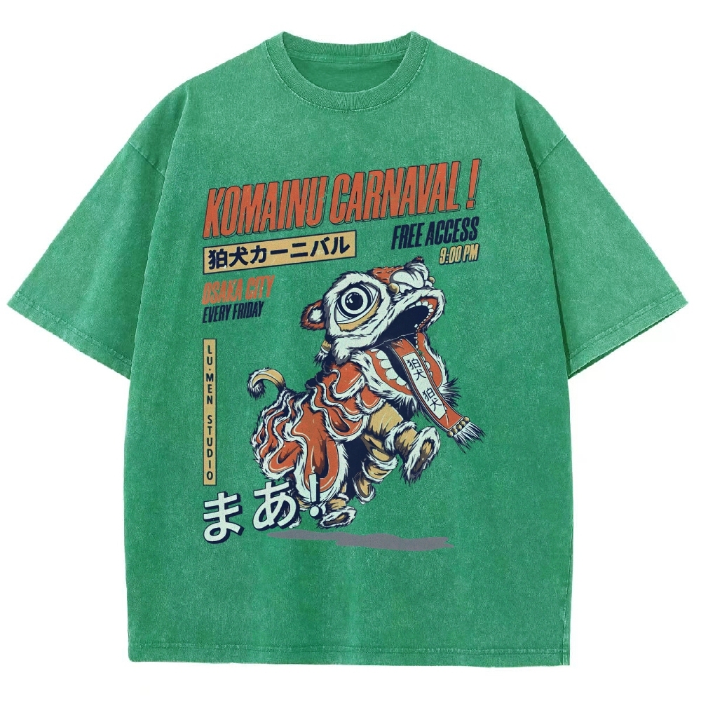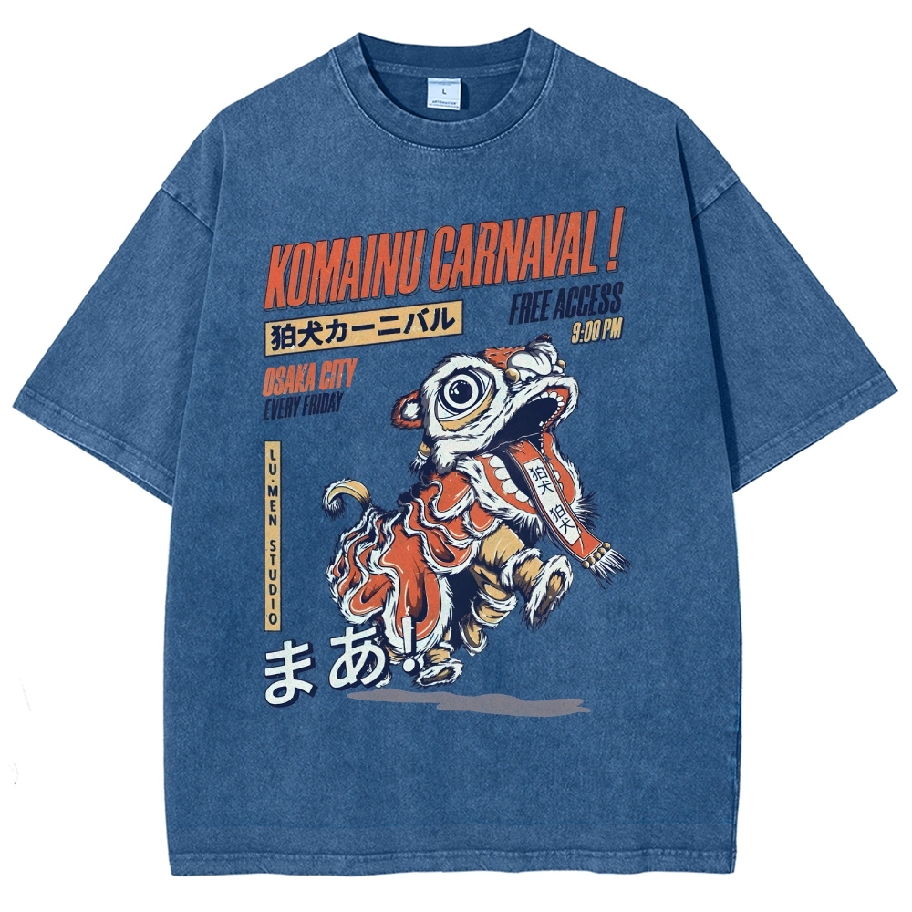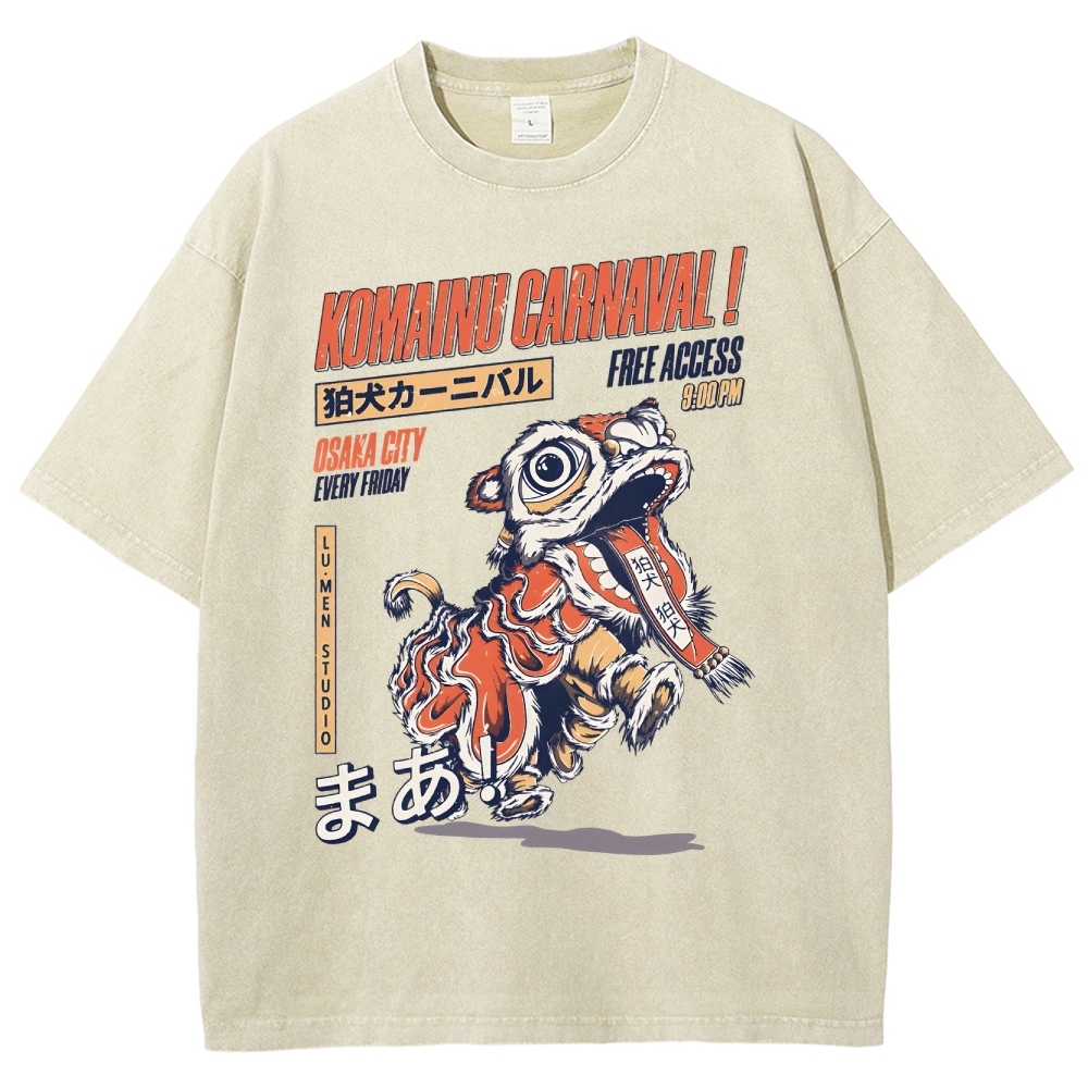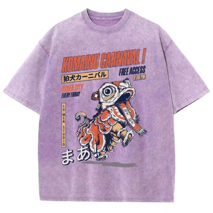 Lion Dancing Pattern Washed Vintage Short Sleeves T-Shirt