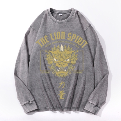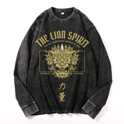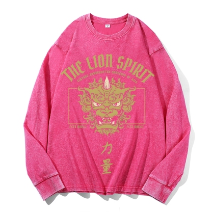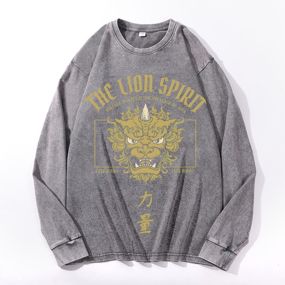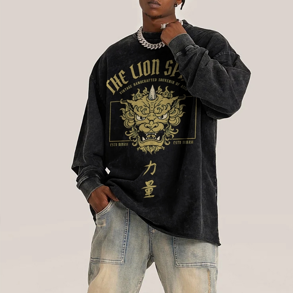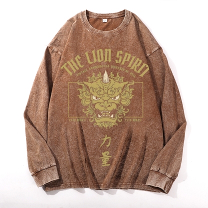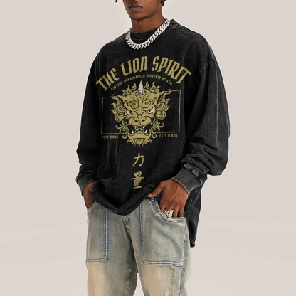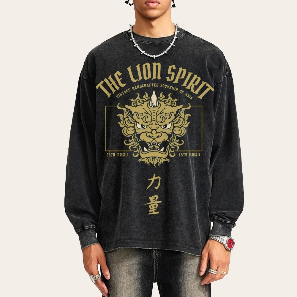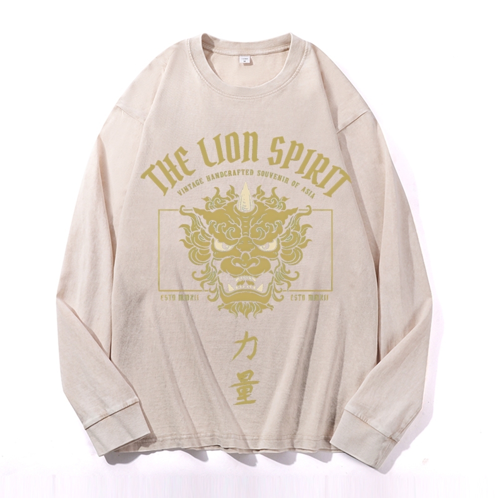 Lion Power Pattern Deep Washed Vintage Long Sleeves T-Shirt