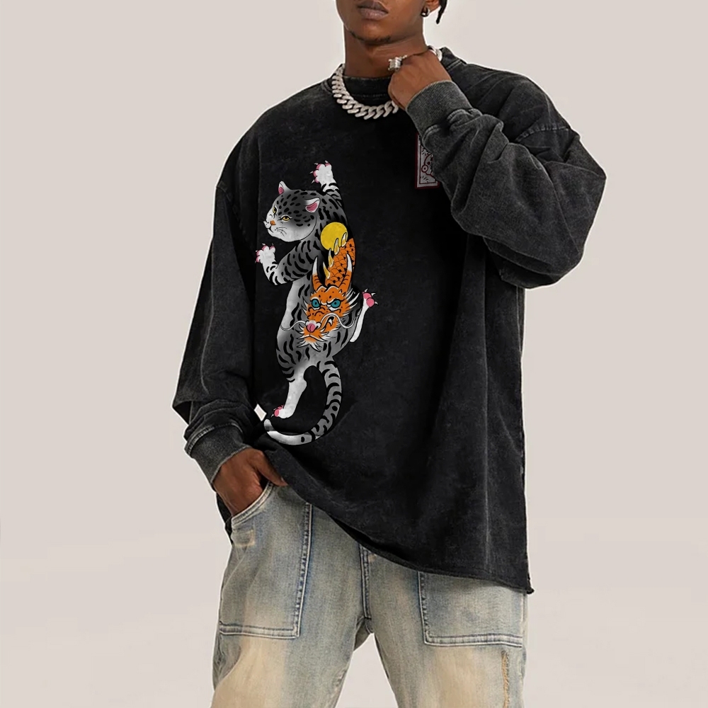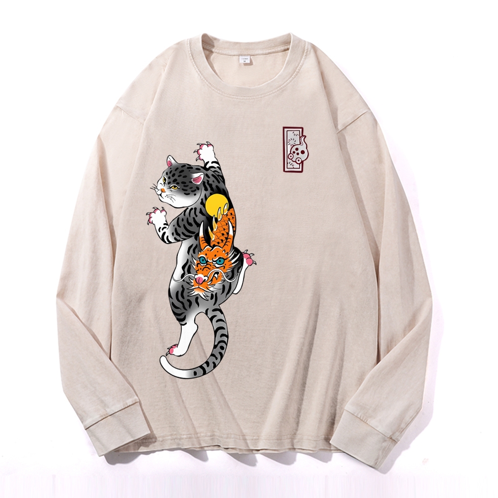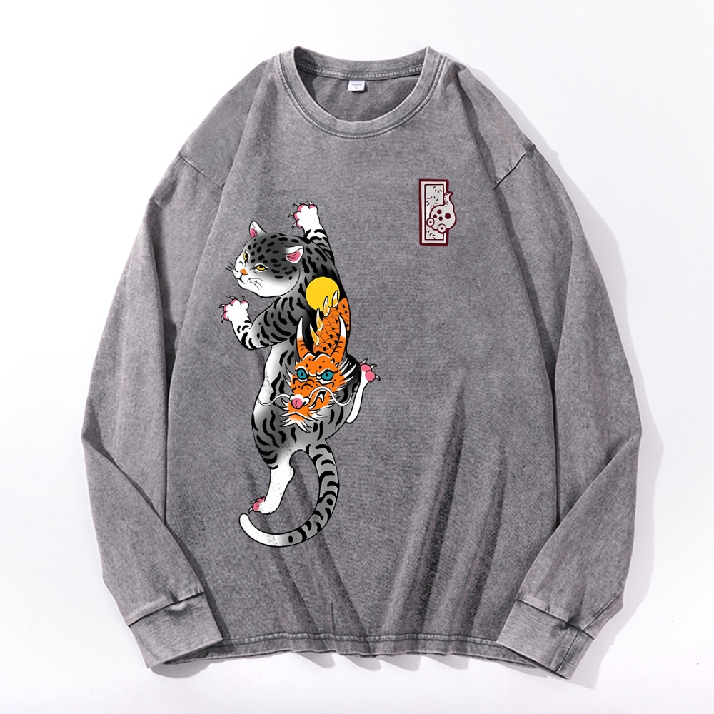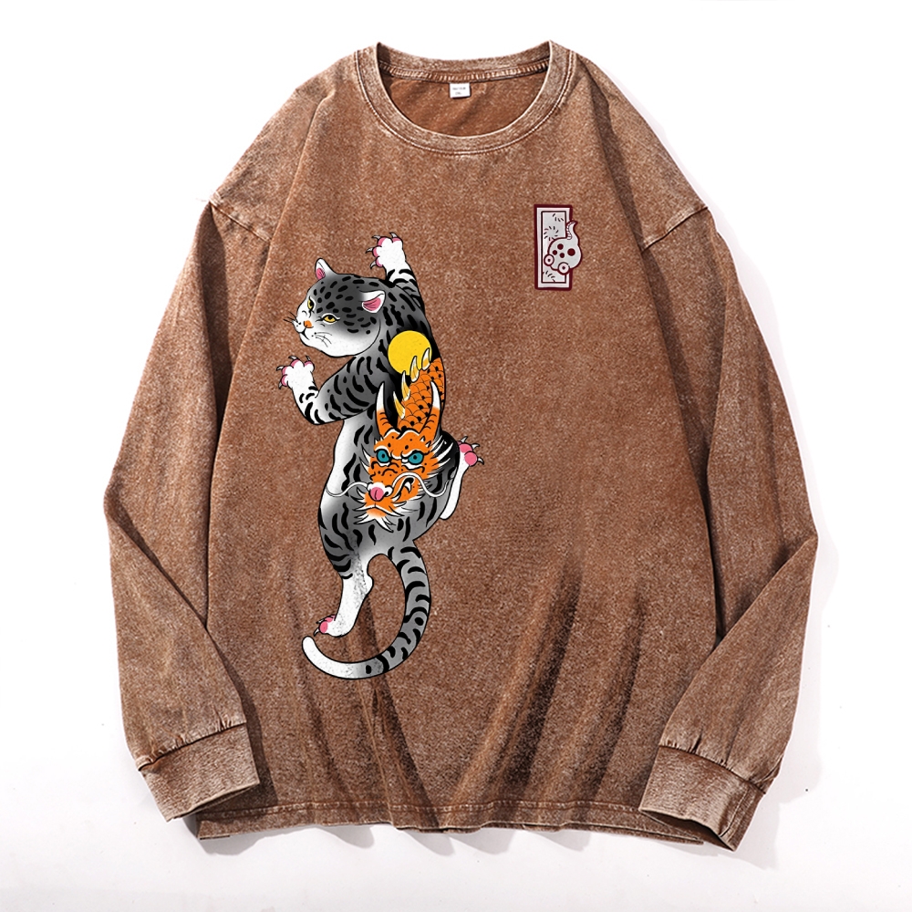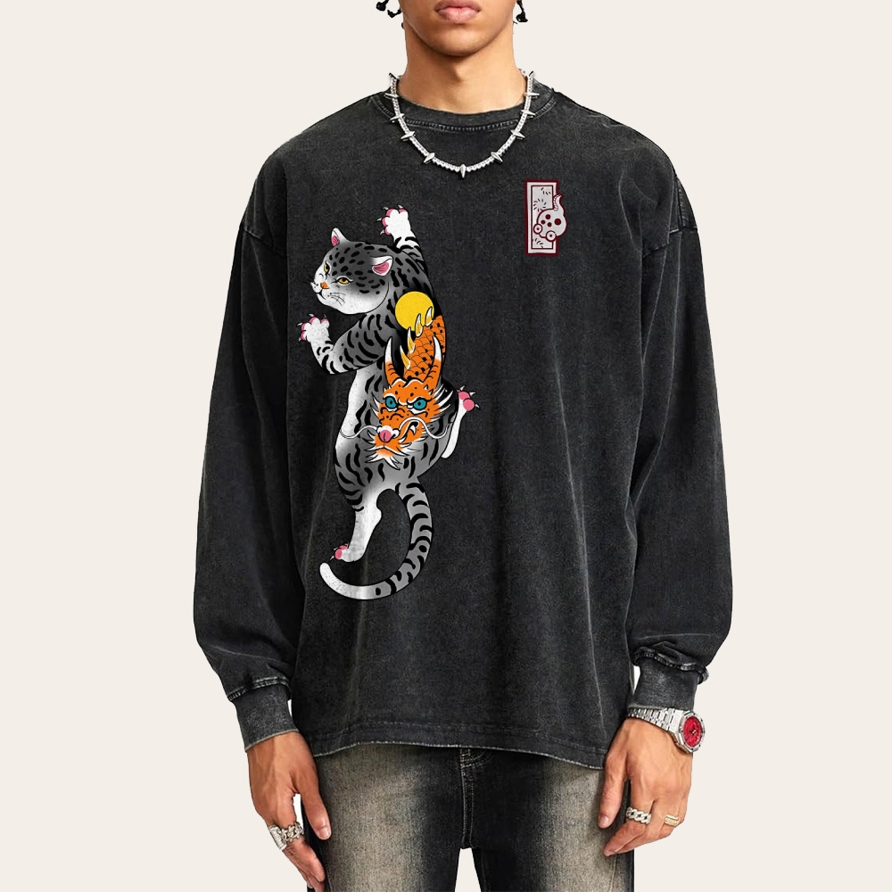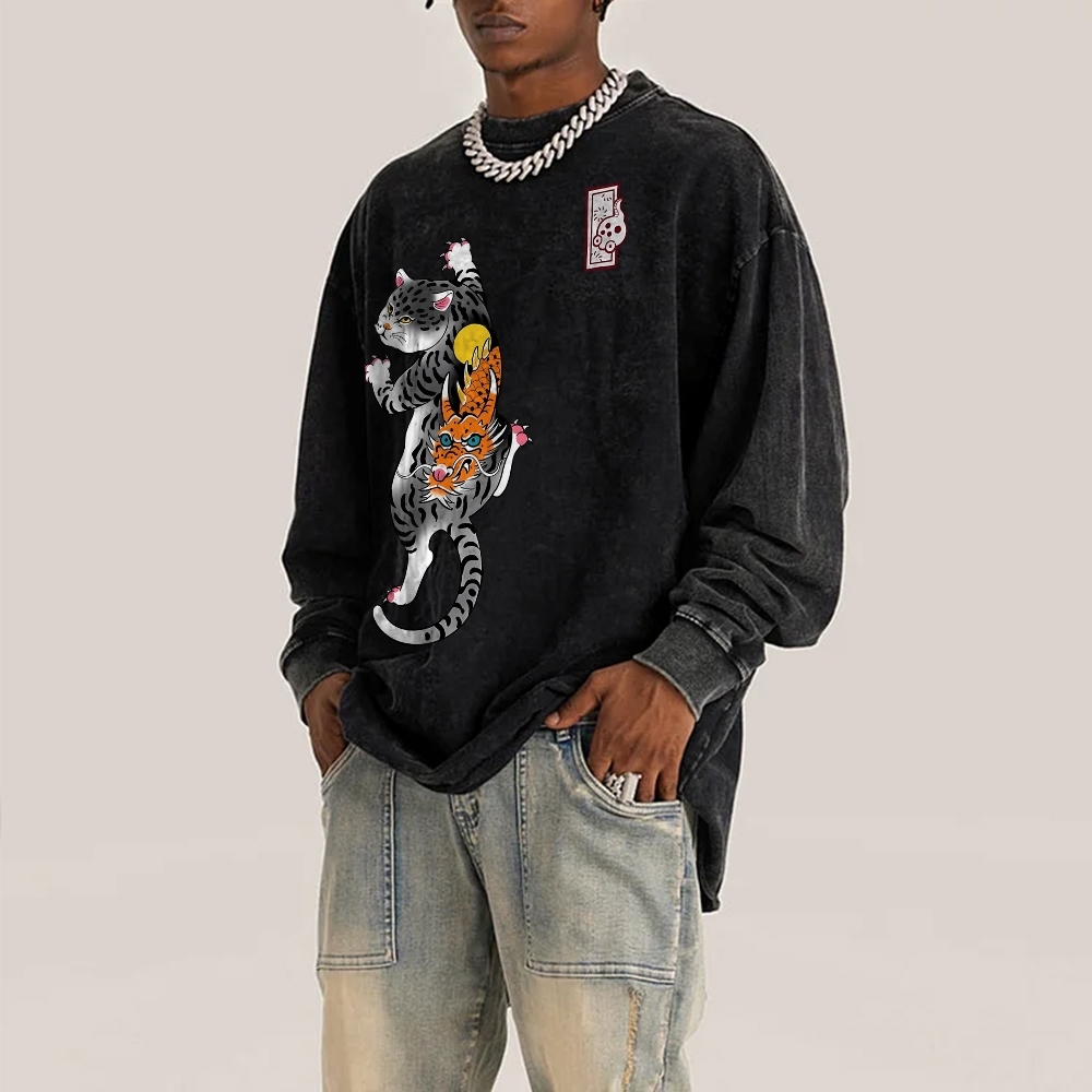 Loong Leopard Cat Pattern Deep Washed Vintage Long Sleeves T-Shirt