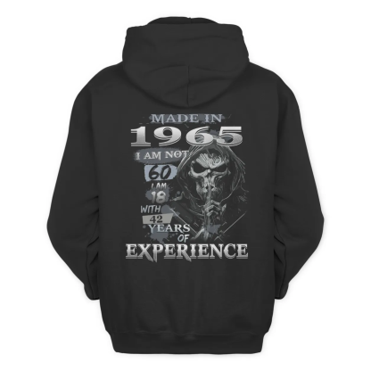 MADE IN 1965 I AM NOT 60 I AM 18 WITH 42 YEARS OF EXPERIENCE Unisex Casual Print Hoodie