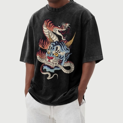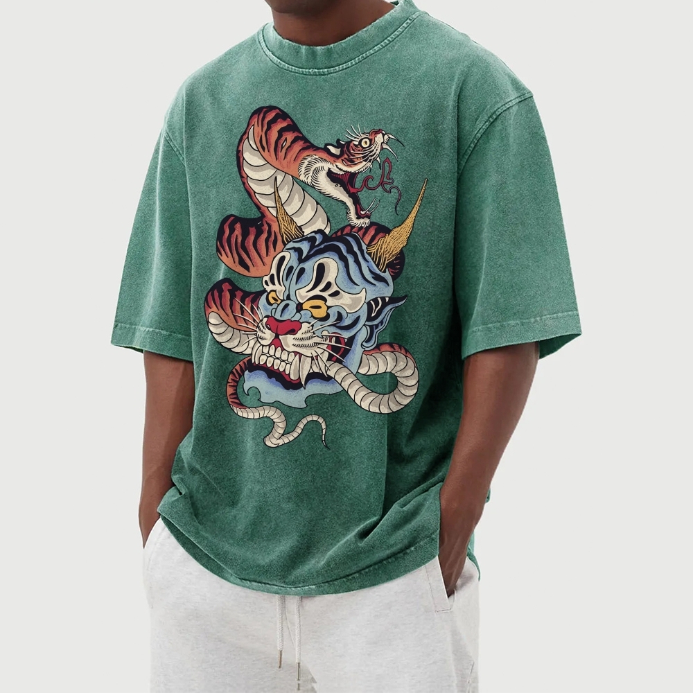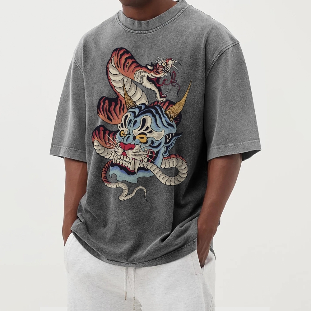 Monster And Snake Tiger Washed Vintage Short Sleeves T-Shirt
