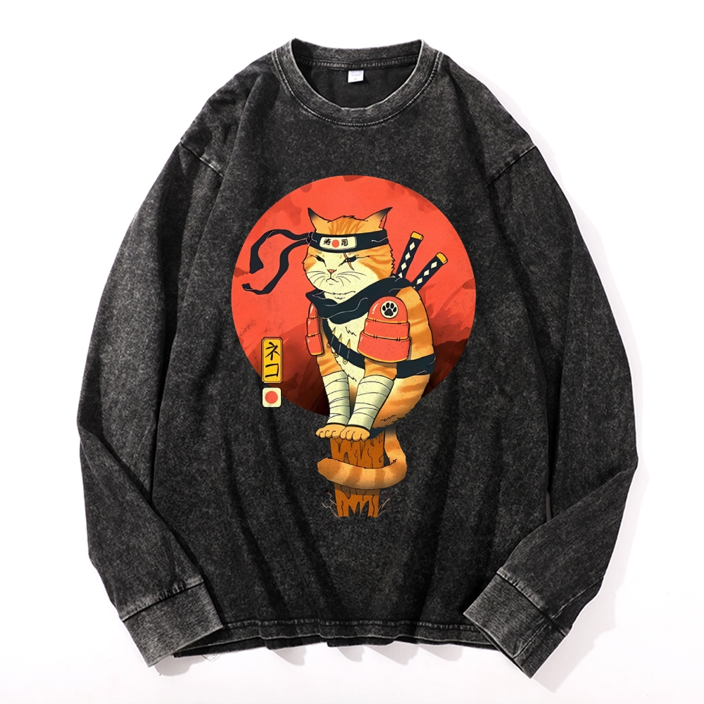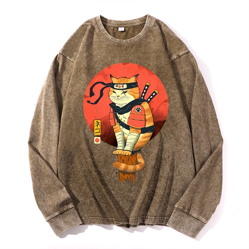 Ninja Sushi Cat Casual Deep Washed Vintage Long Sleeves T-Shirt