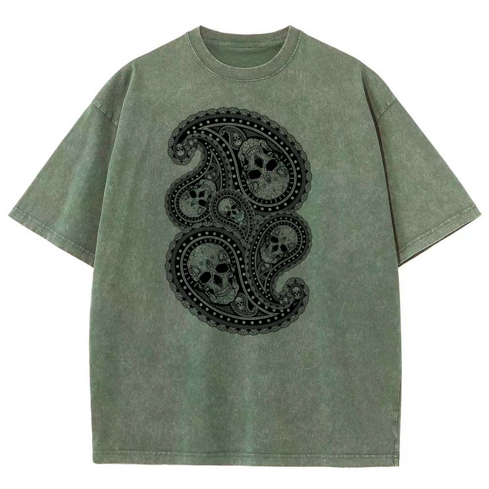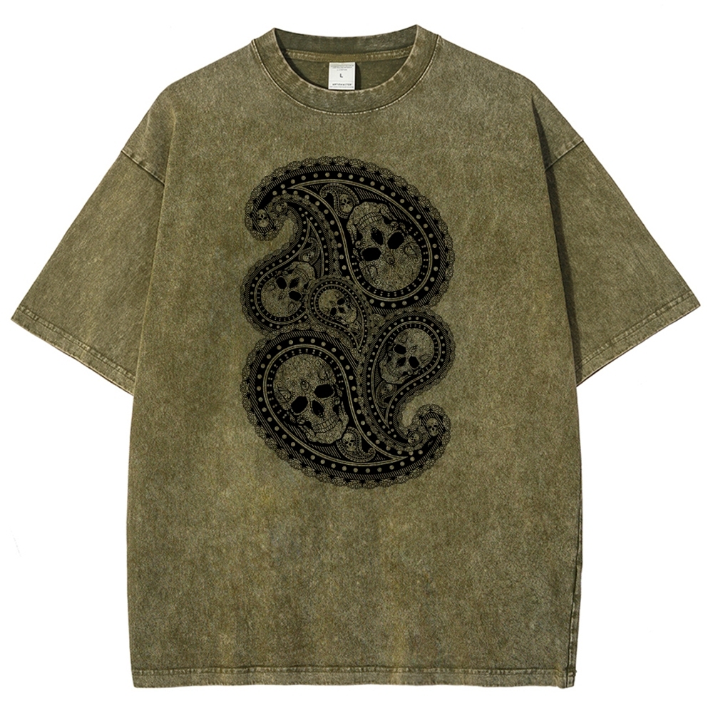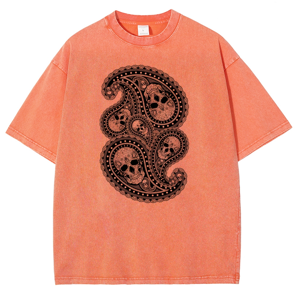 Paisley Skull Pattern Prints Washed Vintage Short Sleeves T-Shirt