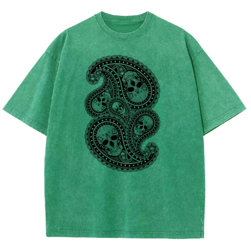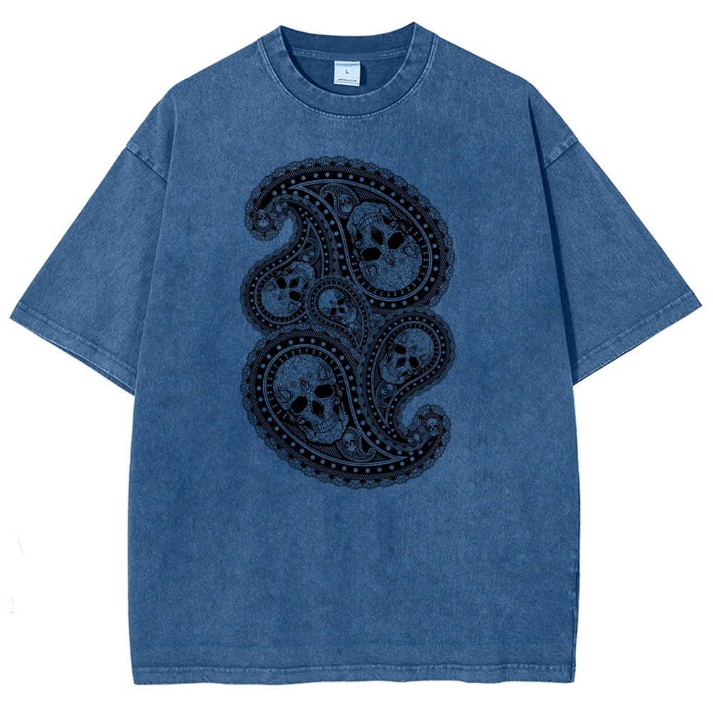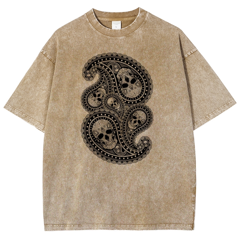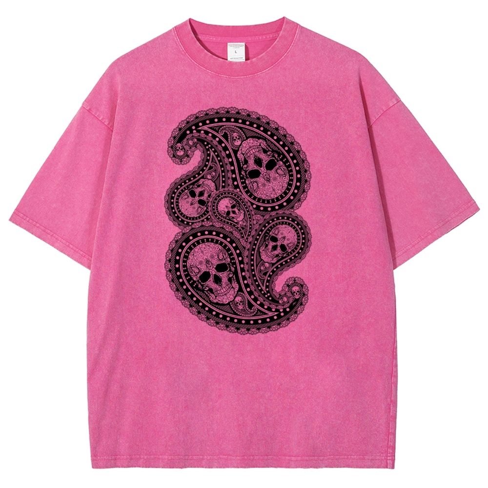 Paisley Skull Pattern Prints Washed Vintage Short Sleeves T-Shirt