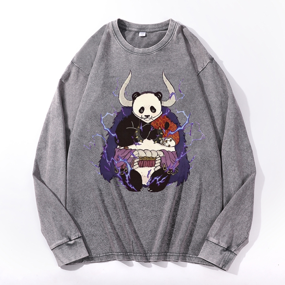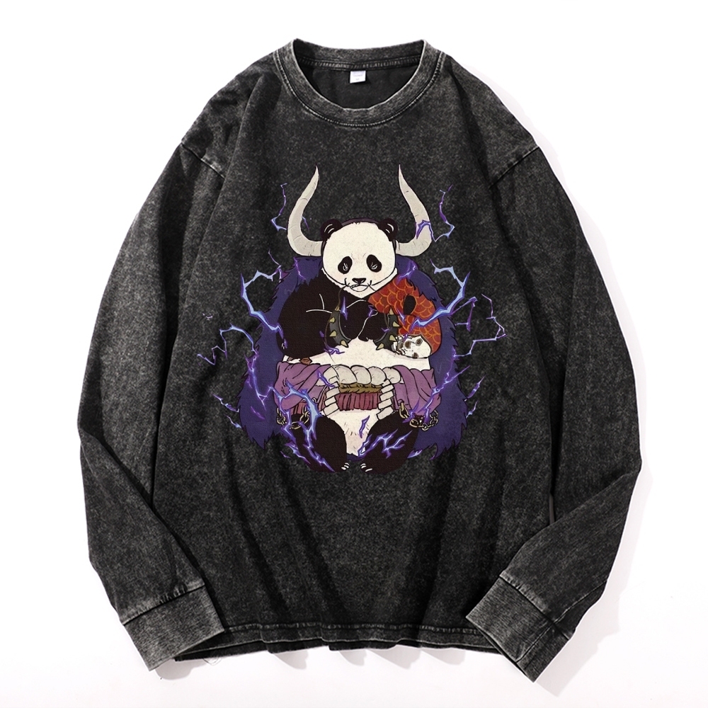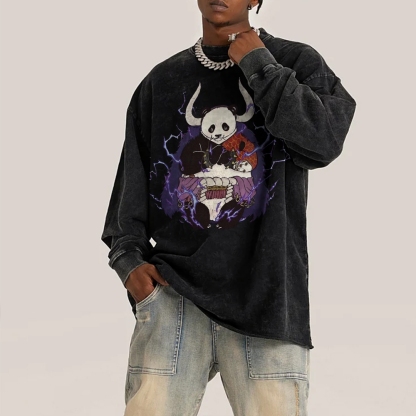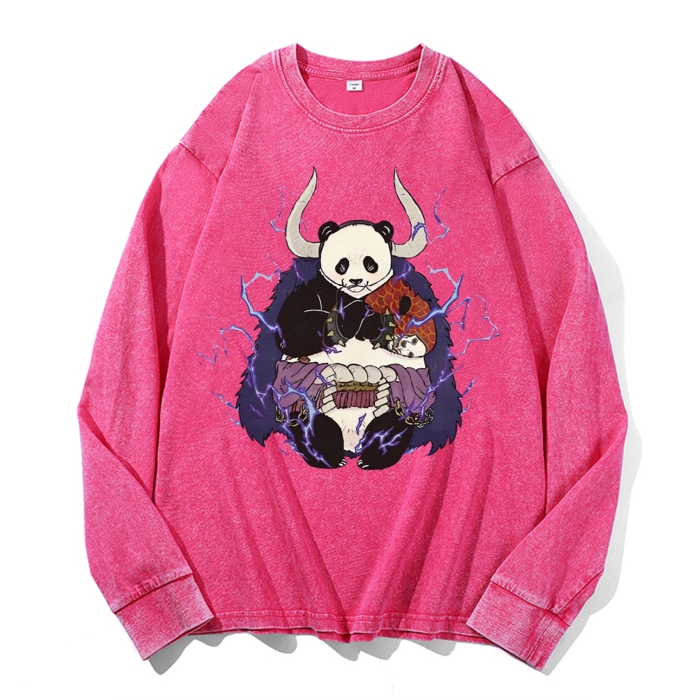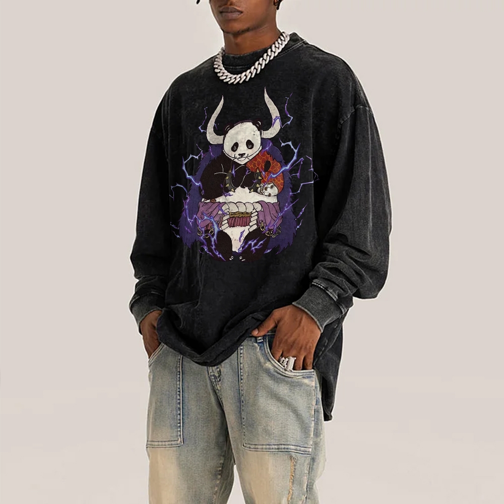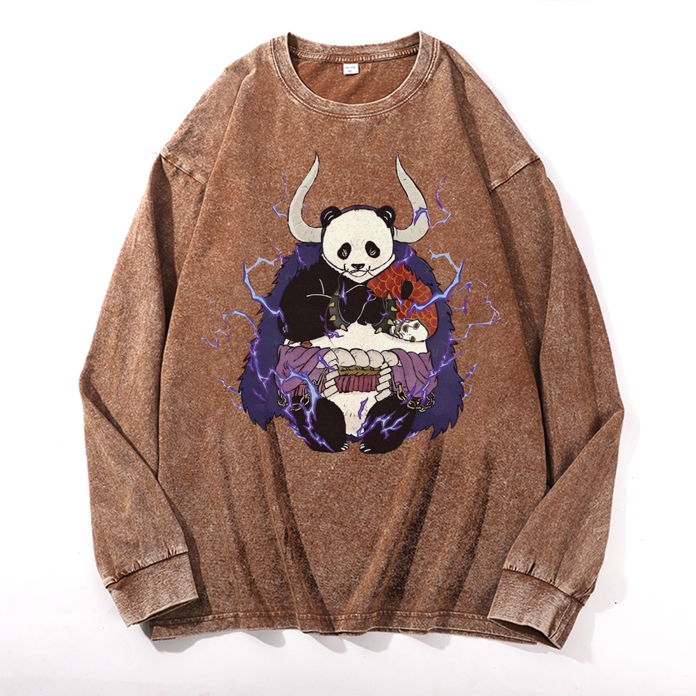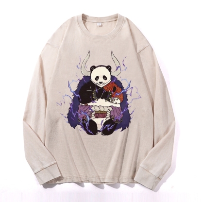 Panda Demon Pattern Deep Washed Vintage Long Sleeves T-Shirt