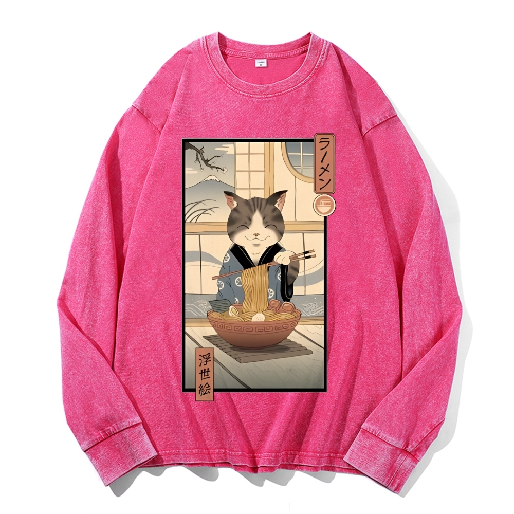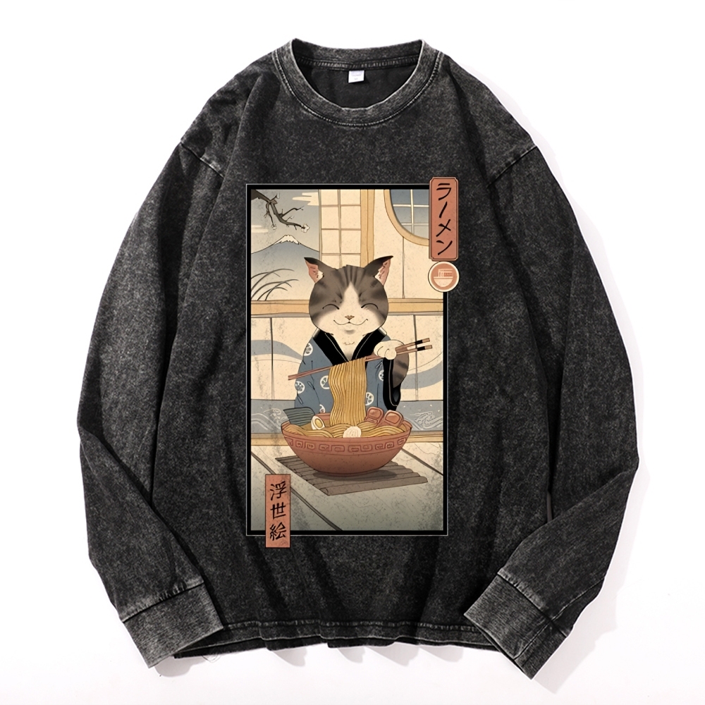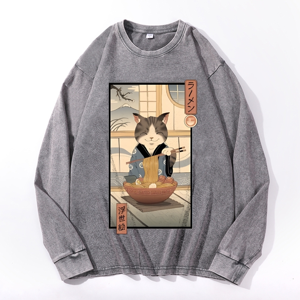 Ramen Cat Pattern Deep Washed Vintage Long Sleeves T-Shirt