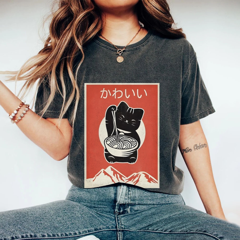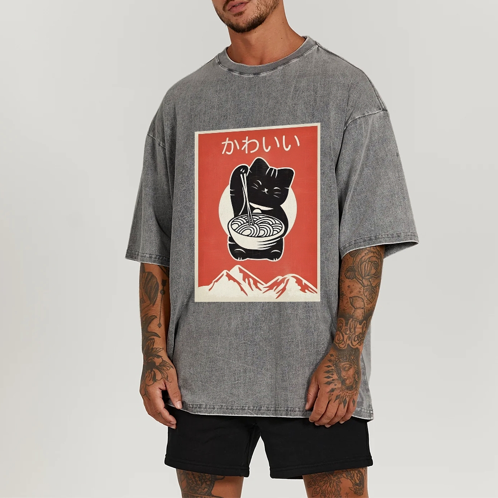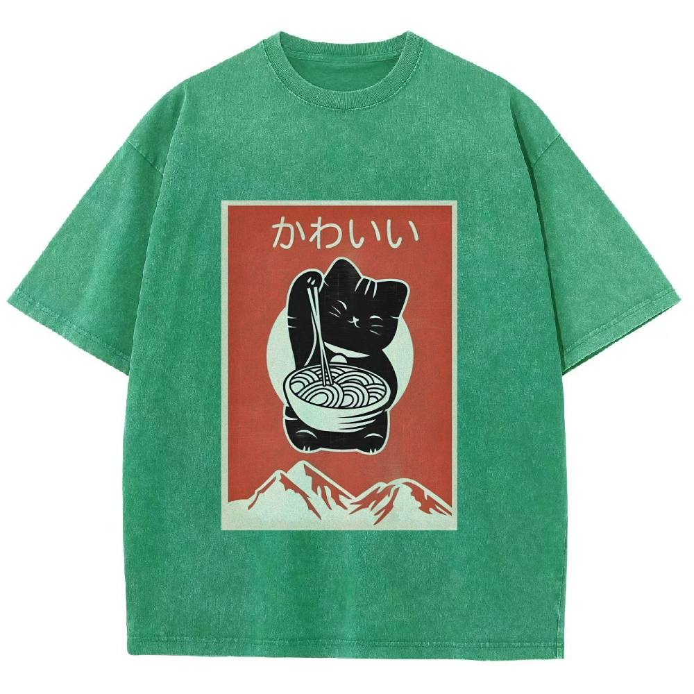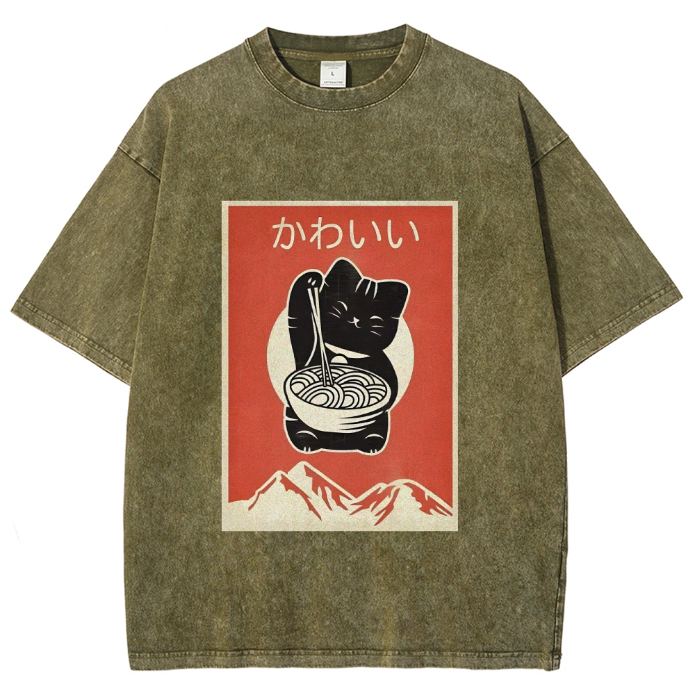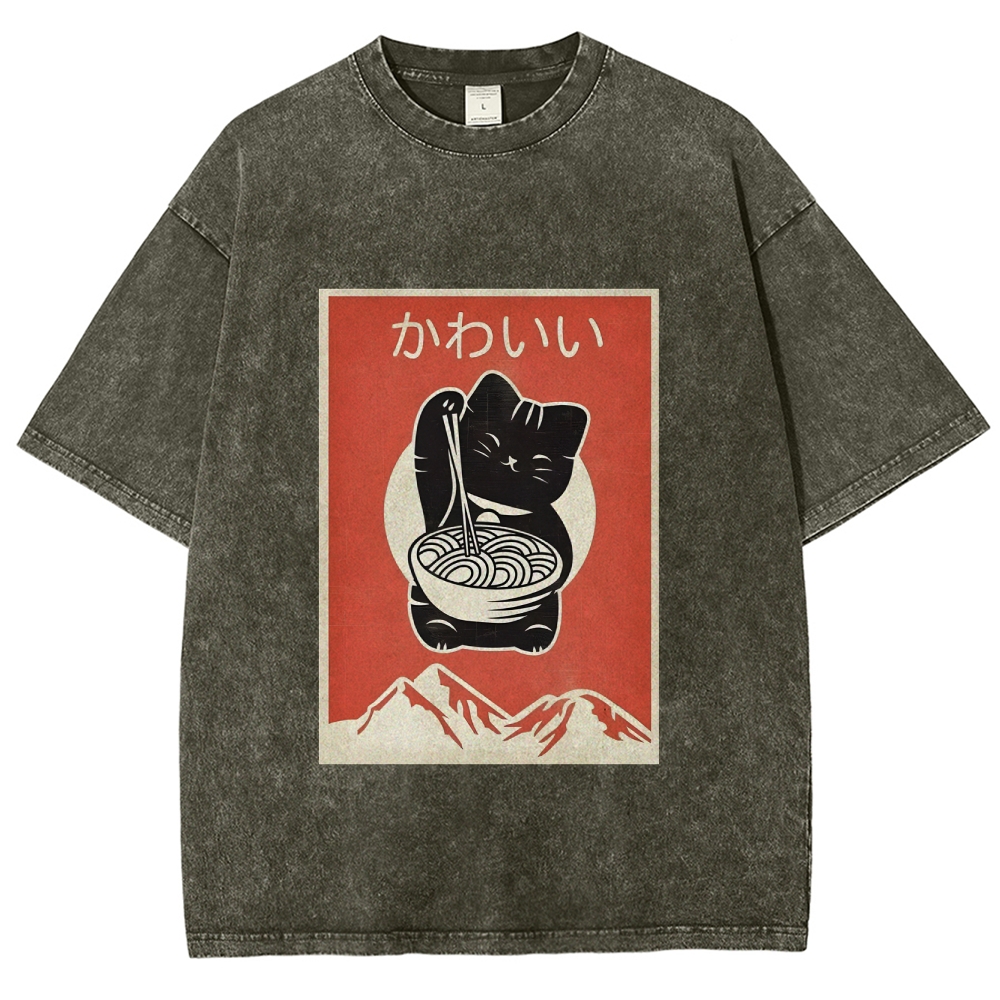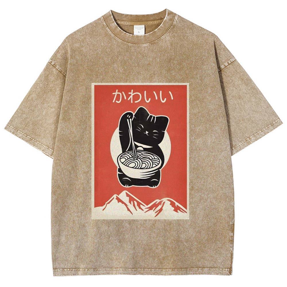 Ramen Cat Washed Vintage Short Sleeves T-Shirt